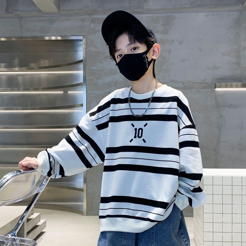 봄과 가을 어린이 패션 둥근 목 줄무늬 스웨터 소년의 잘 생긴 느슨한 캐주얼 긴 소매 풀오버 탑 원피스 티셔츠스토어 가기