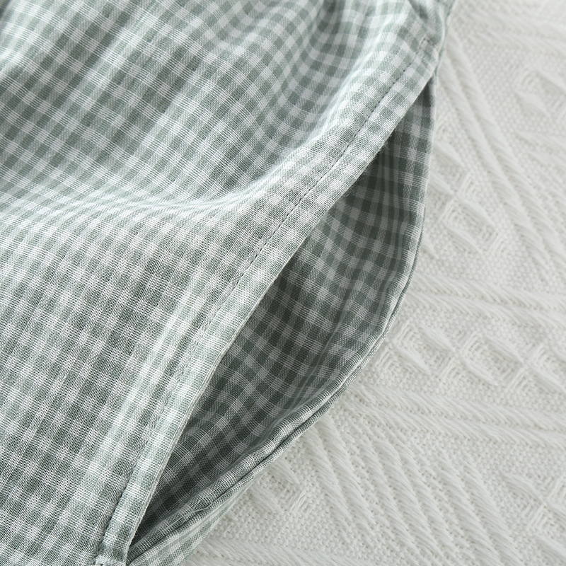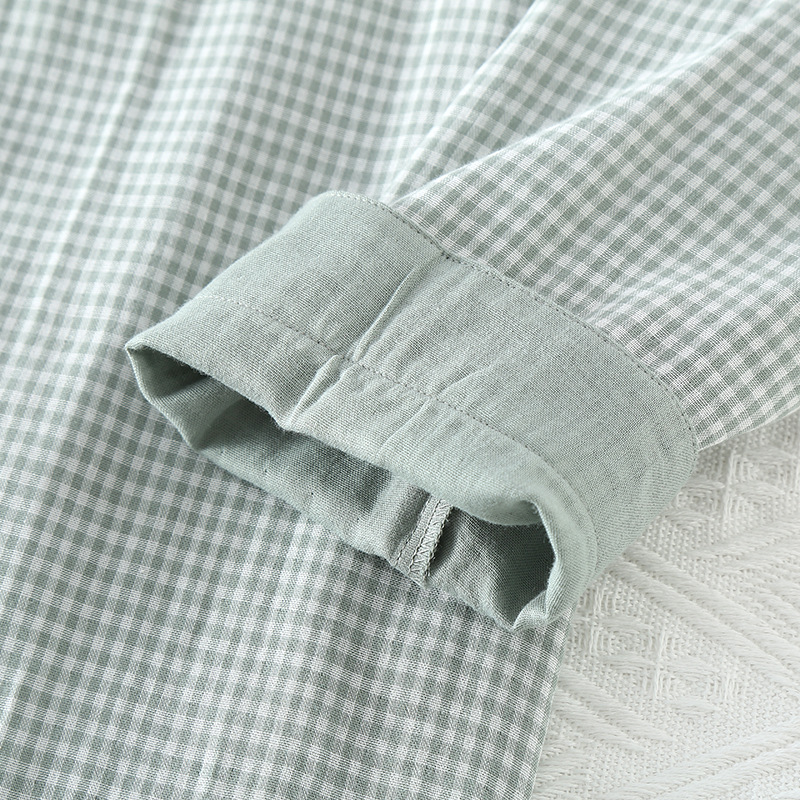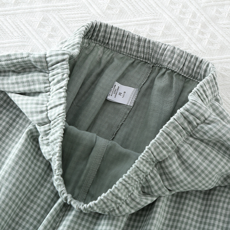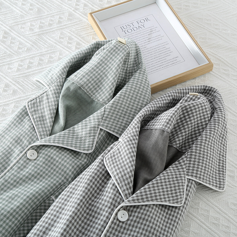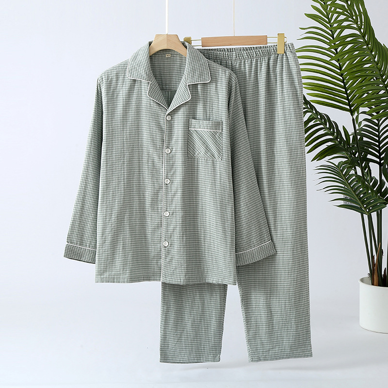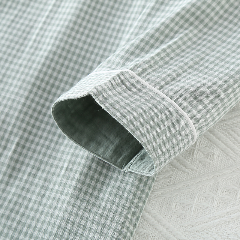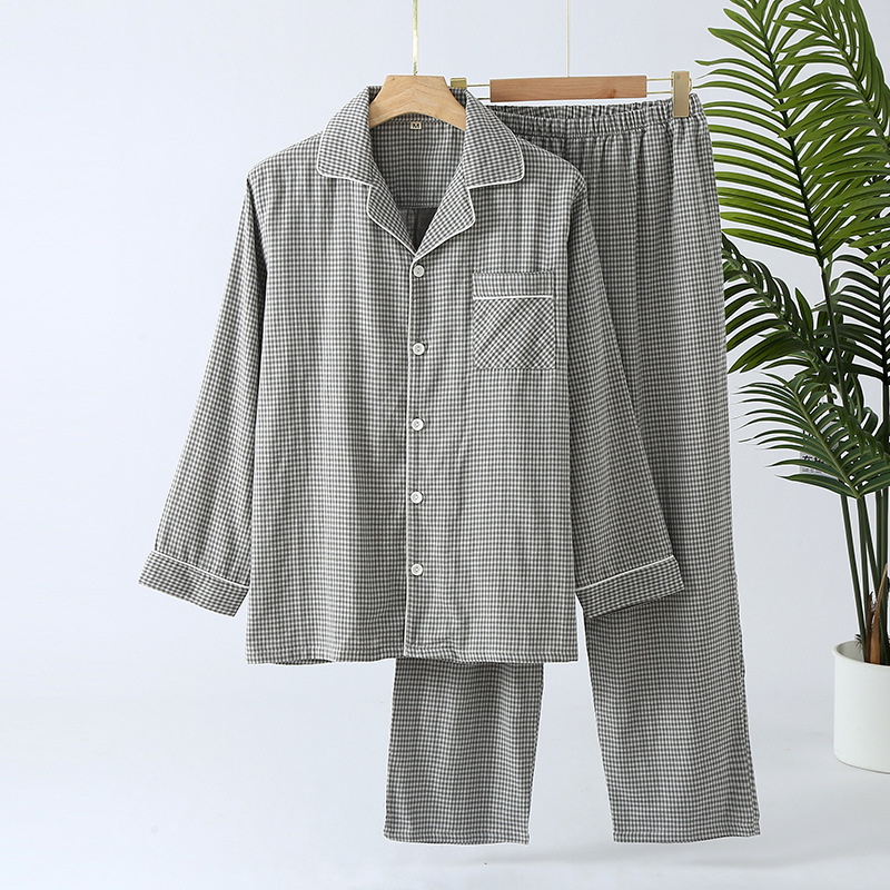 일본 무인쇄 스타일 봄, 가을, 여름 순면 더블 레이어 거즈 남성 잠옷 얇은 긴팔 격자 무늬 가정 의류 공장 도매스토어 가기
