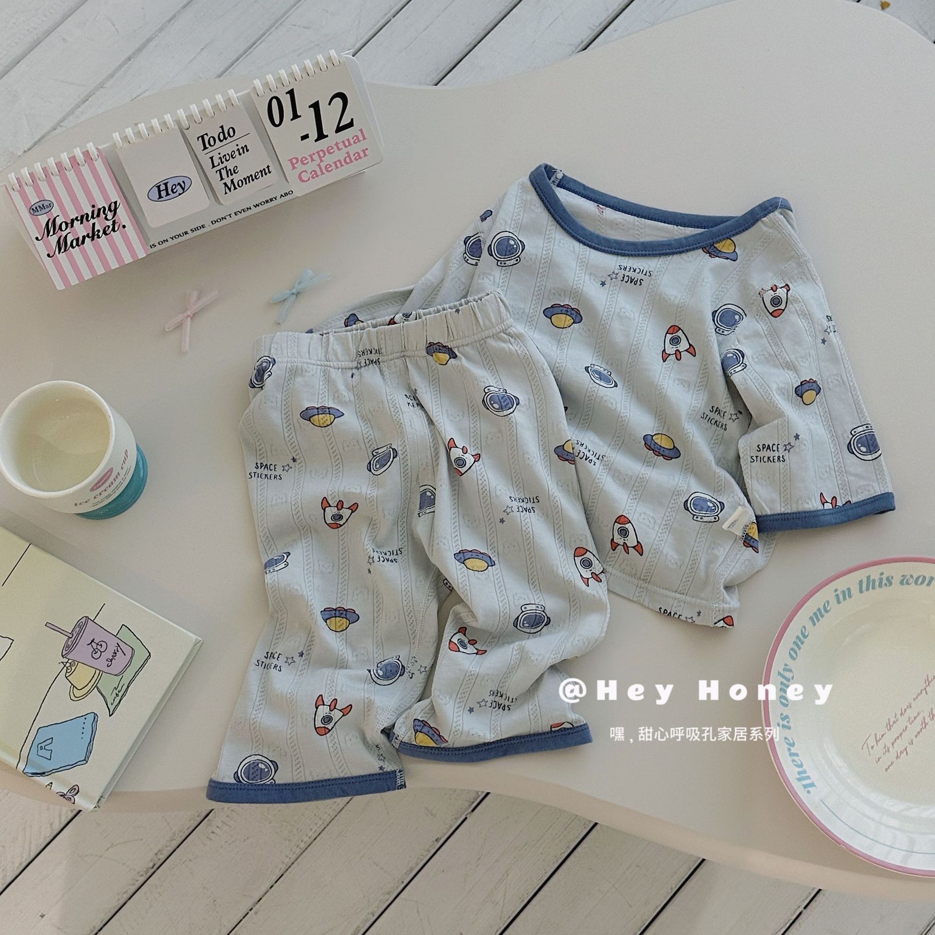 대형 및 소형 사이즈 HeyHoney 아동용 여름 7부 소매 만화 캐릭터 투피스 세트 홈웨어 잠옷 부드러운 소재스토어 가기