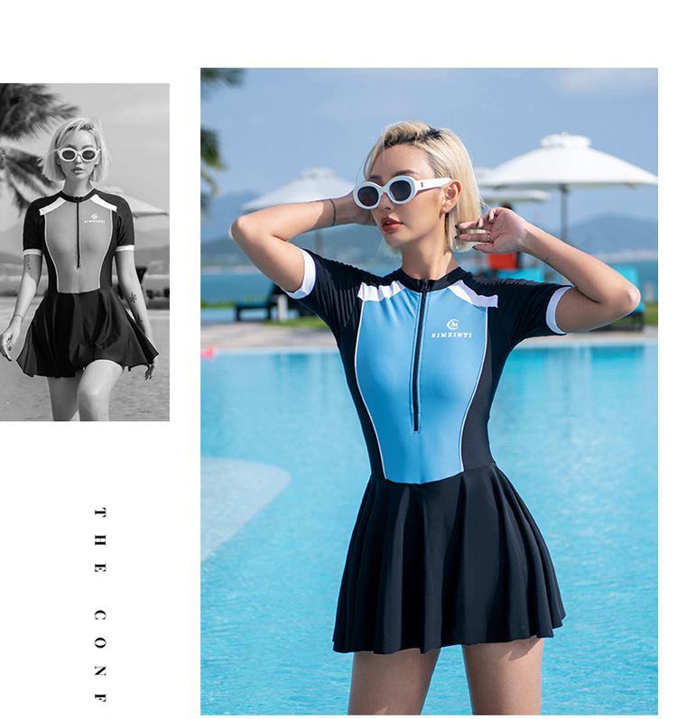 새로운 원피스 스커트 수영복 여성용 배꼽 슬리밍 섹시 작은 가슴 반소매 온천 수영복