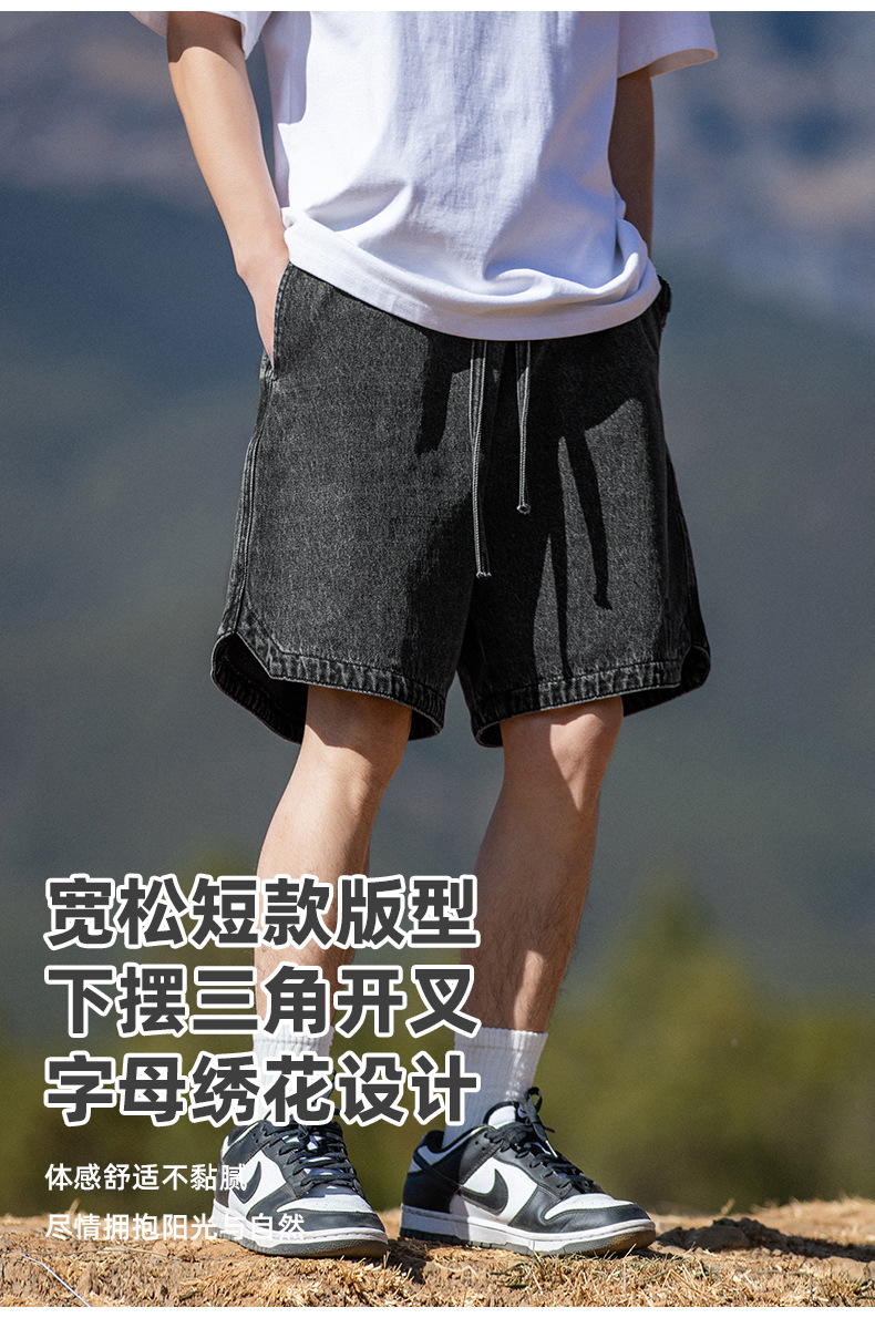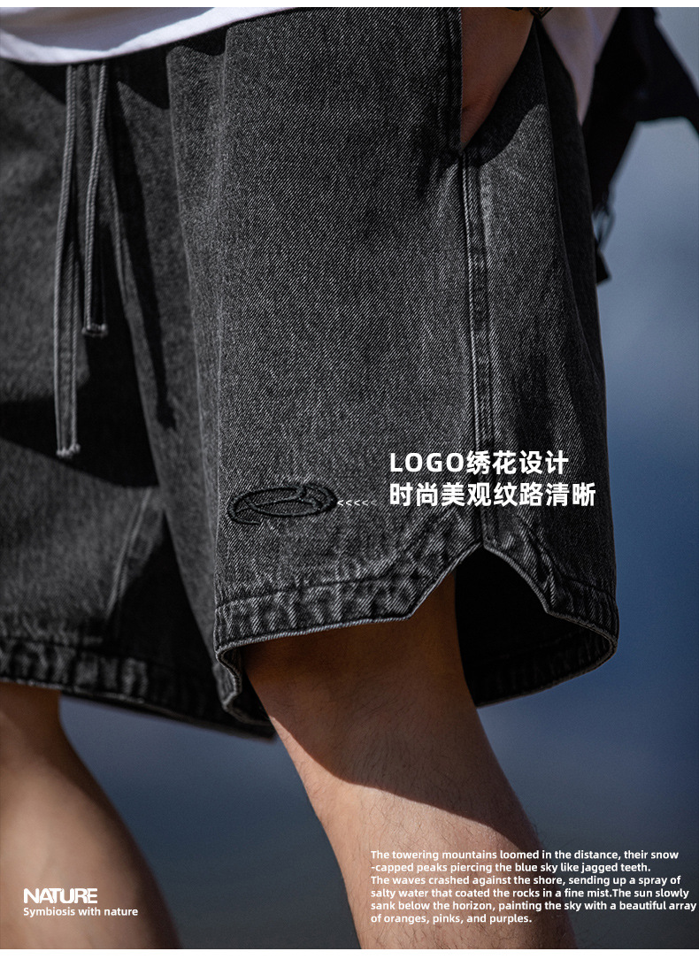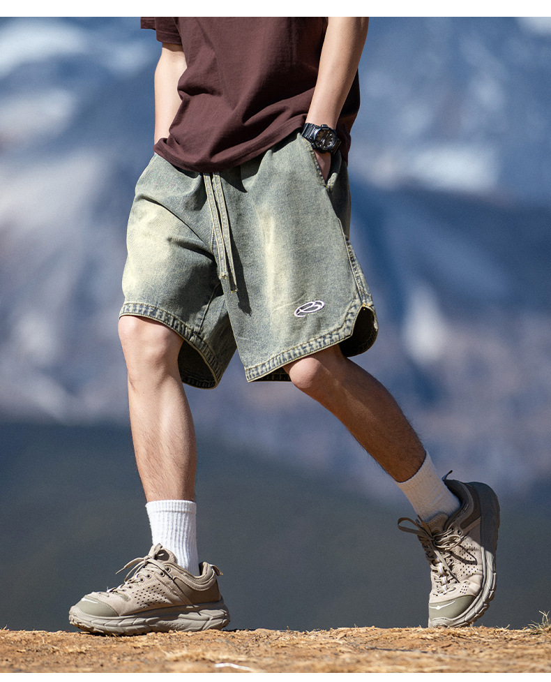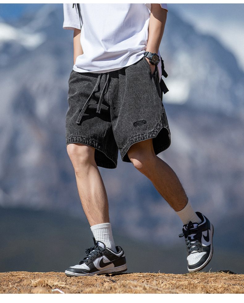 고민 씻은 작업복 데님 반바지 남성 여름 새로운 패션 브랜드 자수 일본 캐주얼 느슨한 드로 스트링 반바지