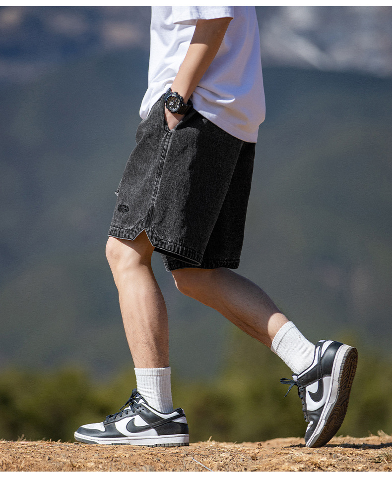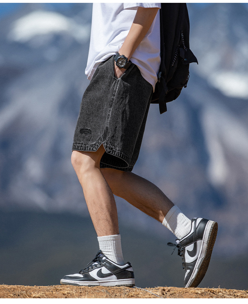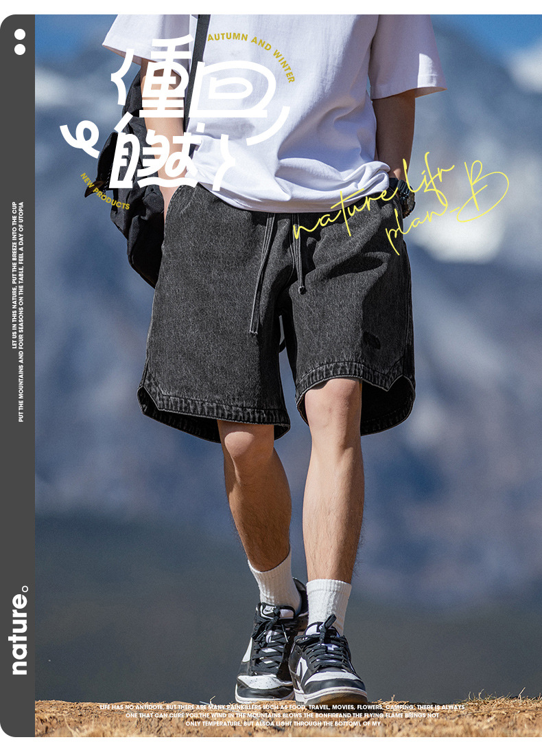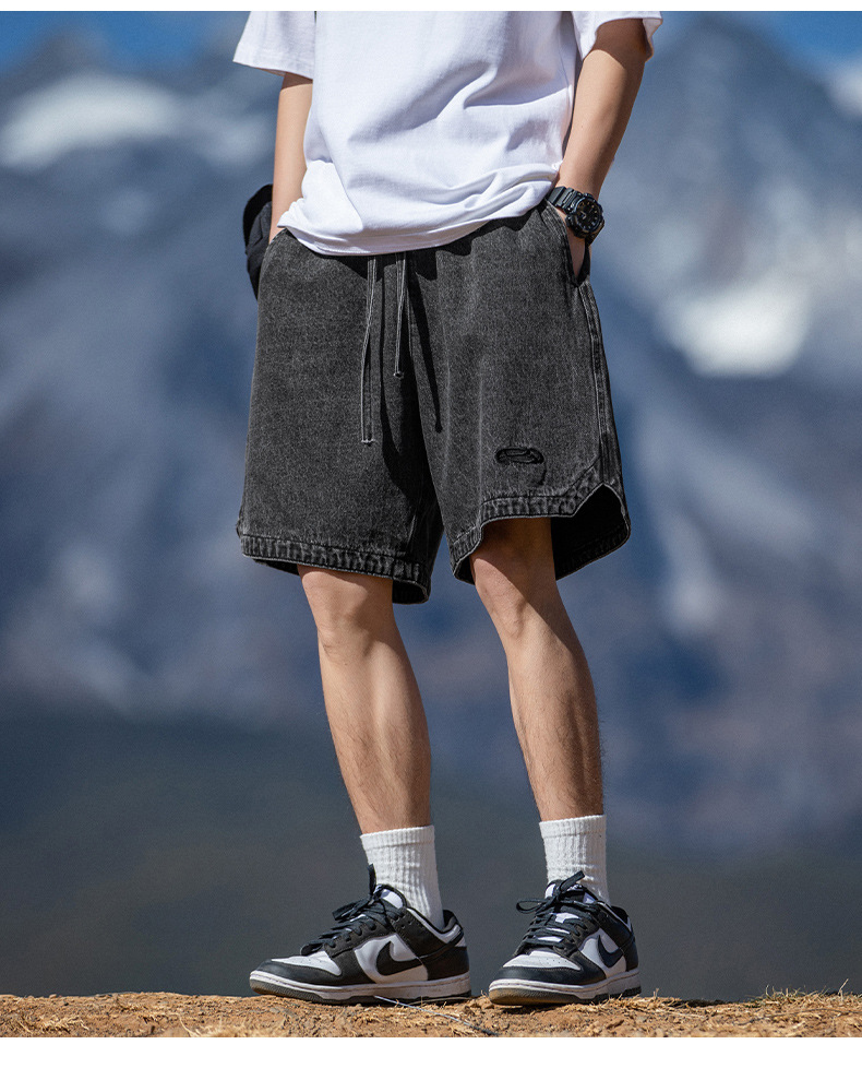 고민 씻은 작업복 데님 반바지 남성 여름 새로운 패션 브랜드 자수 일본 캐주얼 느슨한 드로 스트링 반바지