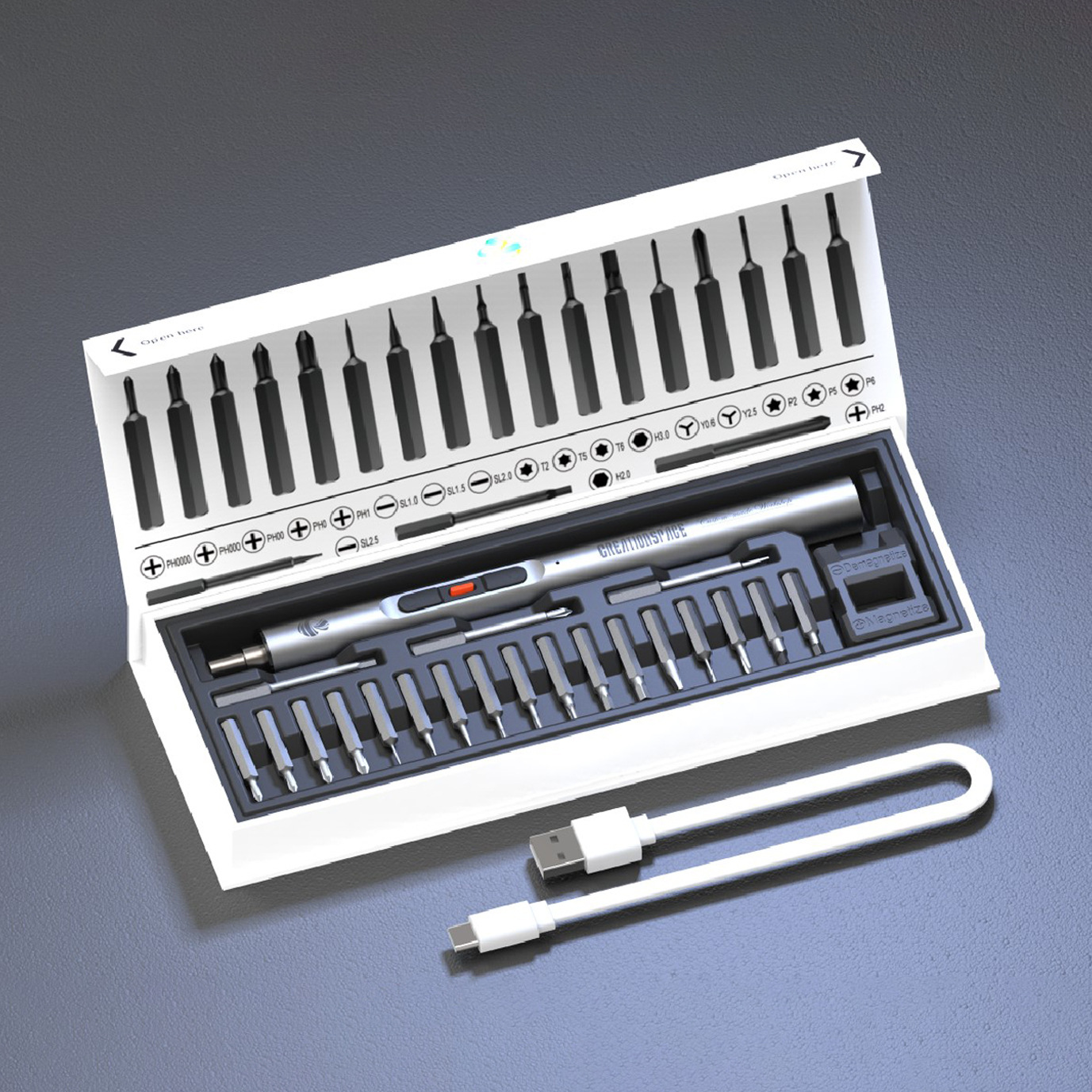 1个螺丝刀手柄|20枚批头|1个加磁器|1条充电线