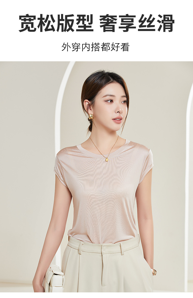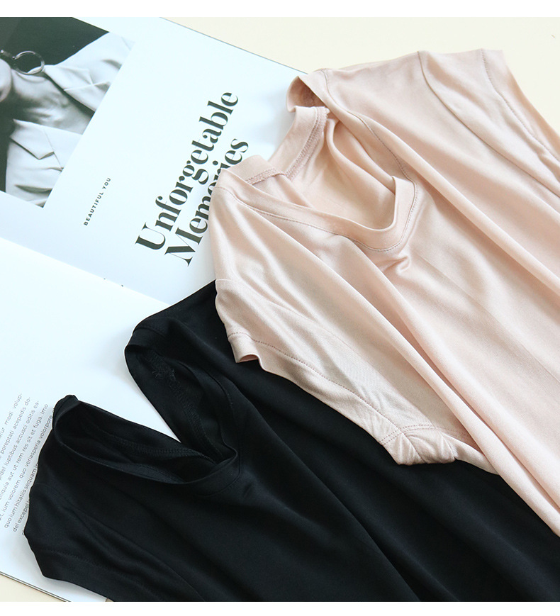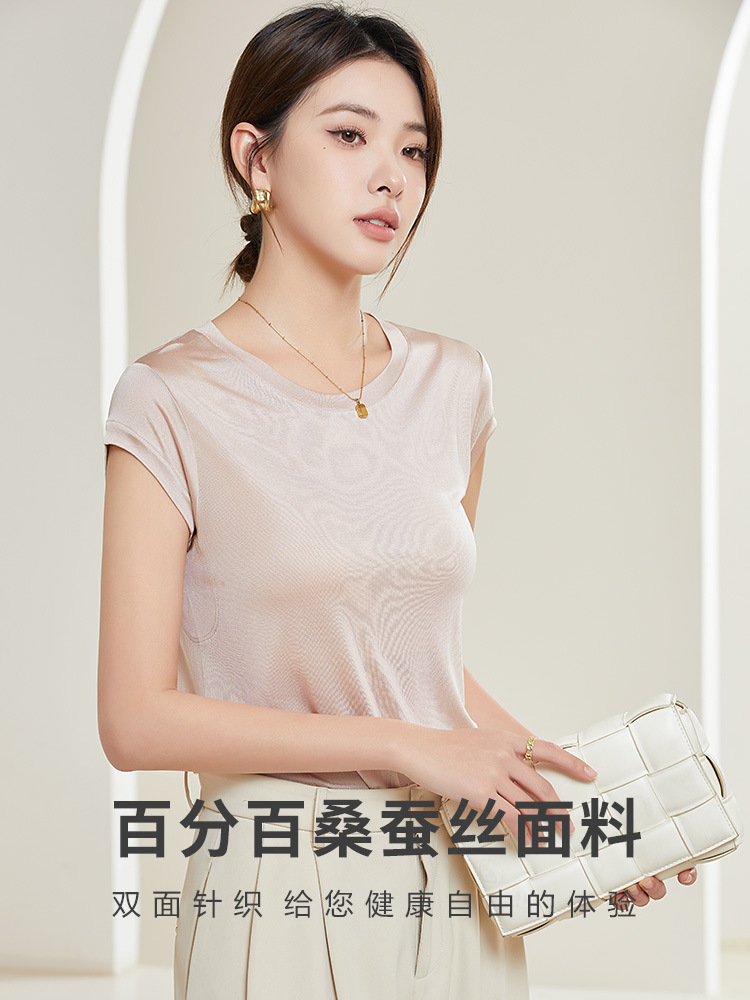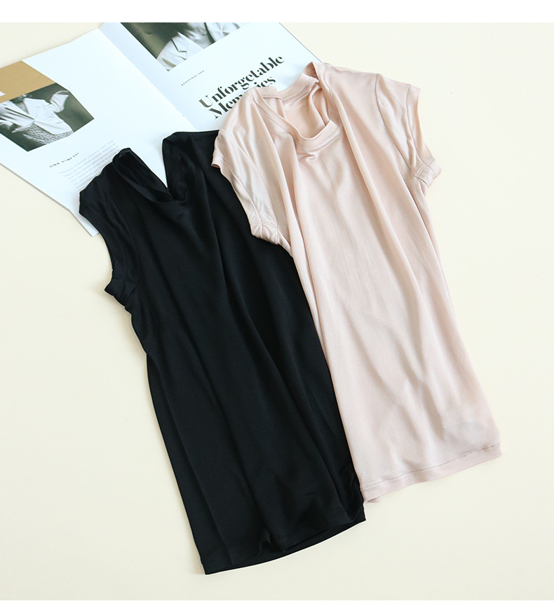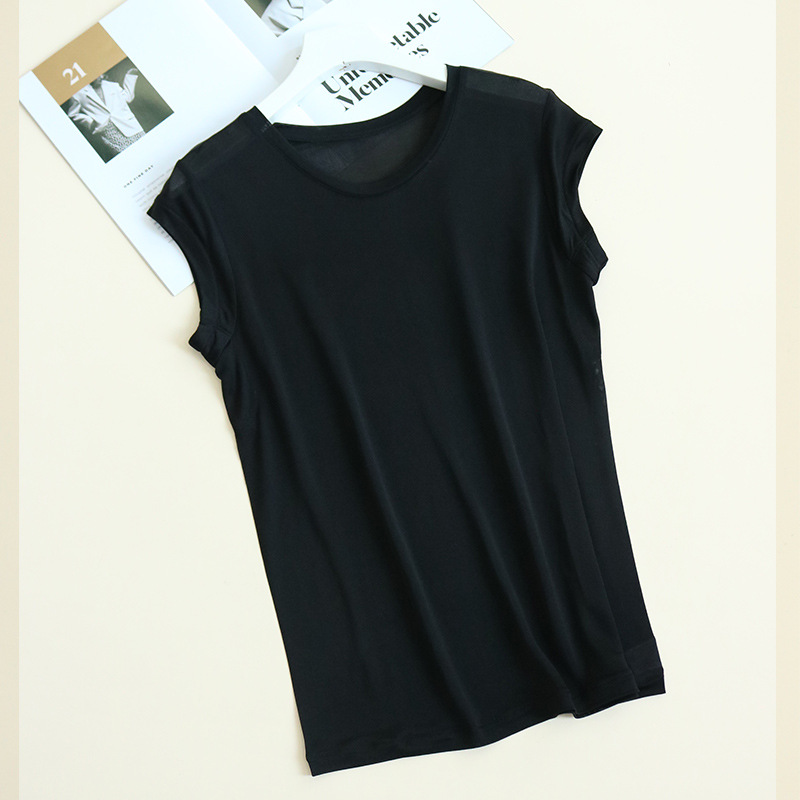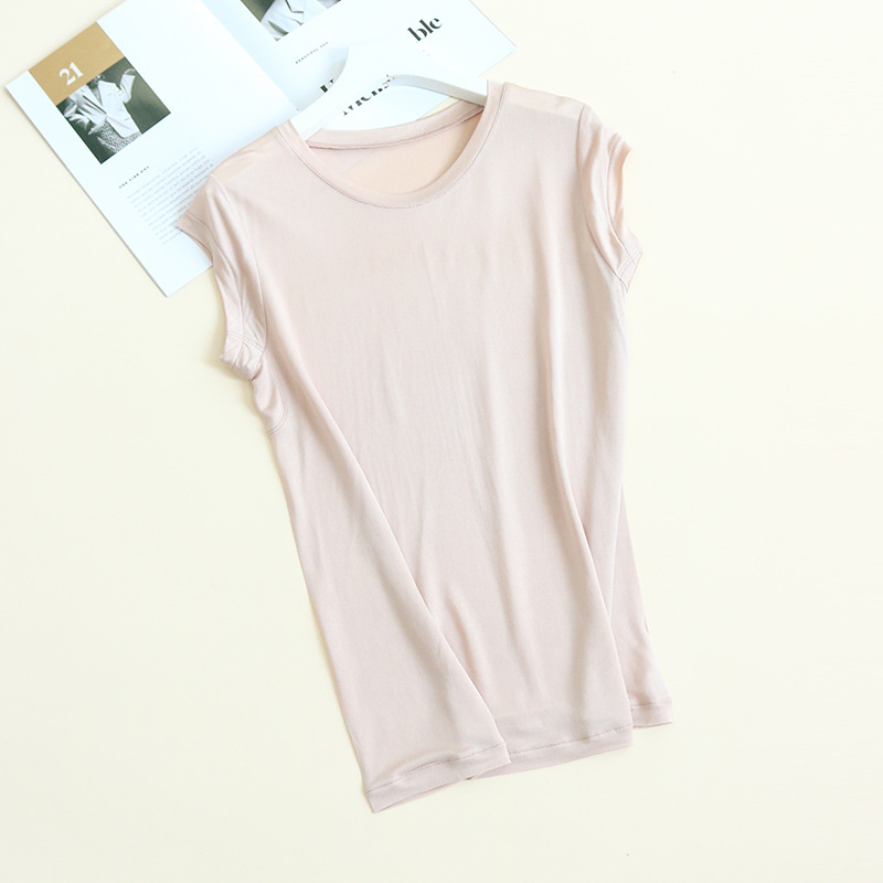 Tangge 봄/여름 실크 원슬리브 바닥 셔츠 여성 홈 착용 뽕나무 실크 둥근 목 반팔 티셔츠 겨드랑이 땀 흡수 층