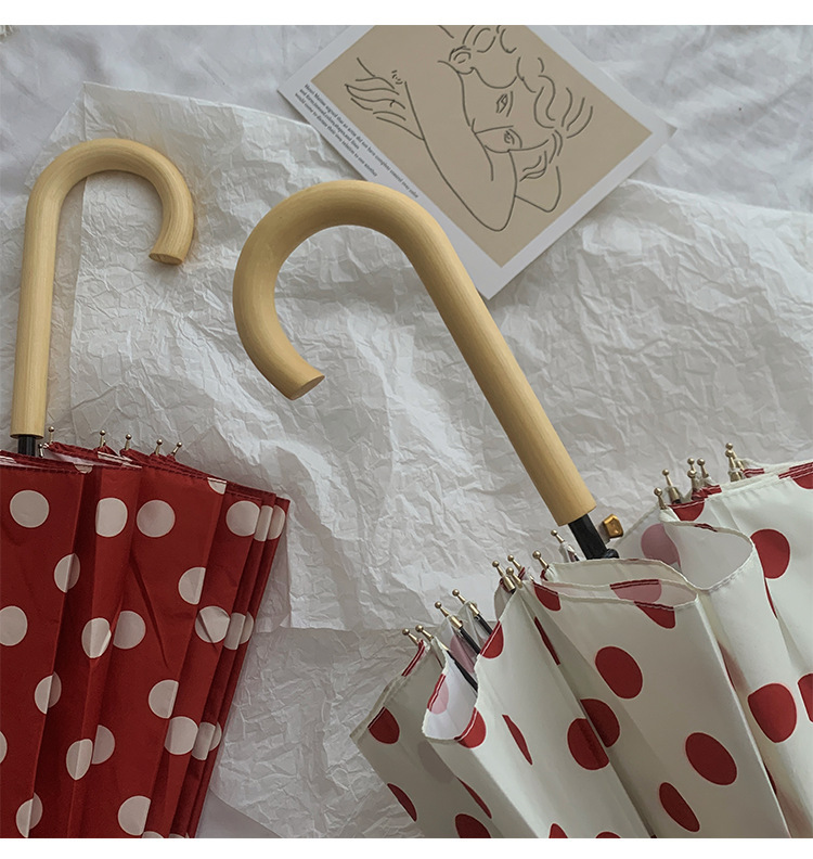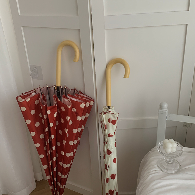 • 카라멜 도트 무늬 호두나무 손잡이 16K 롱 핸들 우산