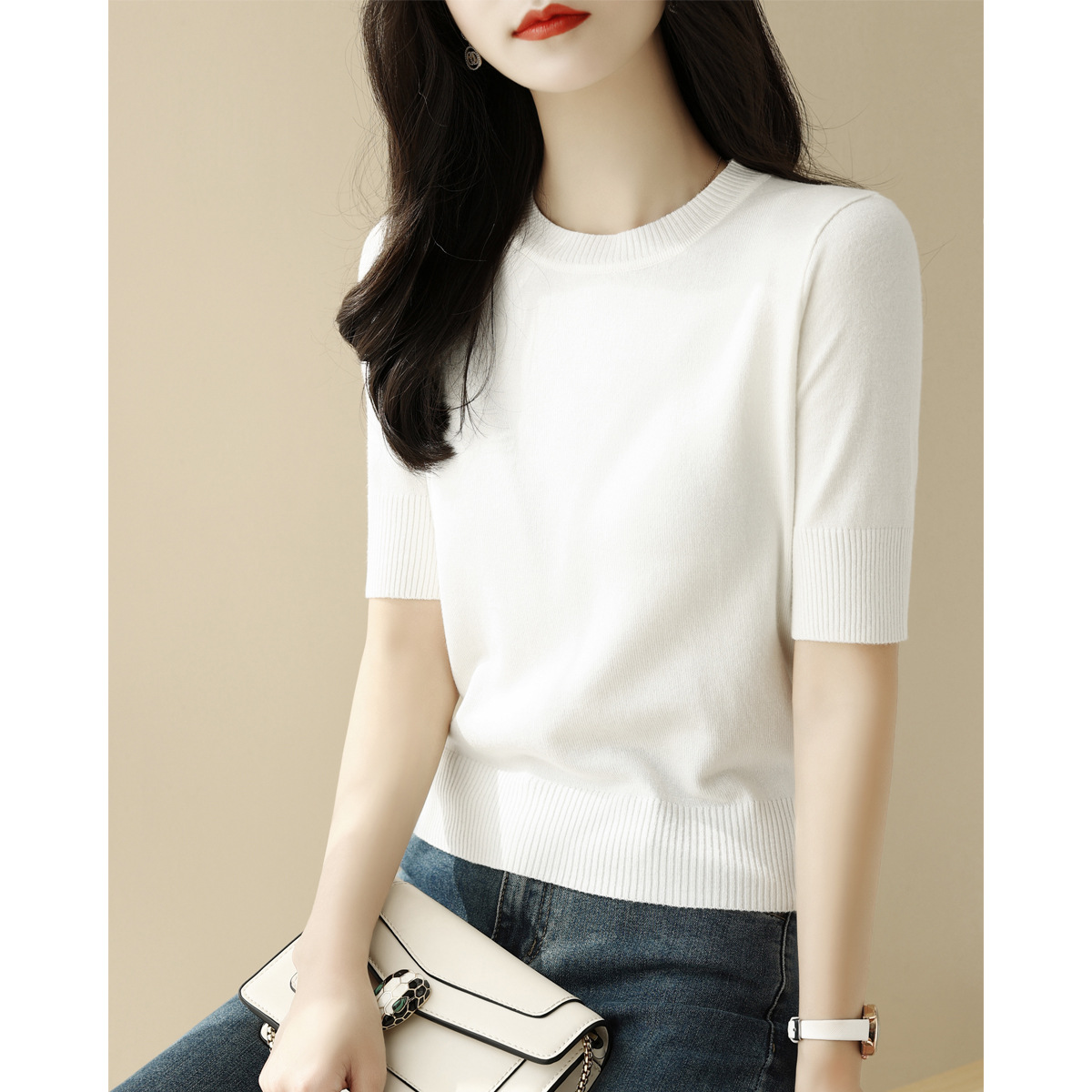 여름 화이트 착용 짧은 반 높은 둥근 목 느슨한 슬리밍 짧은 소매 티셔츠 니트웨어 여성의 새로운 바닥 탑