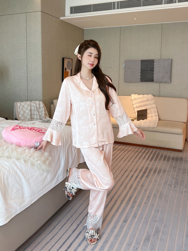 [DeLuna의 눈물] 새로운 잠옷 여성 2024 요정 스타일 레이스 프랑스 홈 착용 긴팔 바지 아이스 실크