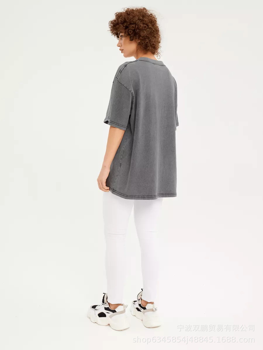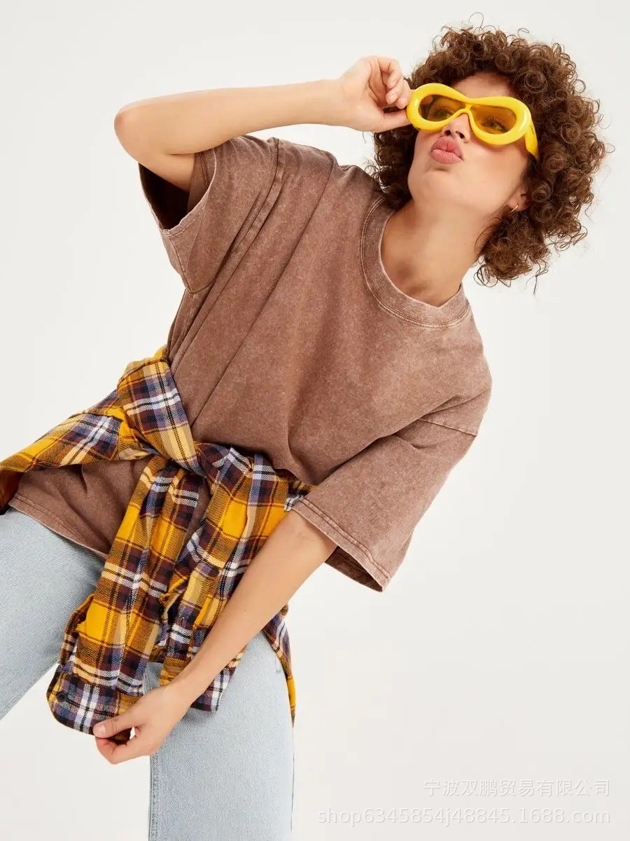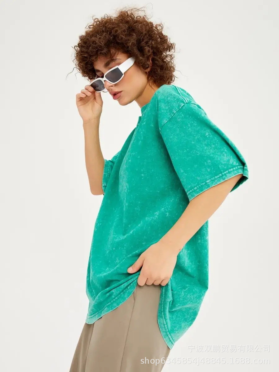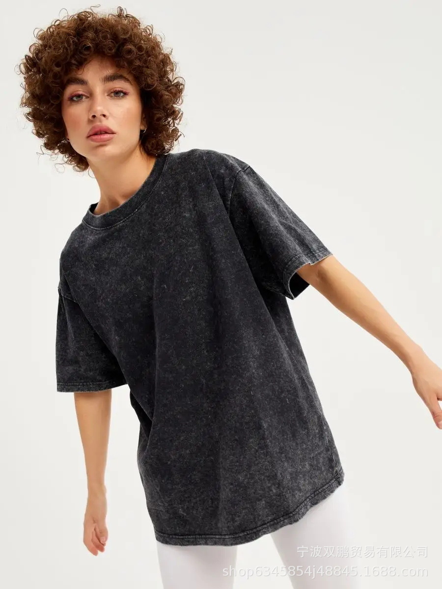 2025 봄과 여름 새로운 솔리드 컬러 티셔츠 여성 씻어 오래된 바틱 탑 국경 유럽과 미국의 뜨거운 판매 순수 코튼 반팔스토어 가기