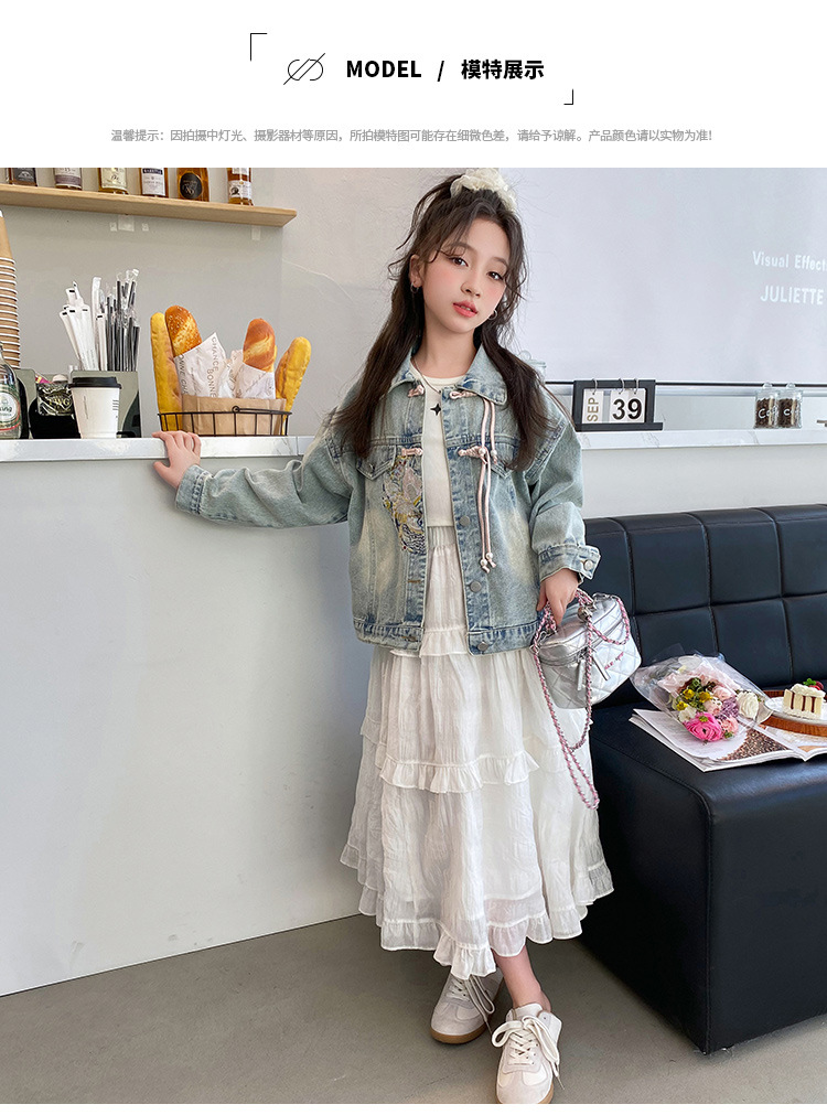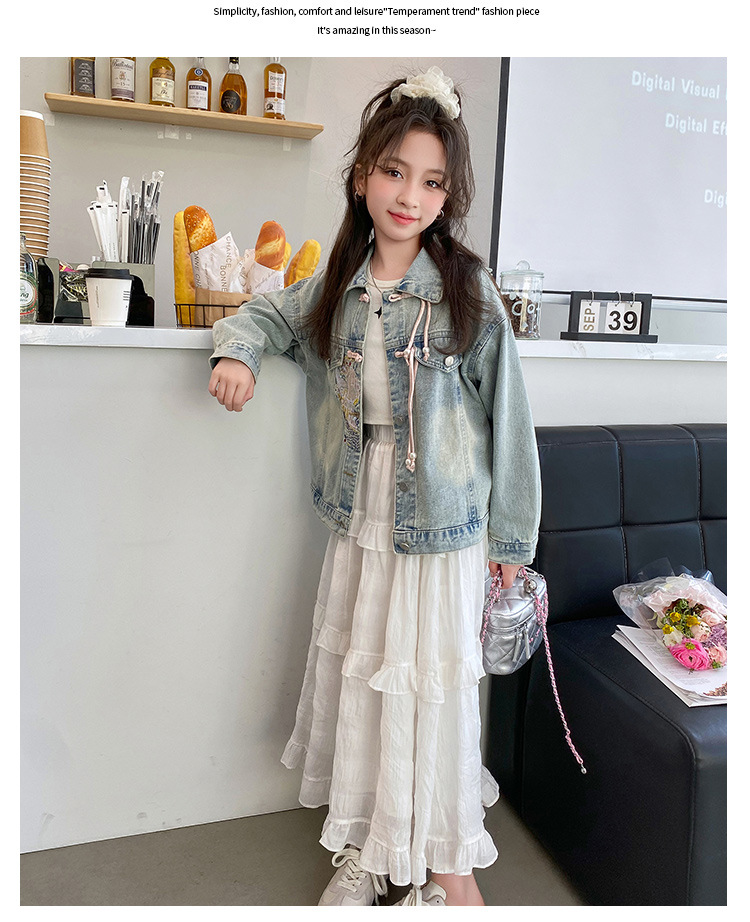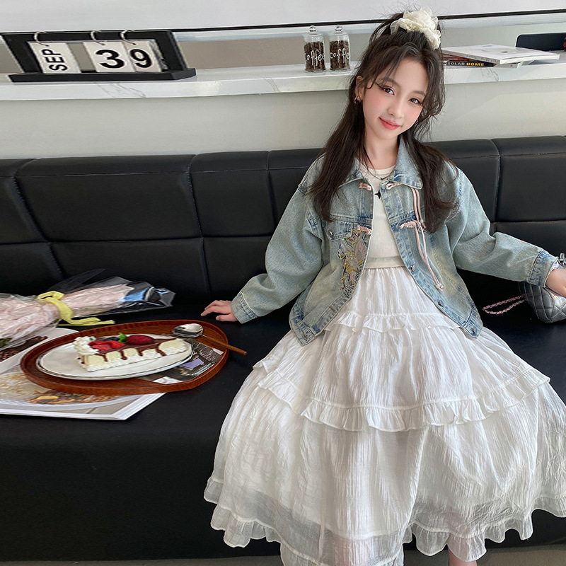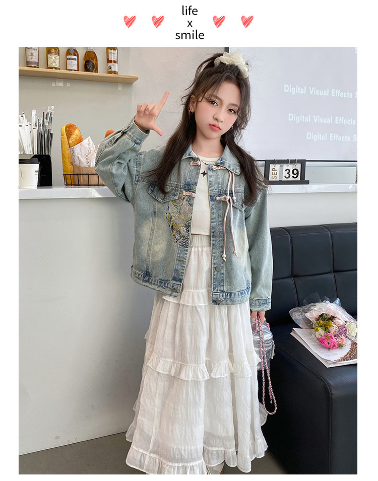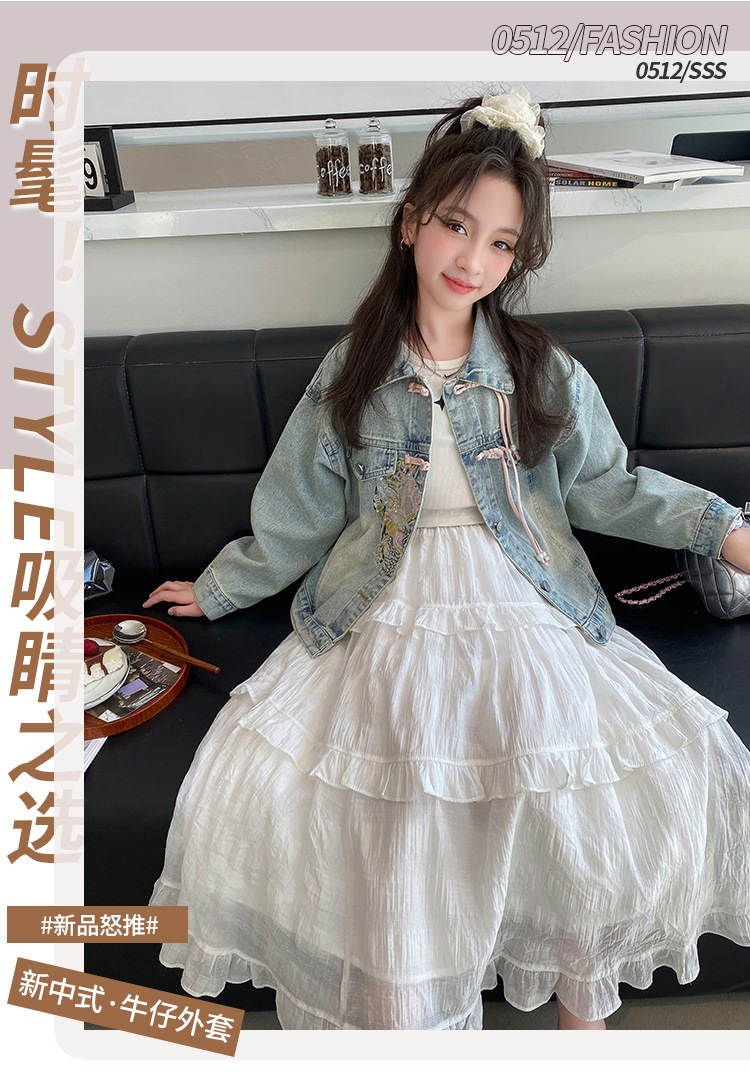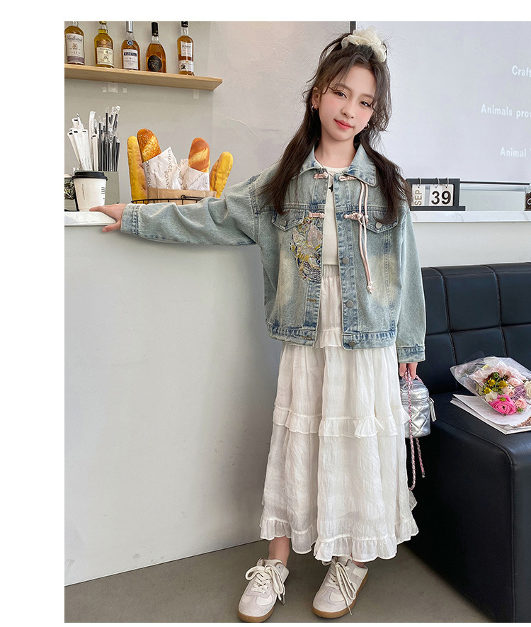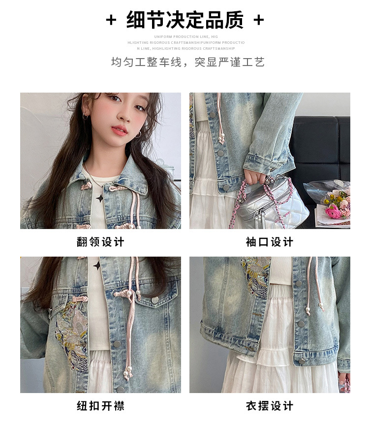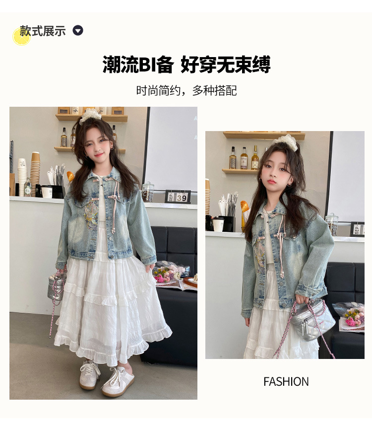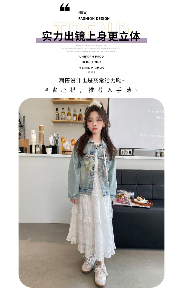 새로운 중국 스타일의 중국 스타일 버클 데님 코트 소녀의 봄과 가을 2024 새로운 자수 당나라 세트 어린 소녀 재킷 패션스토어 가기