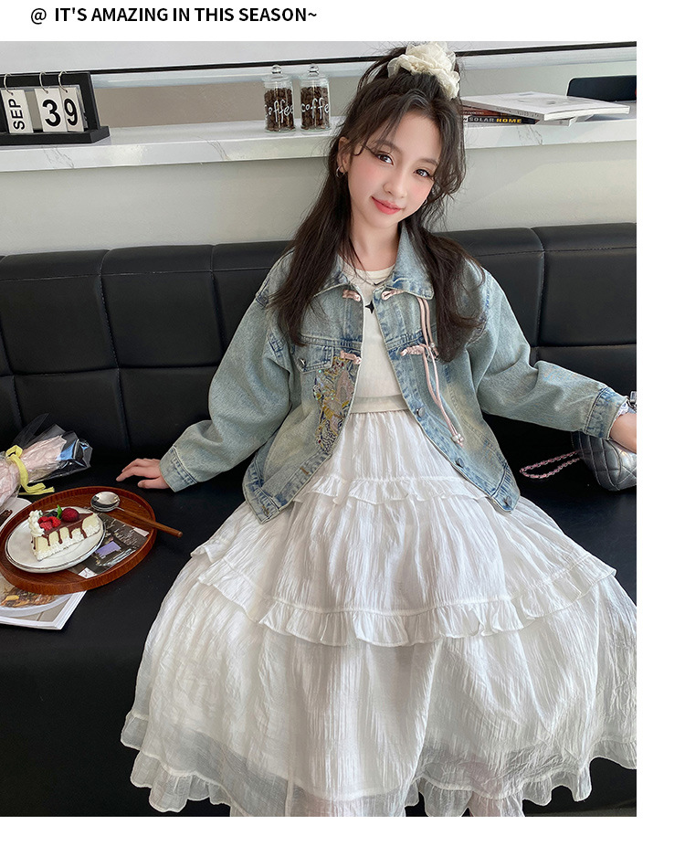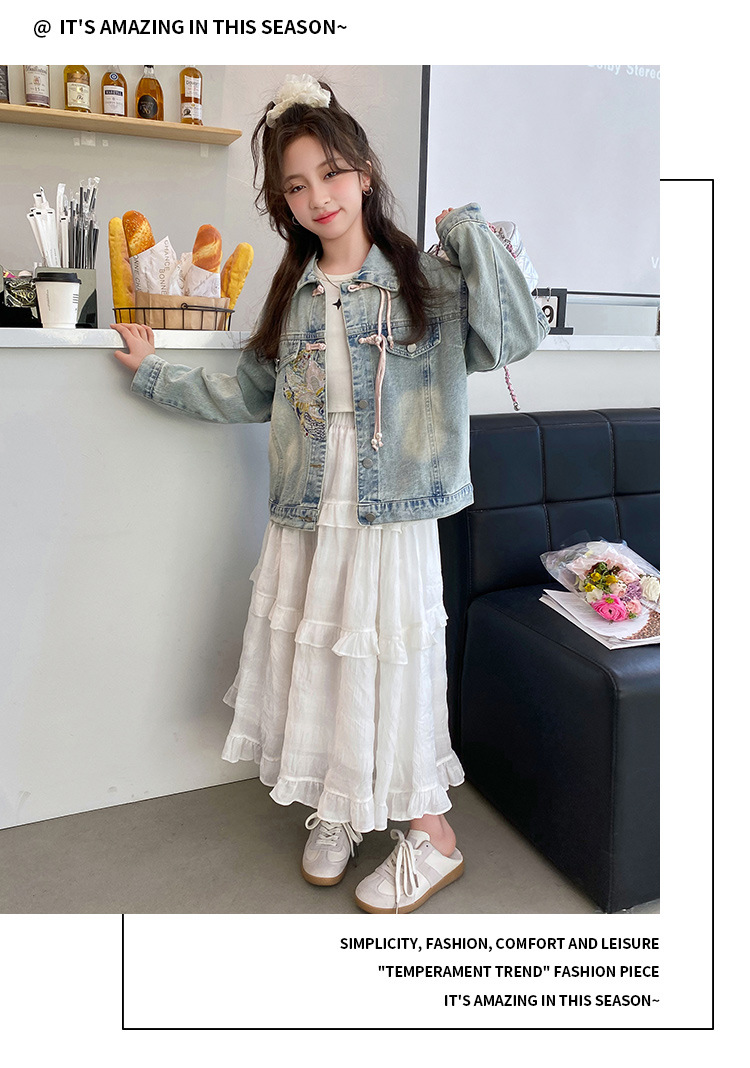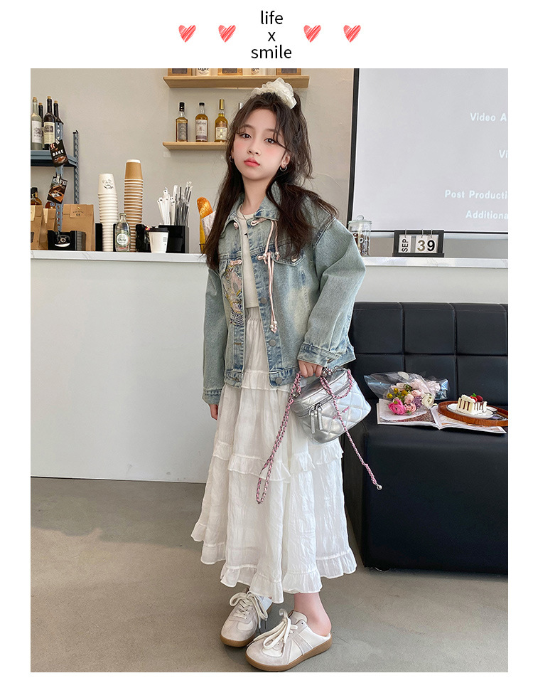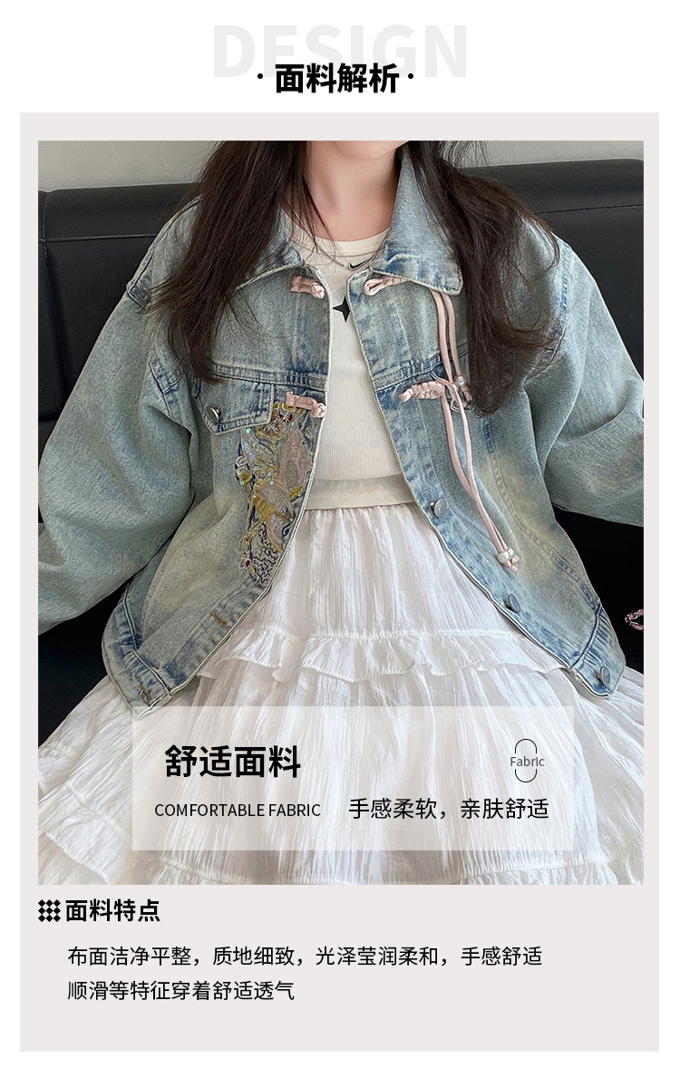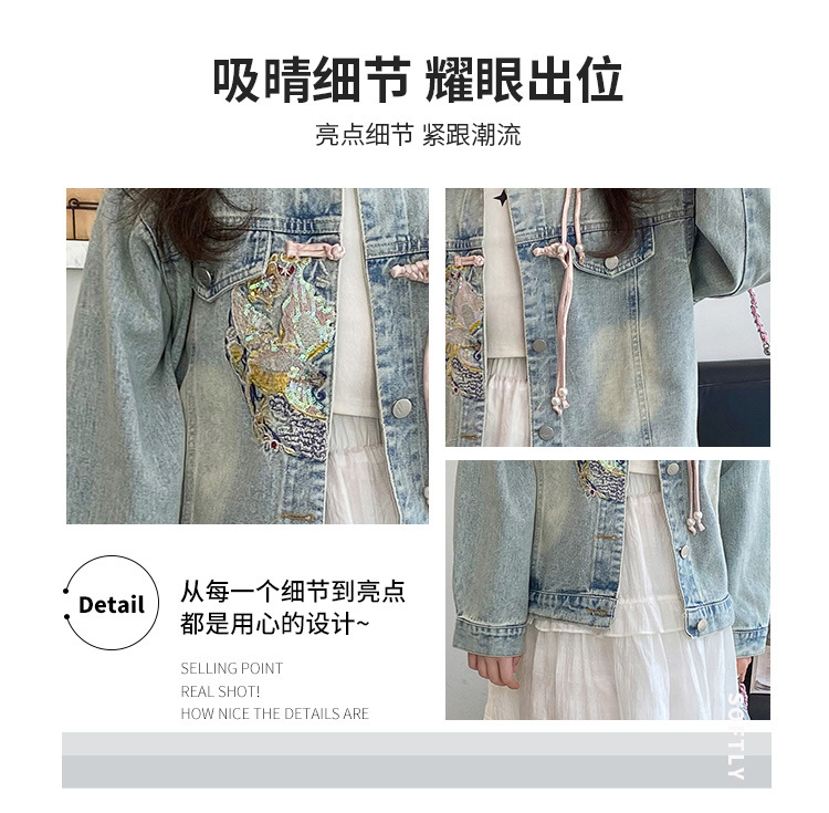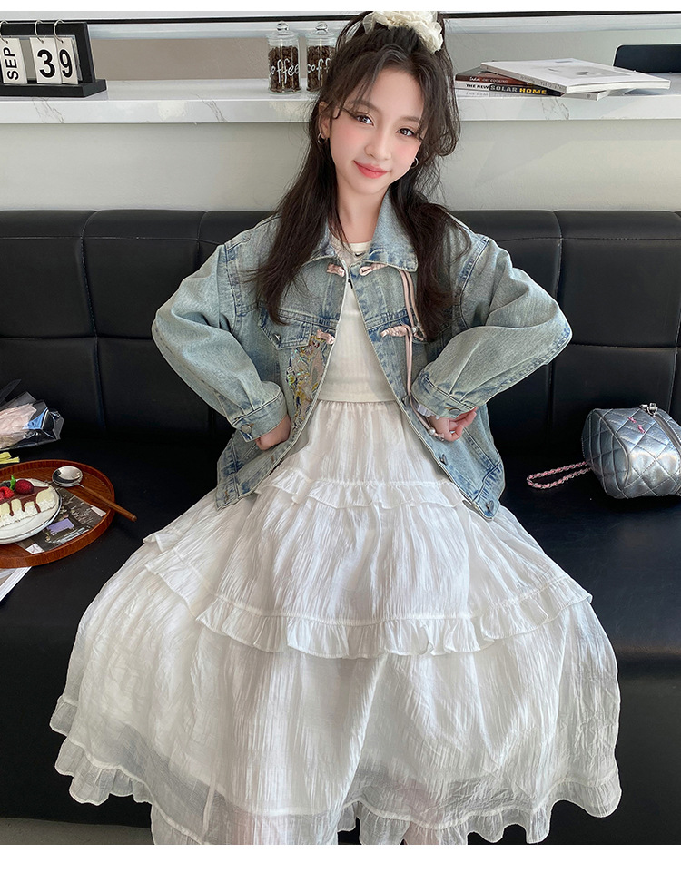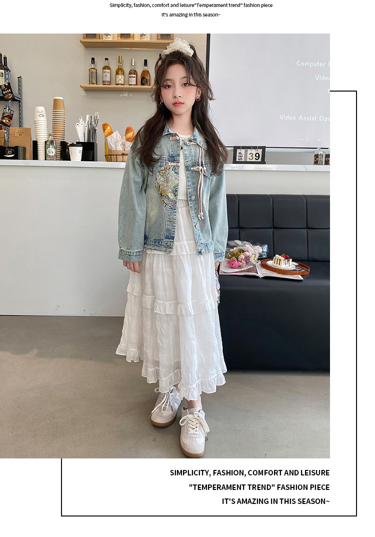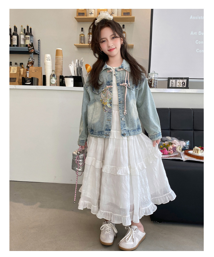 새로운 중국 스타일의 중국 스타일 버클 데님 코트 소녀의 봄과 가을 2024 새로운 자수 당나라 세트 어린 소녀 재킷 패션스토어 가기
