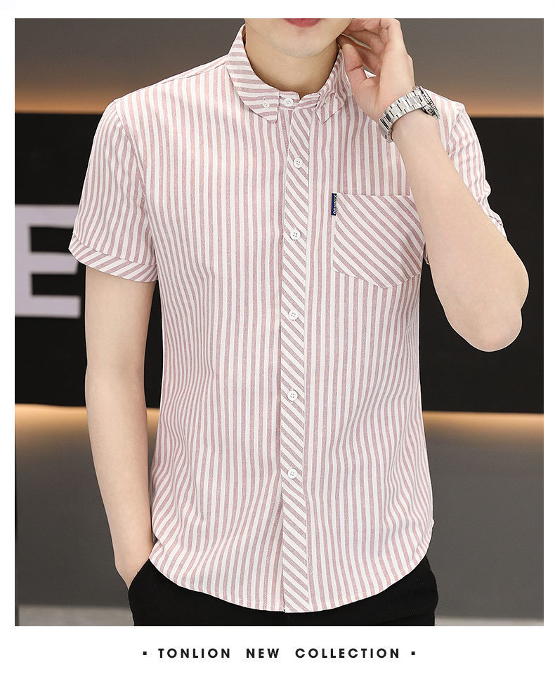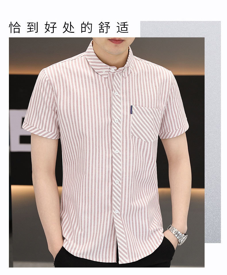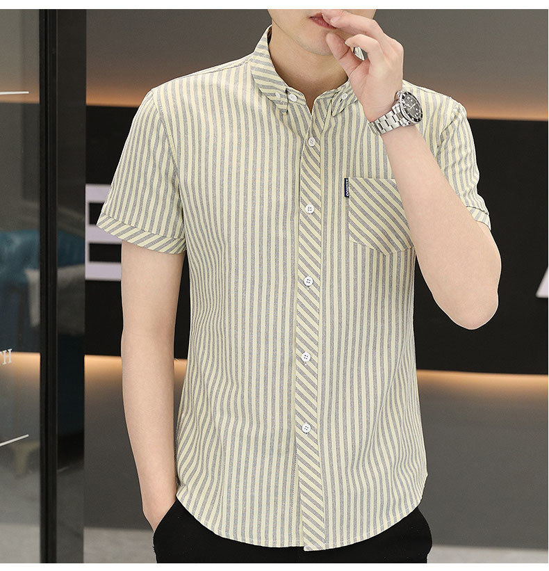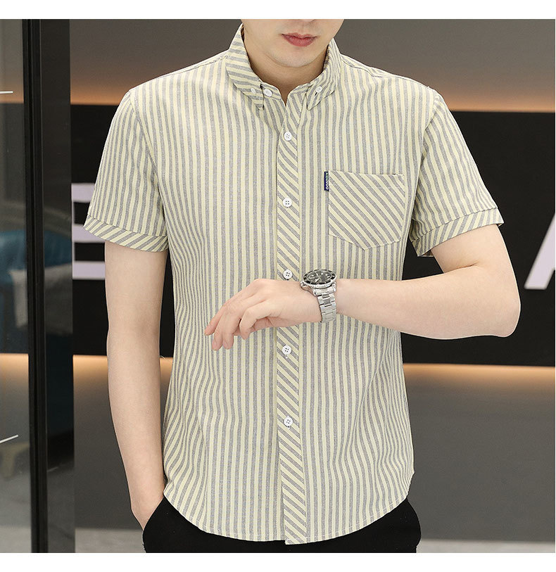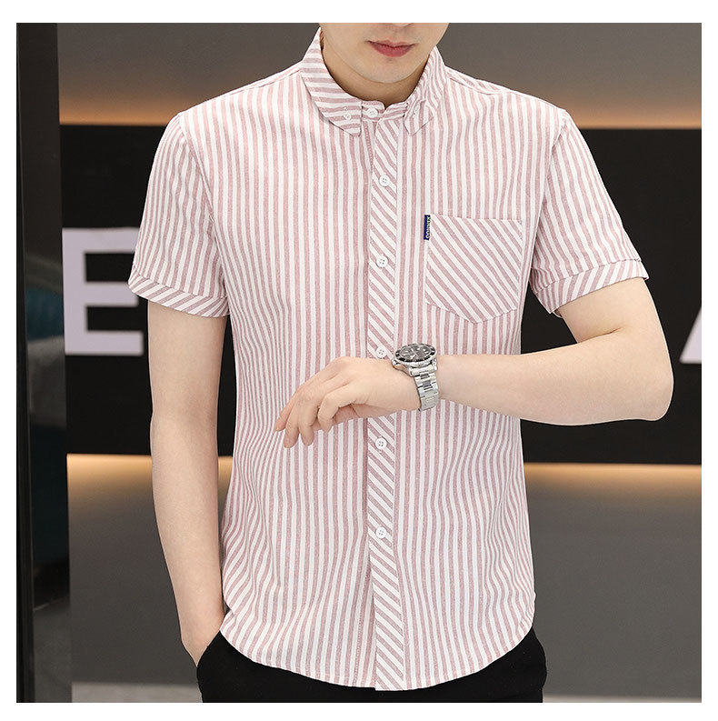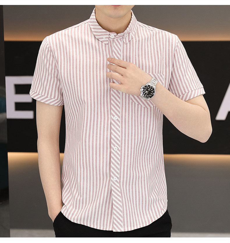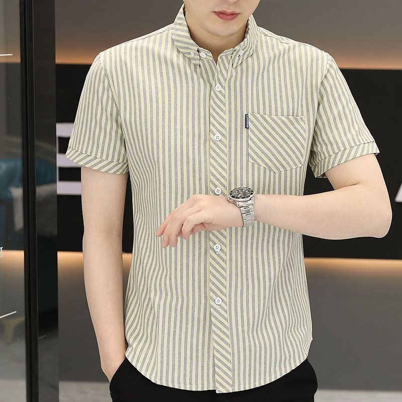 여름 남성 반팔 셔츠 비즈니스 캐주얼 청소년 잘 생긴 스트라이프 셔츠 한국식 슬림 핏 포켓 탑 의류 패션스토어 가기