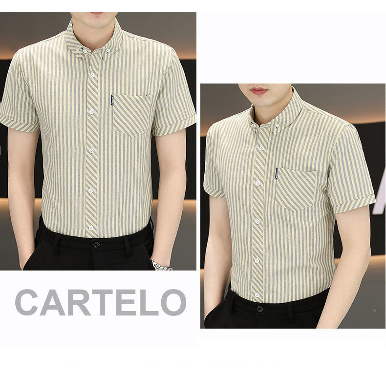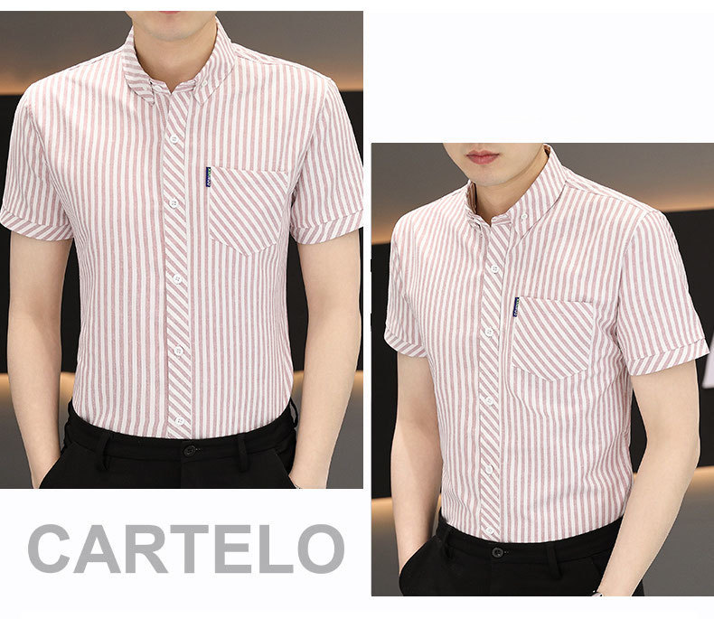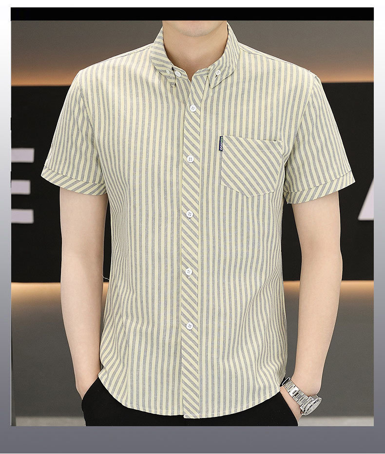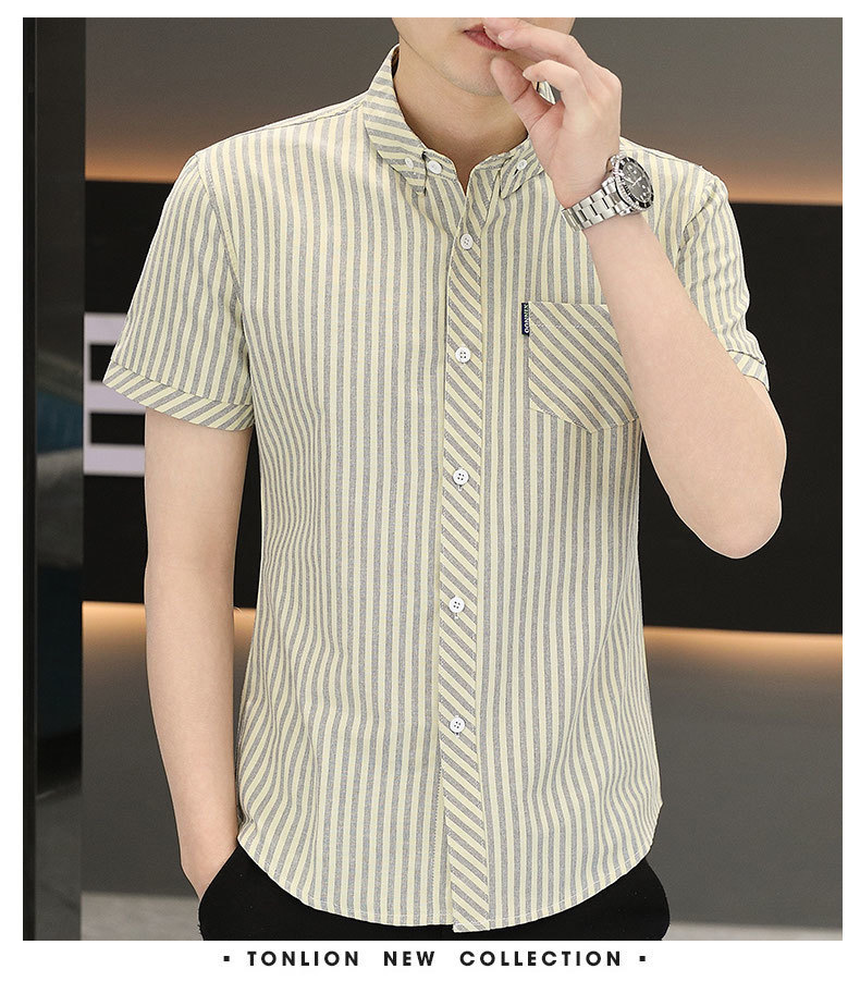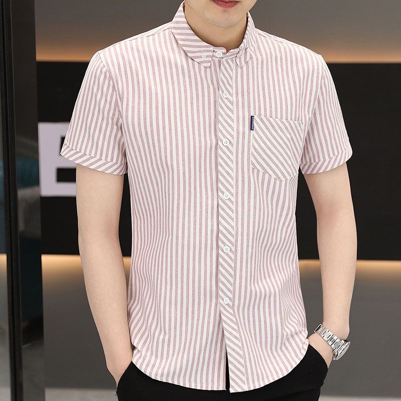여름 남성 반팔 셔츠 비즈니스 캐주얼 청소년 잘 생긴 스트라이프 셔츠 한국식 슬림 핏 포켓 탑 의류 패션