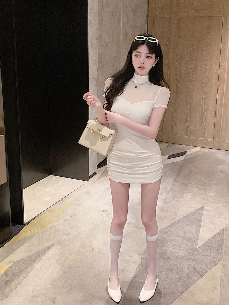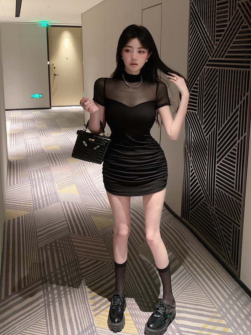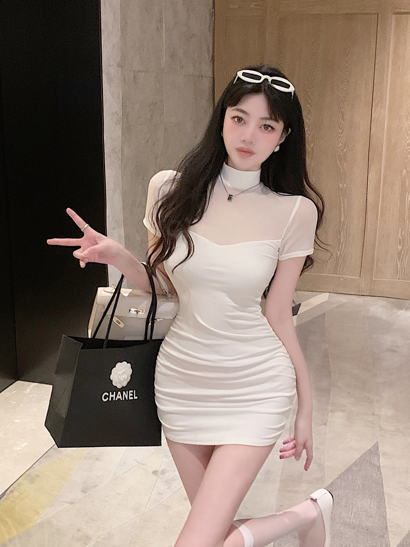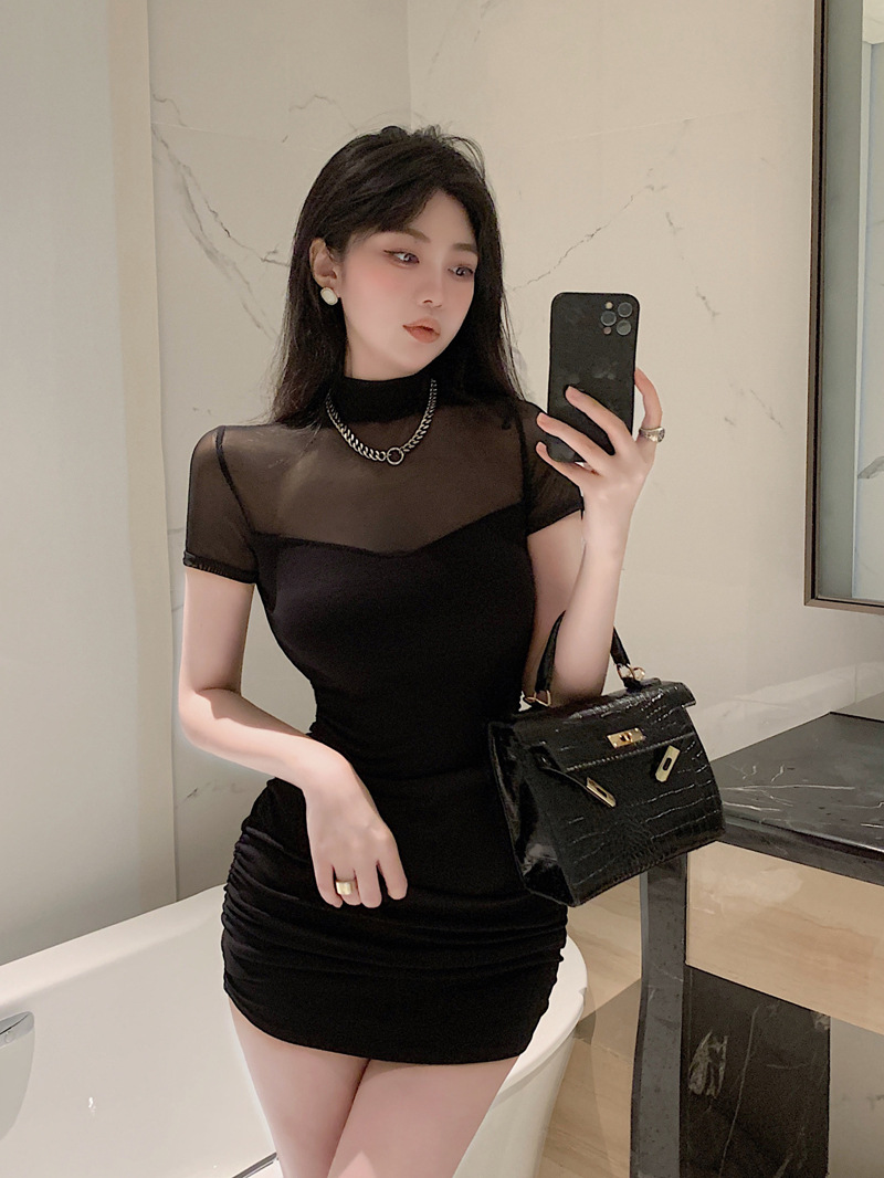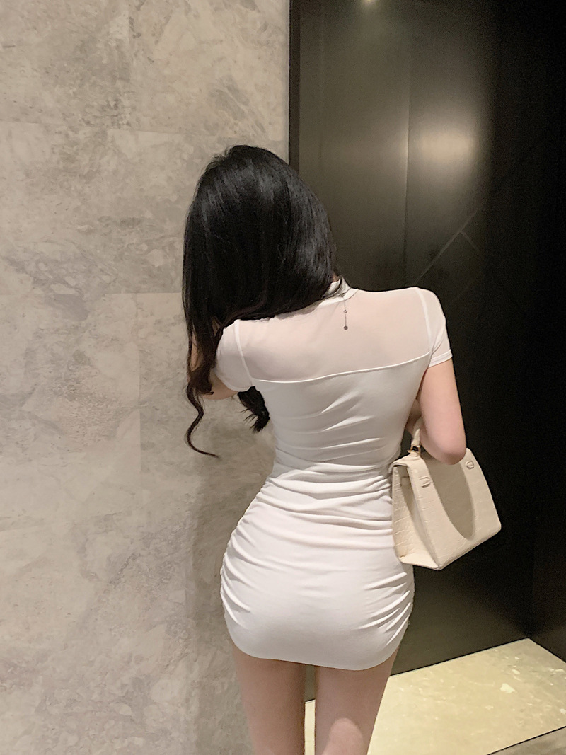프렌치 스타일의 섹시한 메쉬 스티치 원피스 여성 여름 디자인 슬림핏 허리라인 강조 반팔 힙허깅 스커트 핫걸스토어 가기