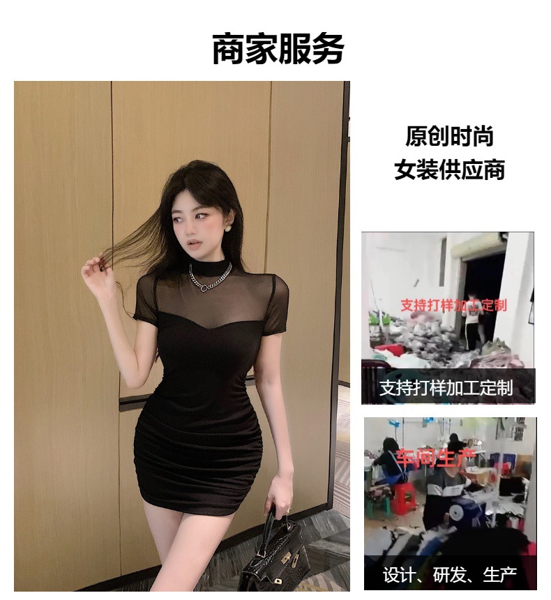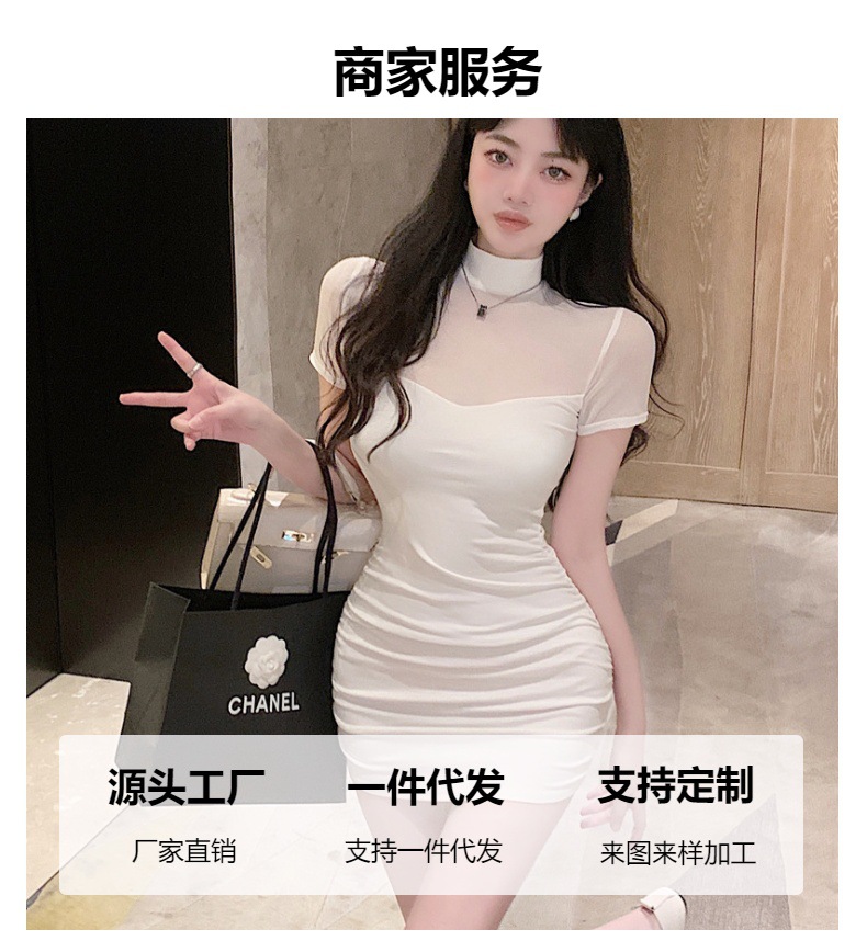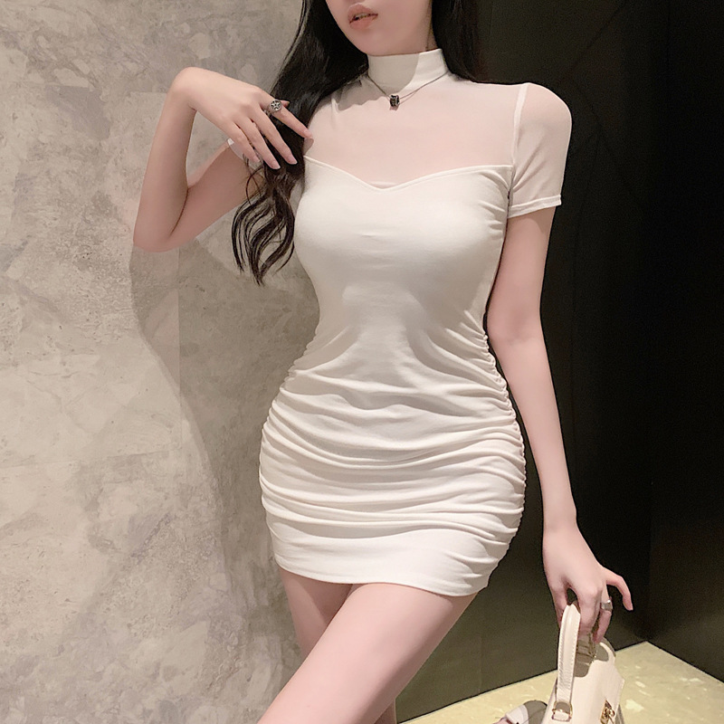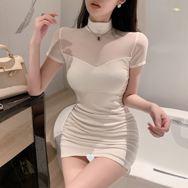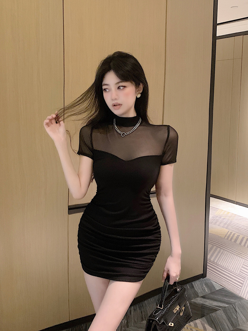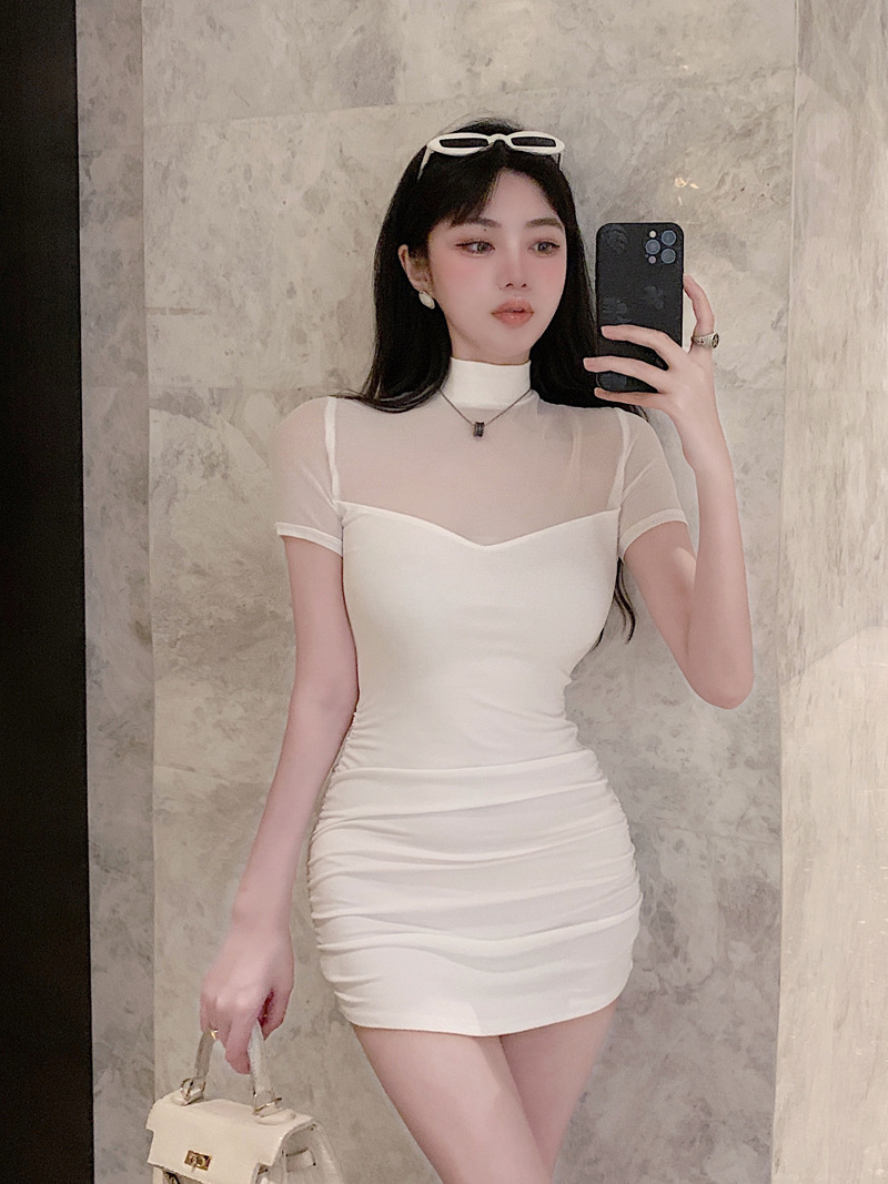 프렌치 스타일의 섹시한 메쉬 스티치 원피스 여성 여름 디자인 슬림핏 허리라인 강조 반팔 힙허깅 스커트 핫걸스토어 가기