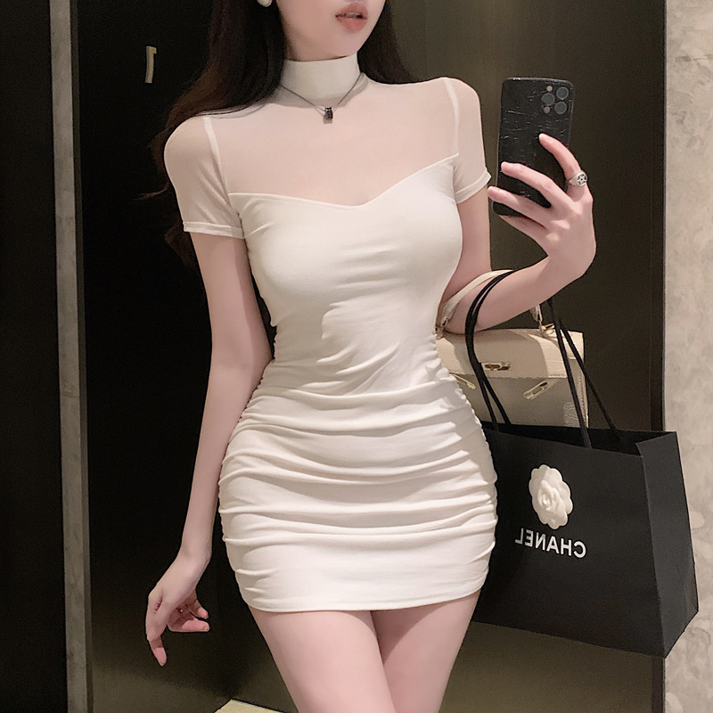 프렌치 스타일의 섹시한 메쉬 스티치 원피스 여성 여름 디자인 슬림핏 허리라인 강조 반팔 힙허깅 스커트 핫걸