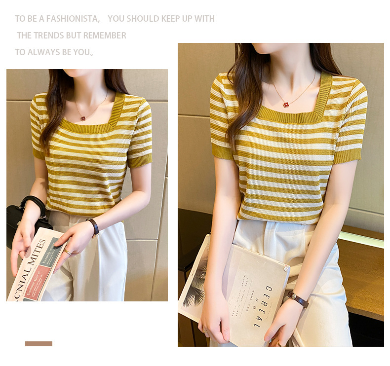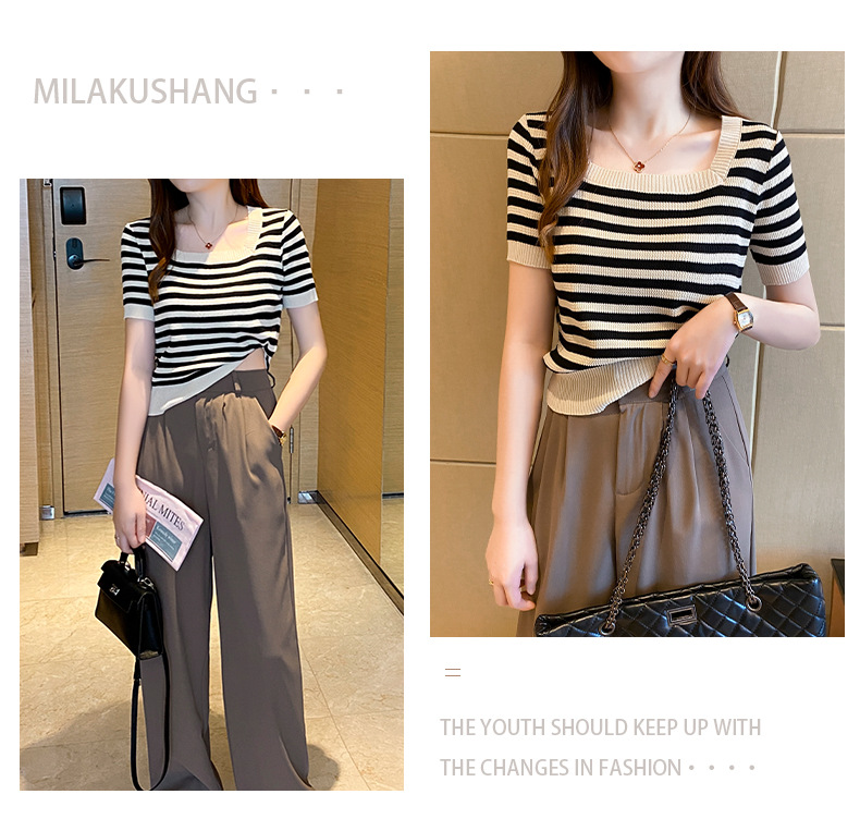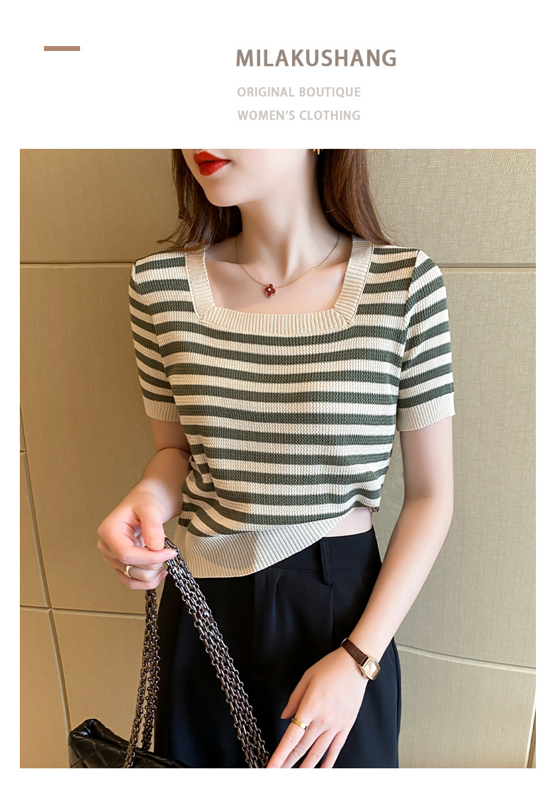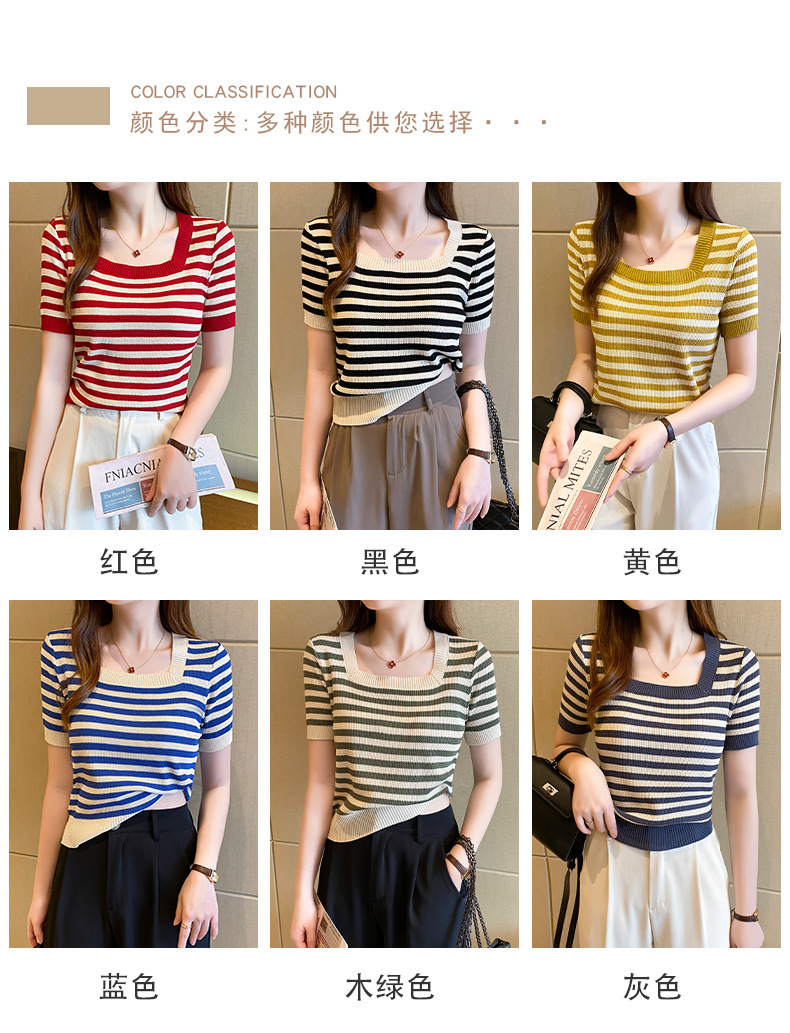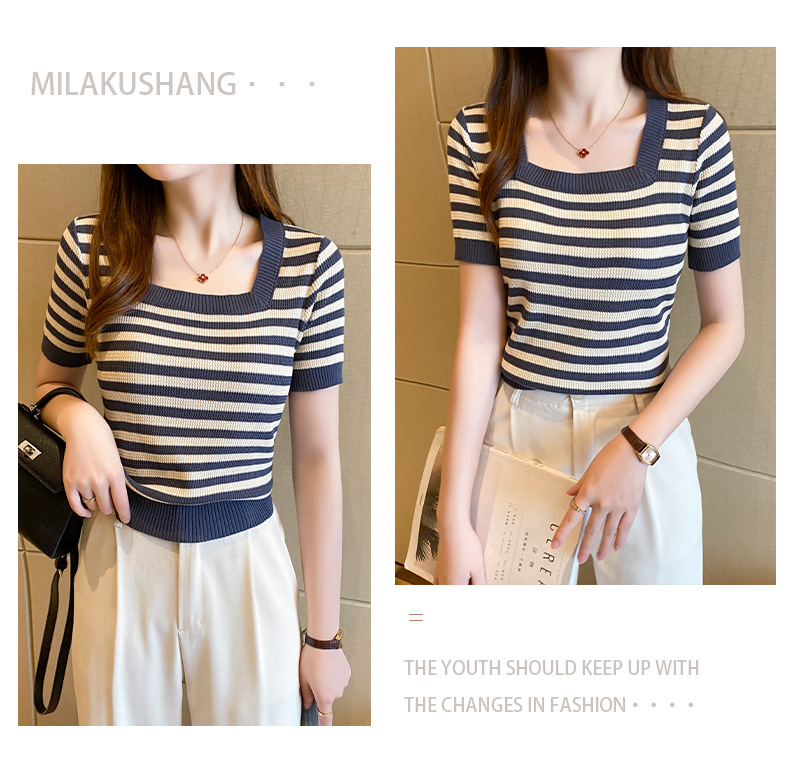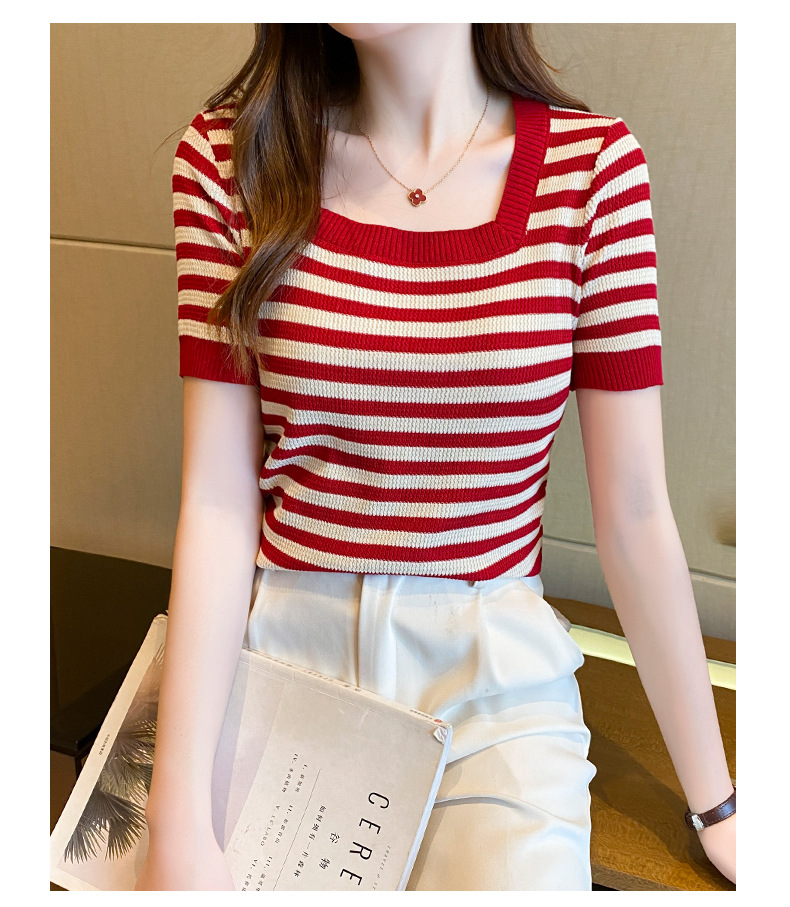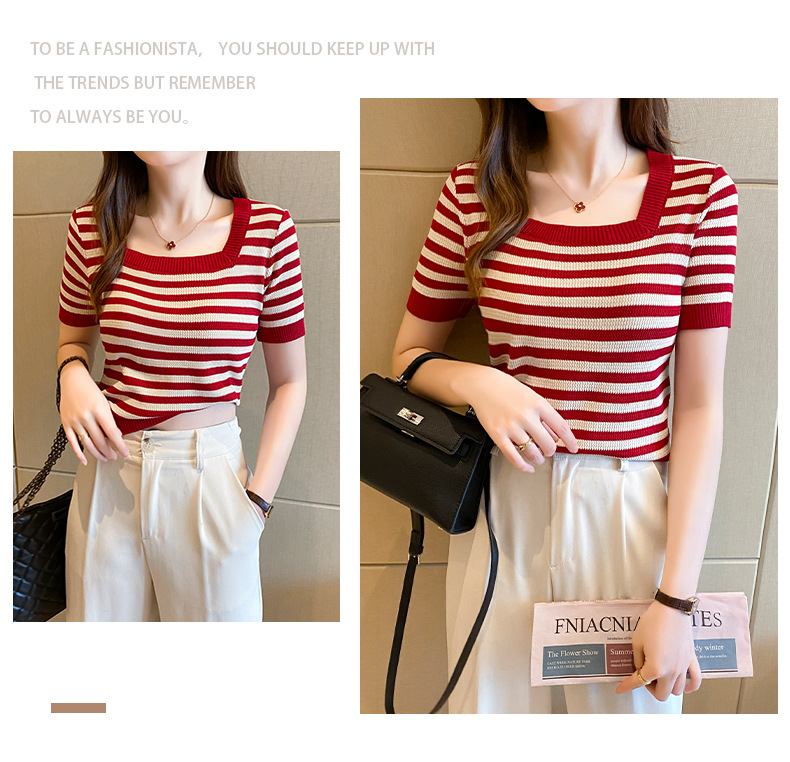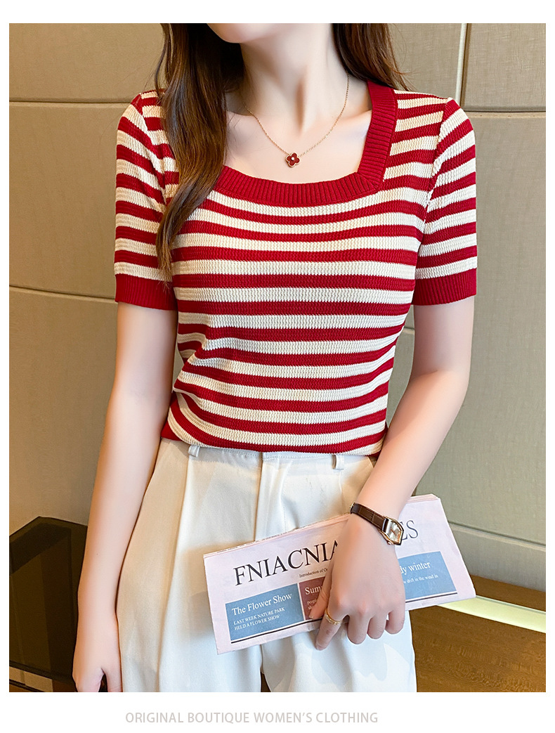 여성용 레드 스트라이프 스퀘어 칼라 반팔 티셔츠 여름 새로운 대비 컬러 아이스 실크 스웨터 슬림 슬리밍 쇼트 탑스토어 가기