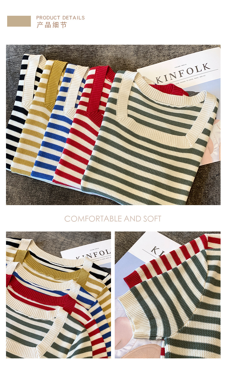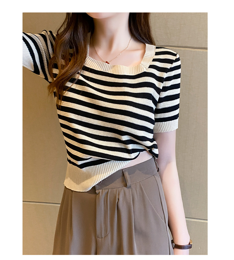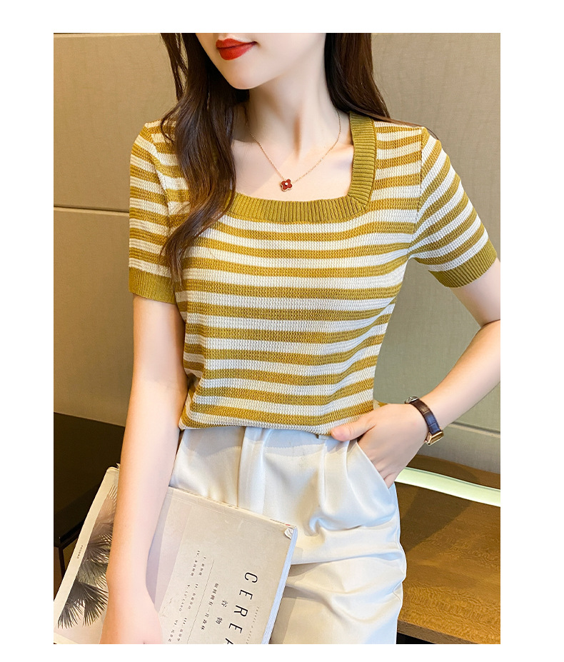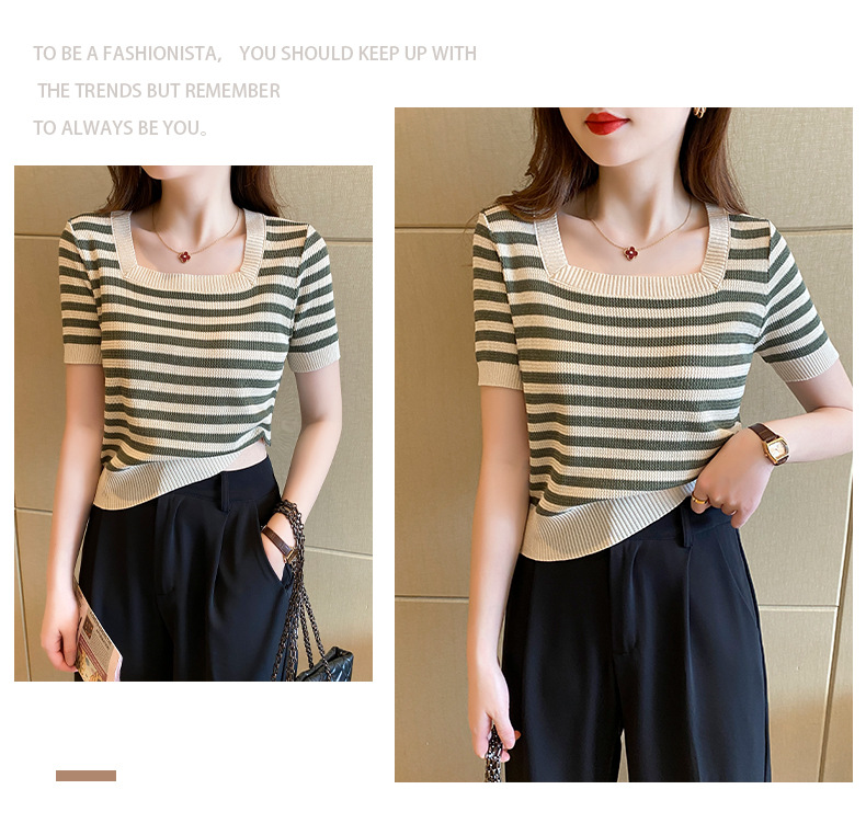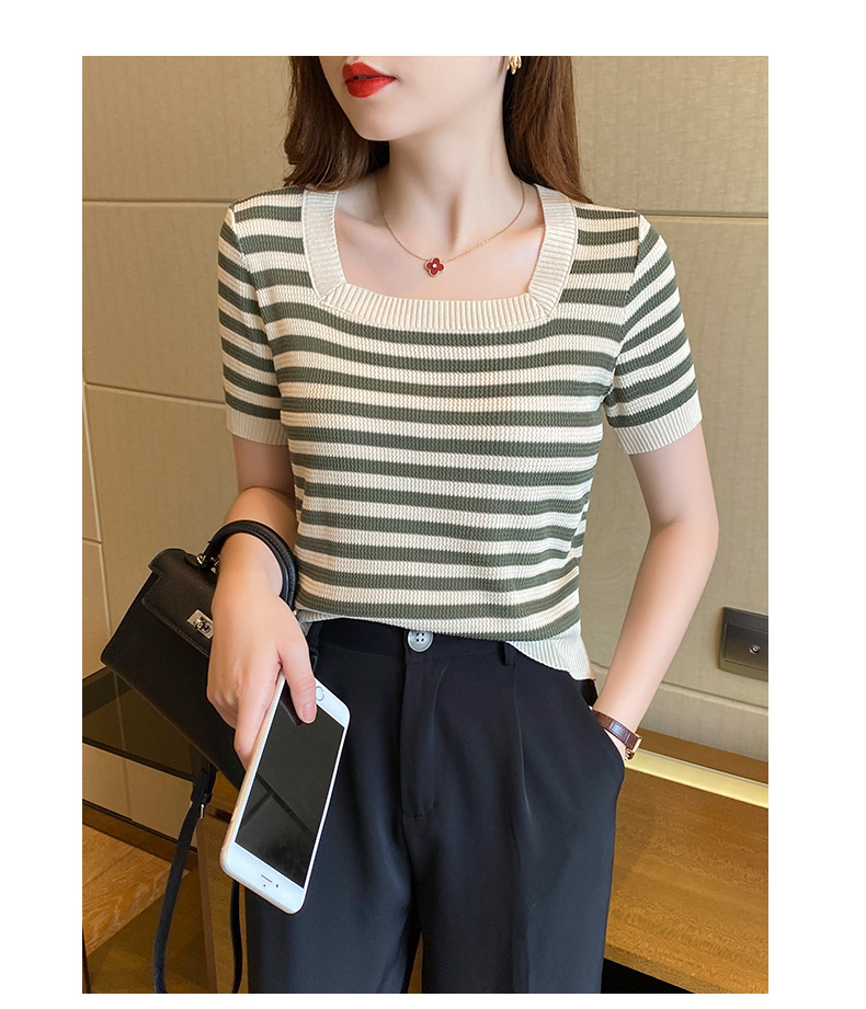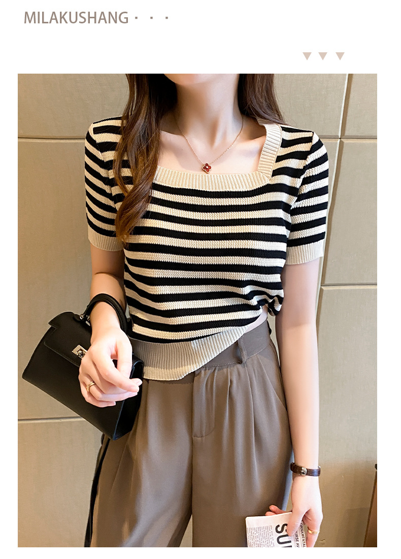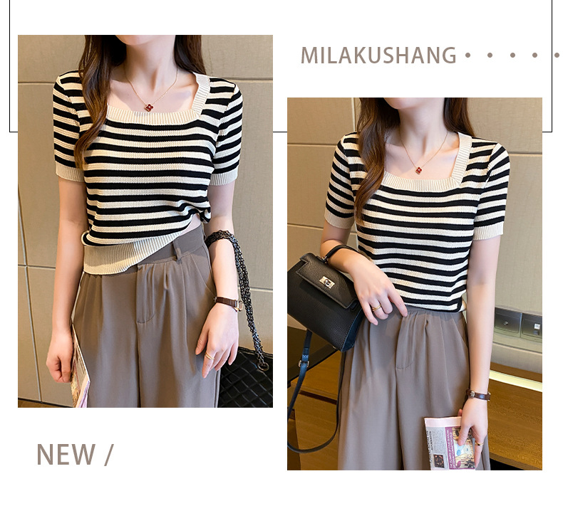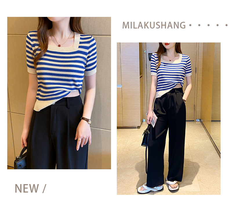 여성용 레드 스트라이프 스퀘어 칼라 반팔 티셔츠 여름 새로운 대비 컬러 아이스 실크 스웨터 슬림 슬리밍 쇼트 탑스토어 가기