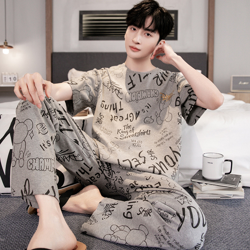 잠옷 남성용 봄과 여름 코튼 반팔 바지 홈웨어 남성용 여름 얇은 캐주얼 겉옷 파자마 세트