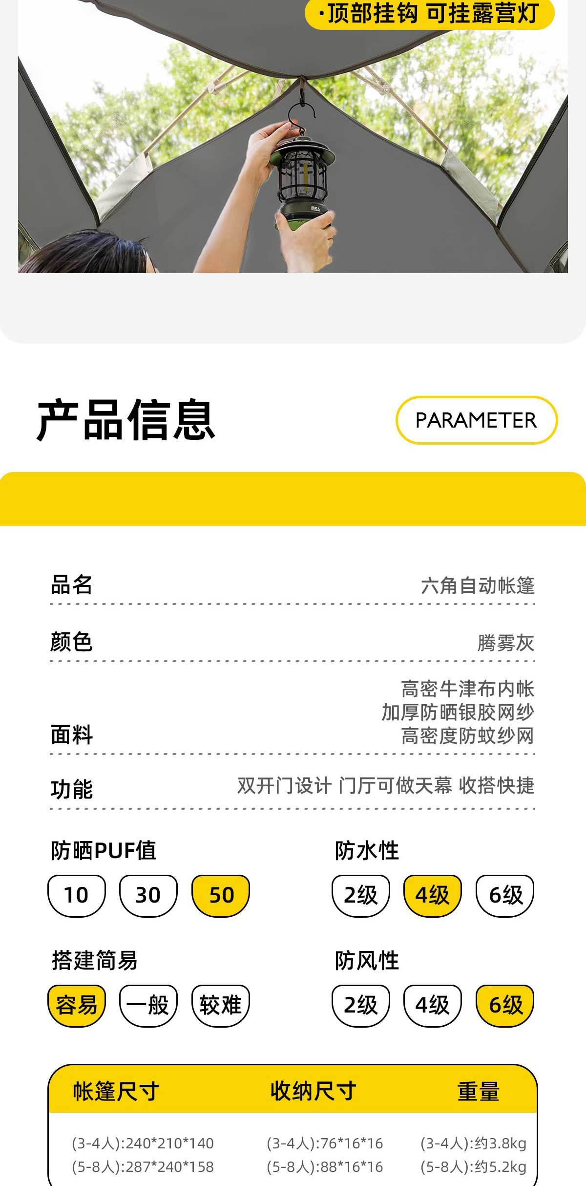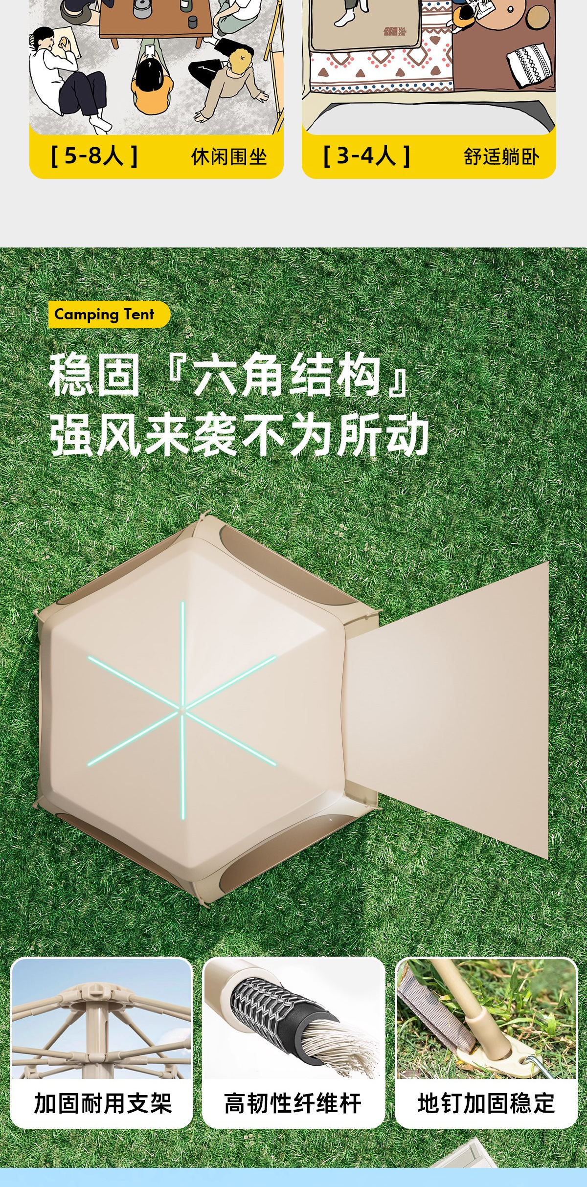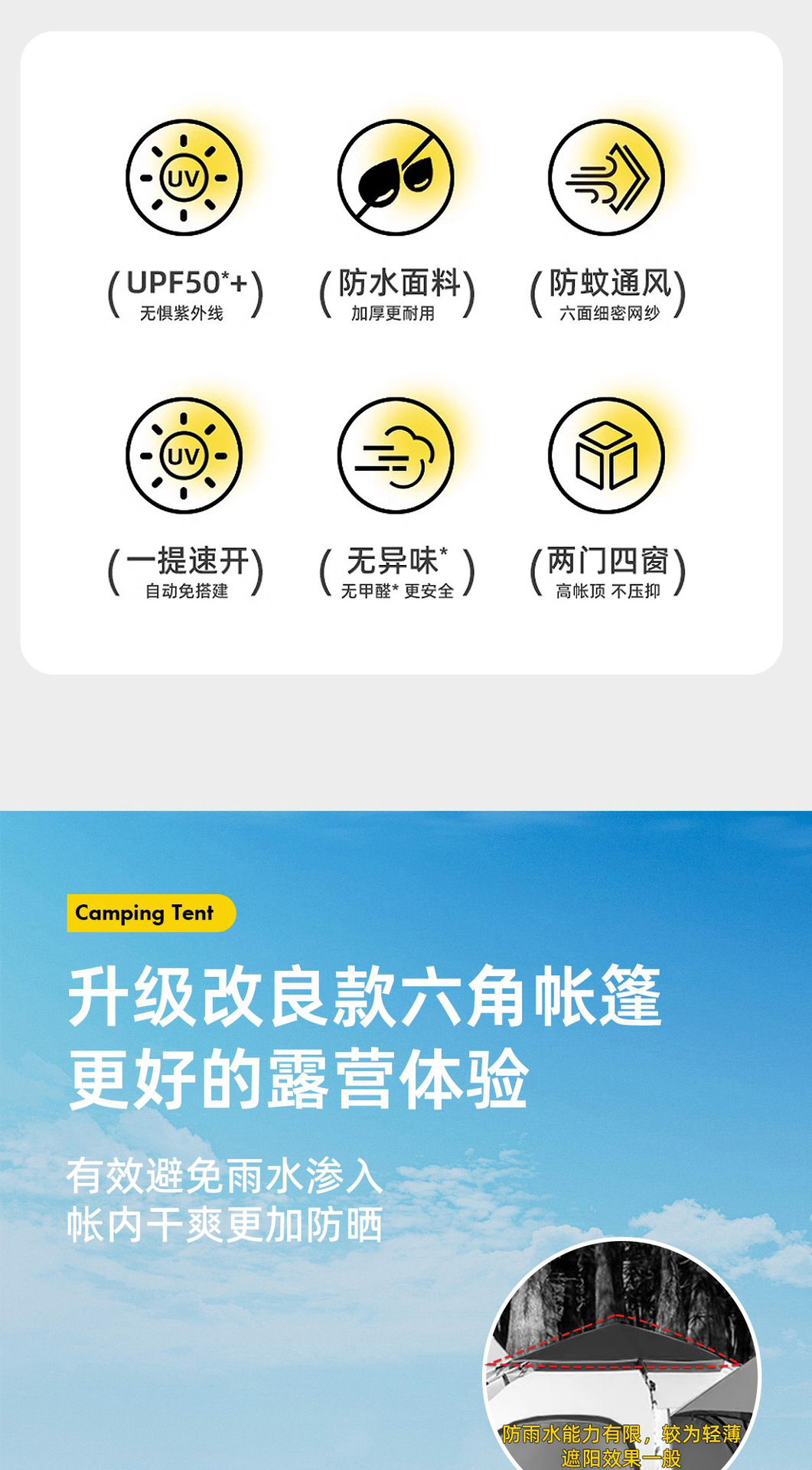 • 2 개의 문과 4 개의 창문이있는 새로운 육각형 텐트