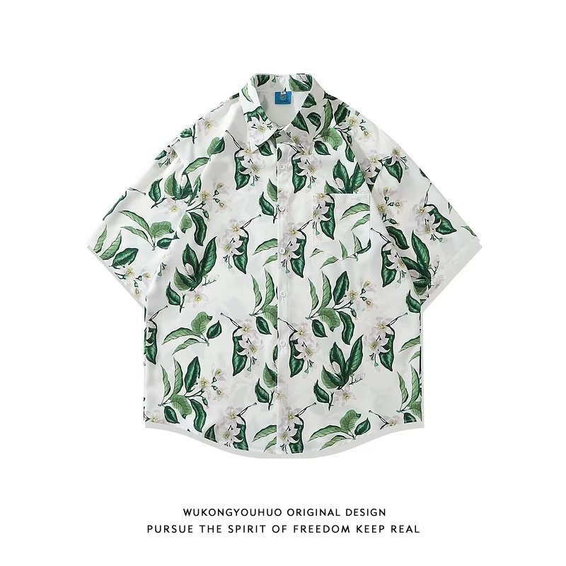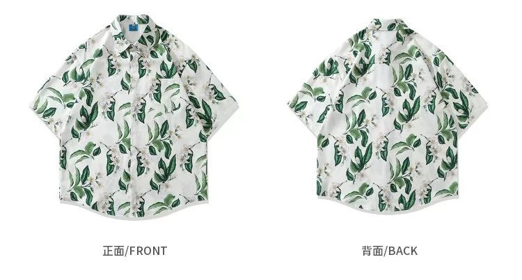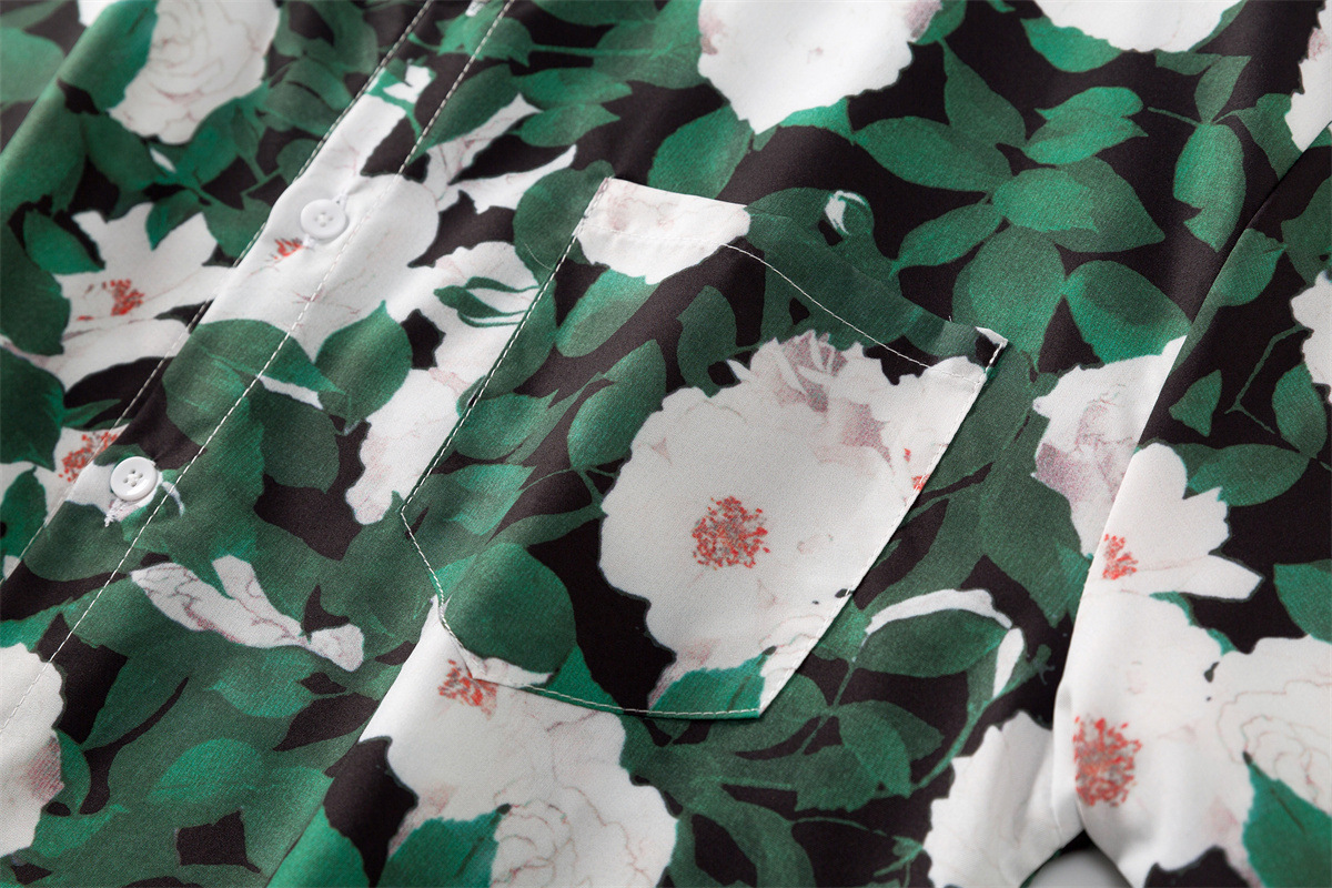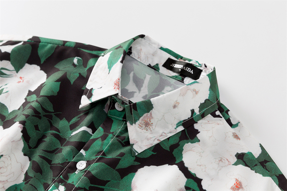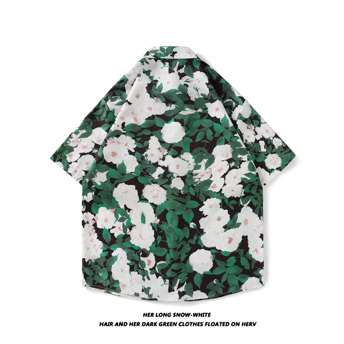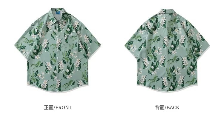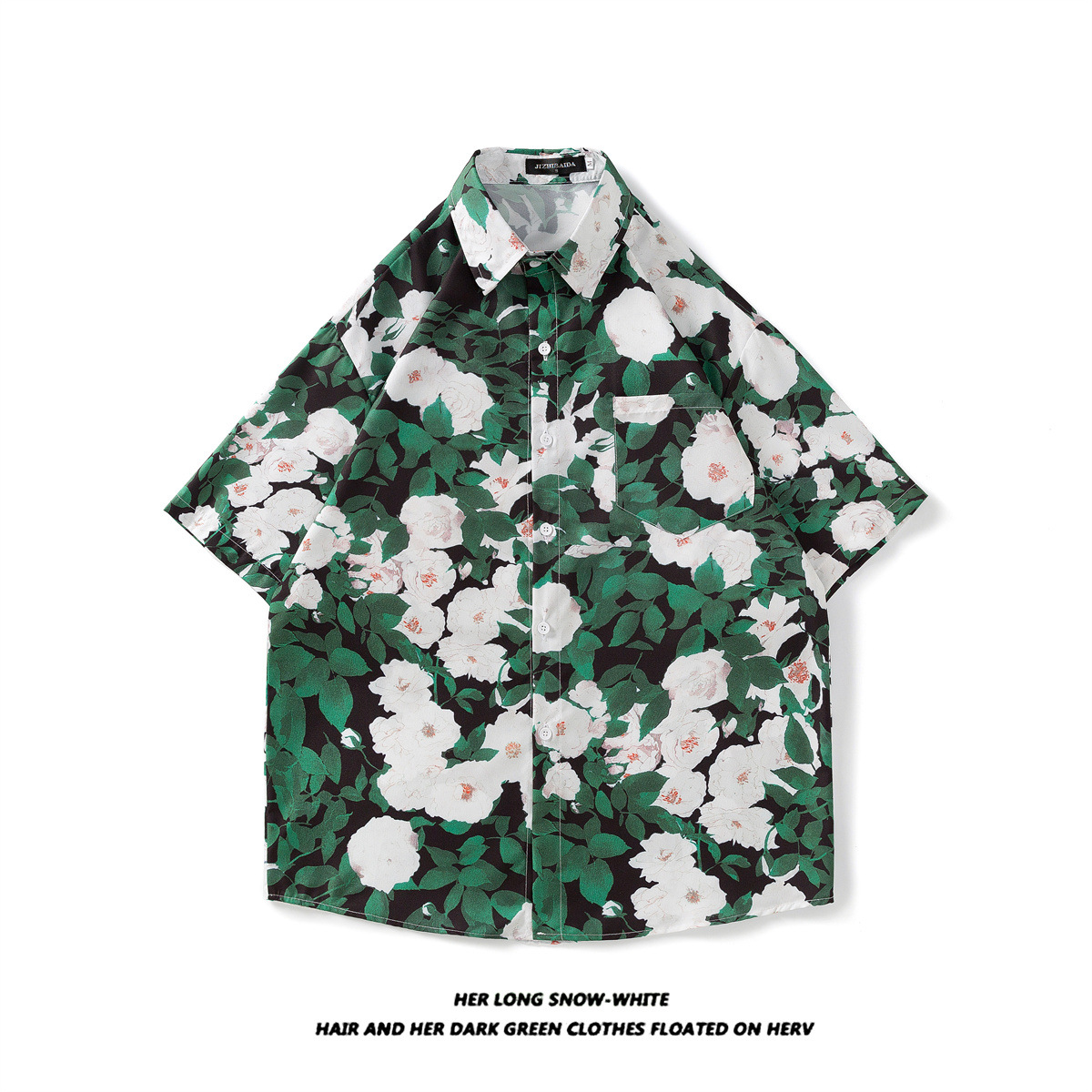레트로 그린 유화 꽃 틈새 게으른 트렌디 인 캐주얼 예술적 짧은 소매 꽃 셔츠 남성 하와이스토어 가기