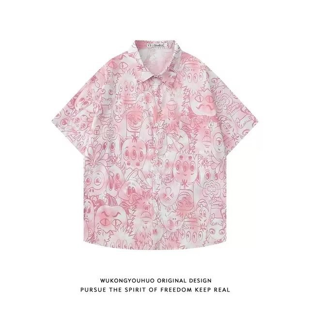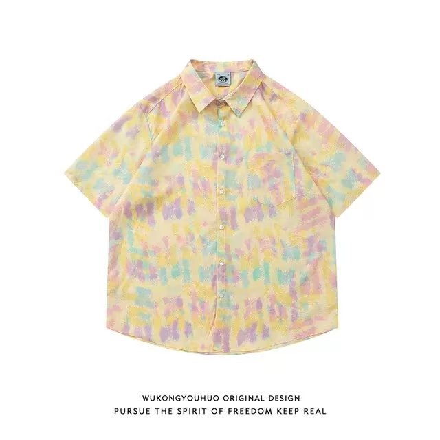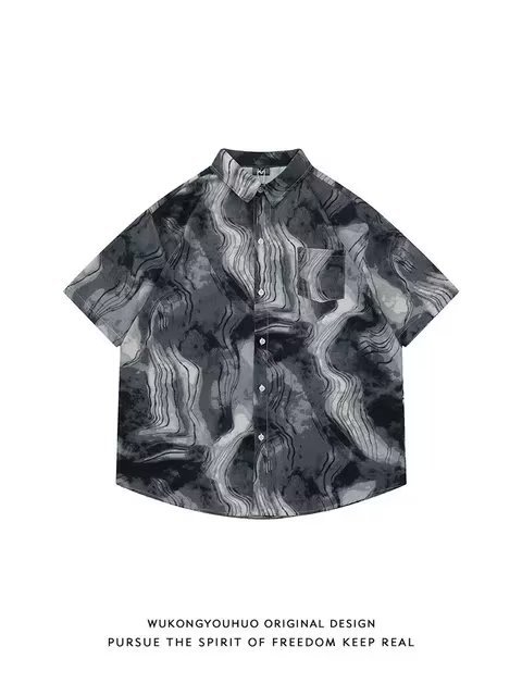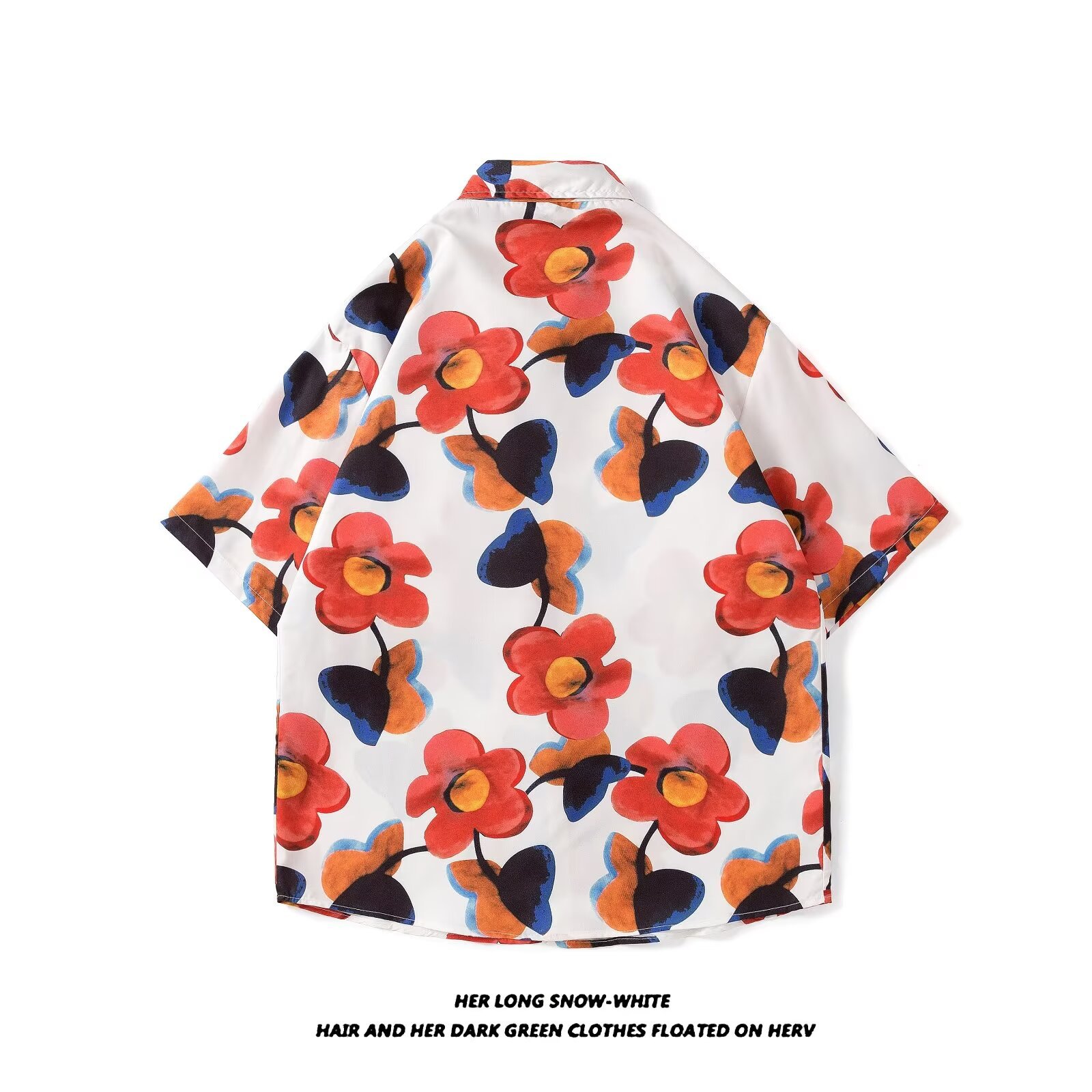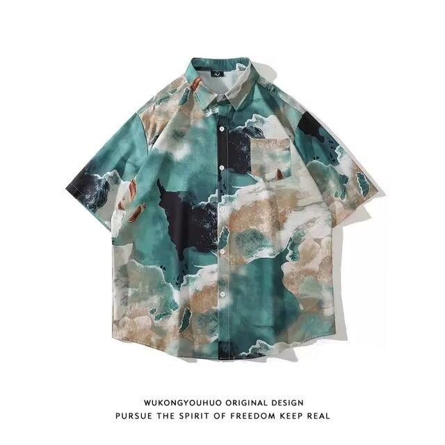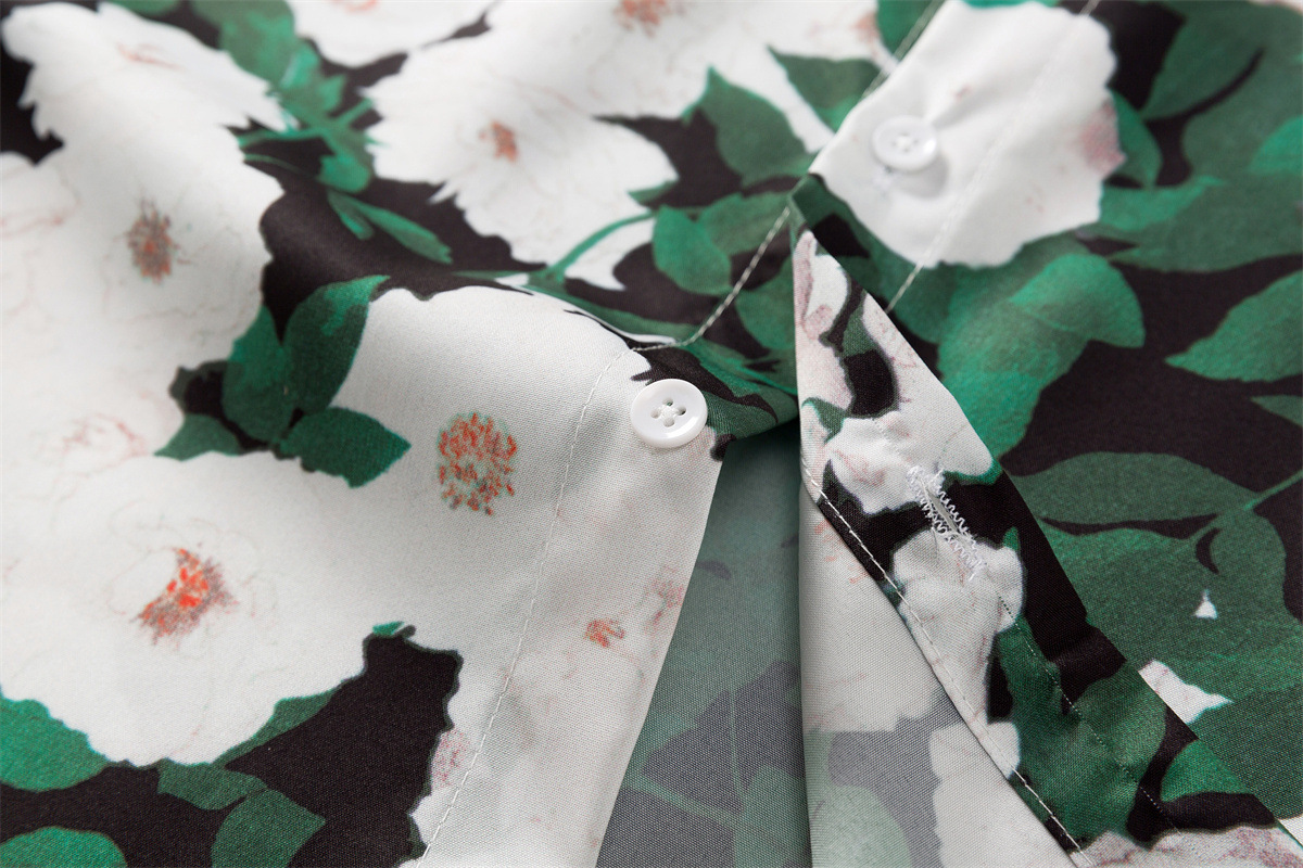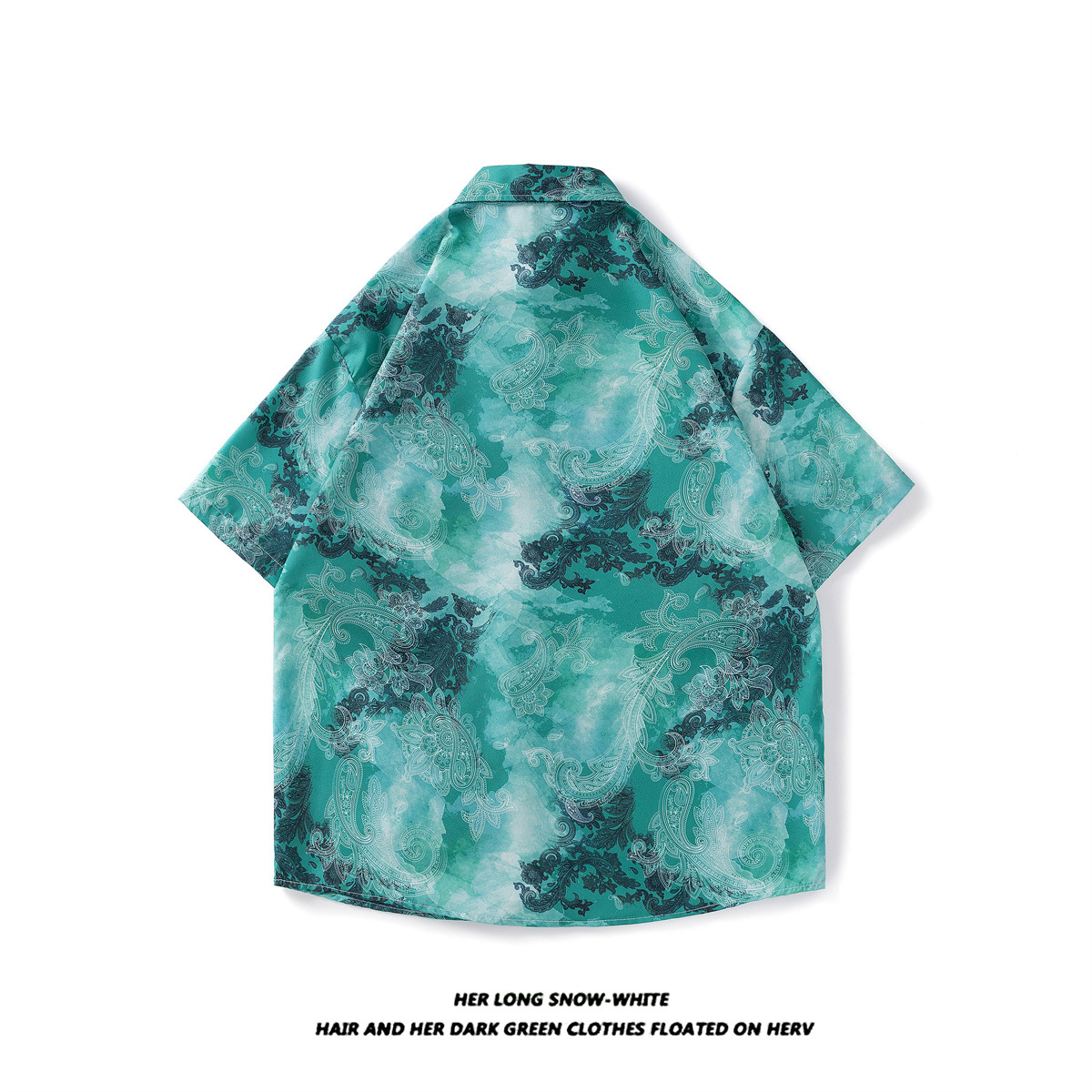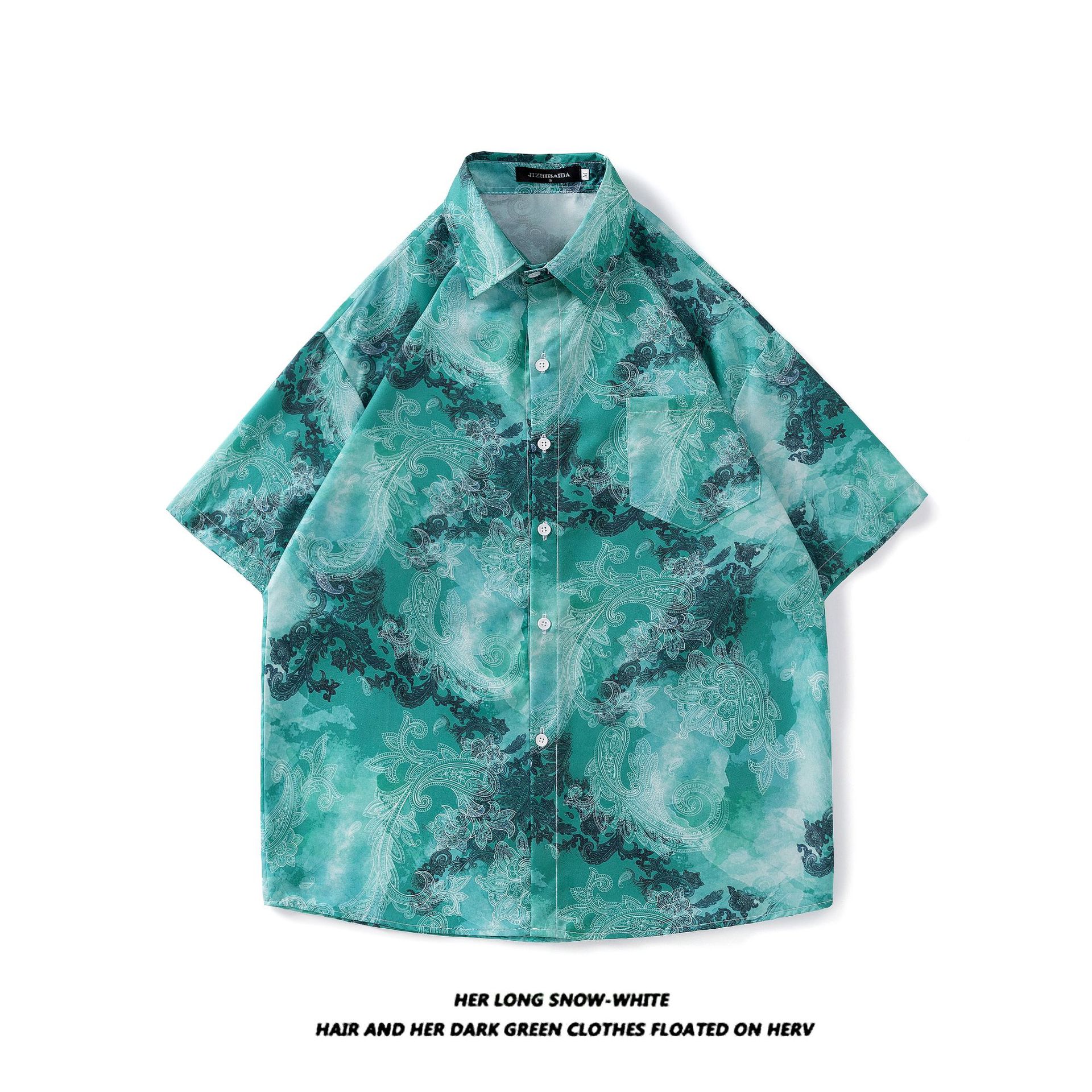 레트로 그린 유화 꽃 틈새 게으른 트렌디 인 캐주얼 예술적 짧은 소매 꽃 셔츠 남성 하와이