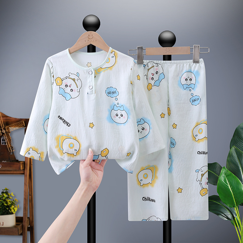 여름 새로운 만화 어린이 잠옷 얇은 면 긴 소매 바지 세트 남자 집 소녀의 여름 에어컨 옷