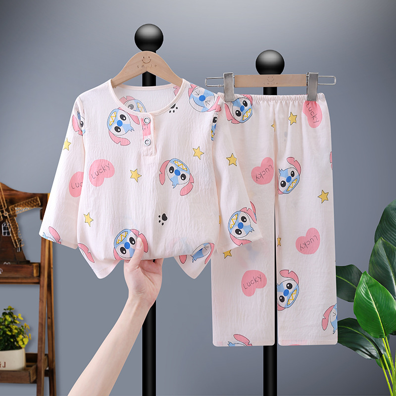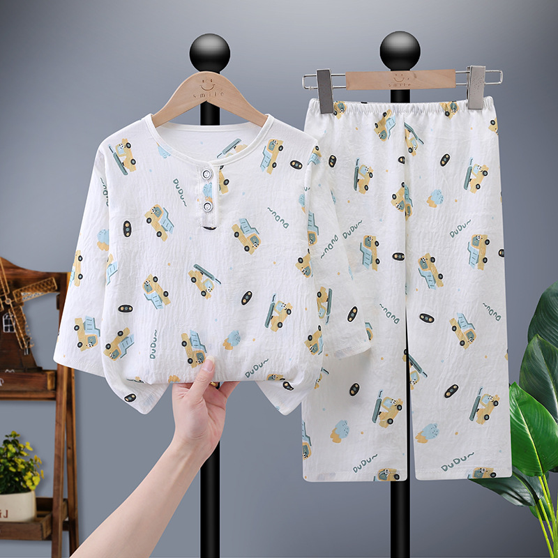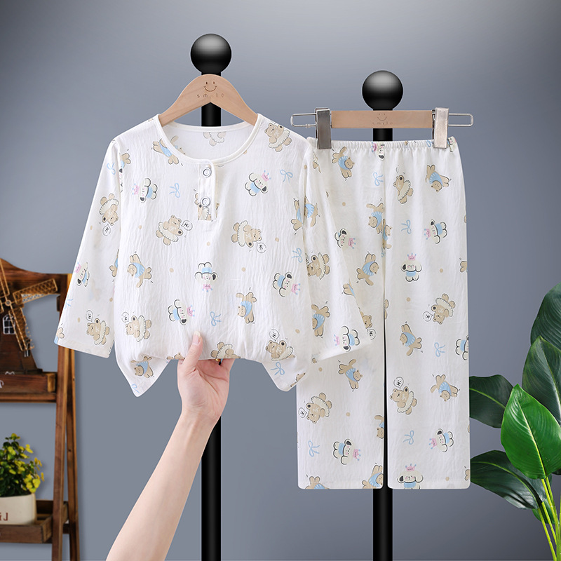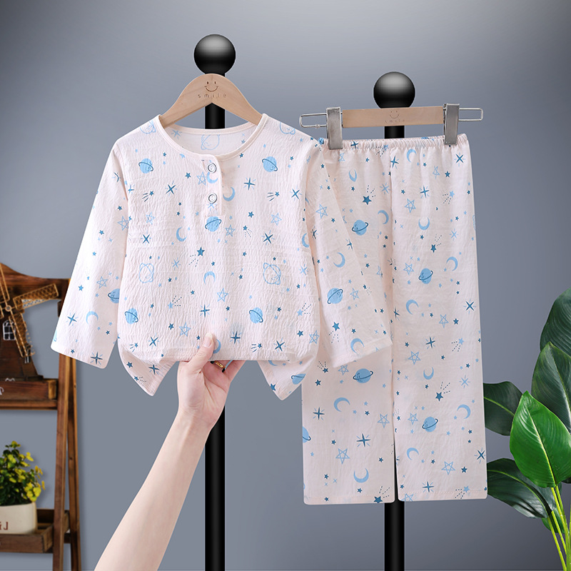 여름 새로운 만화 어린이 잠옷 얇은 면 긴 소매 바지 세트 남자 집 소녀의 여름 에어컨 옷스토어 가기