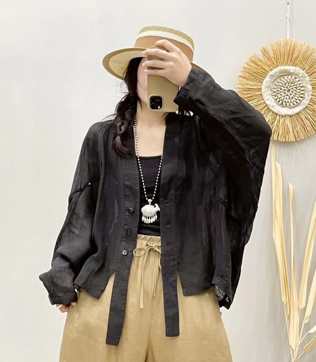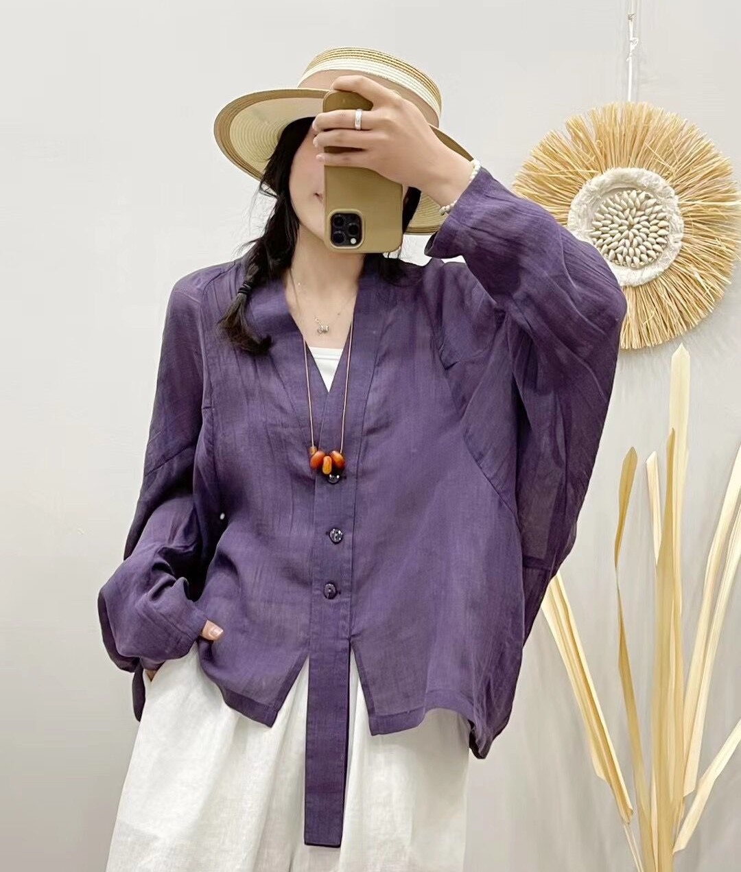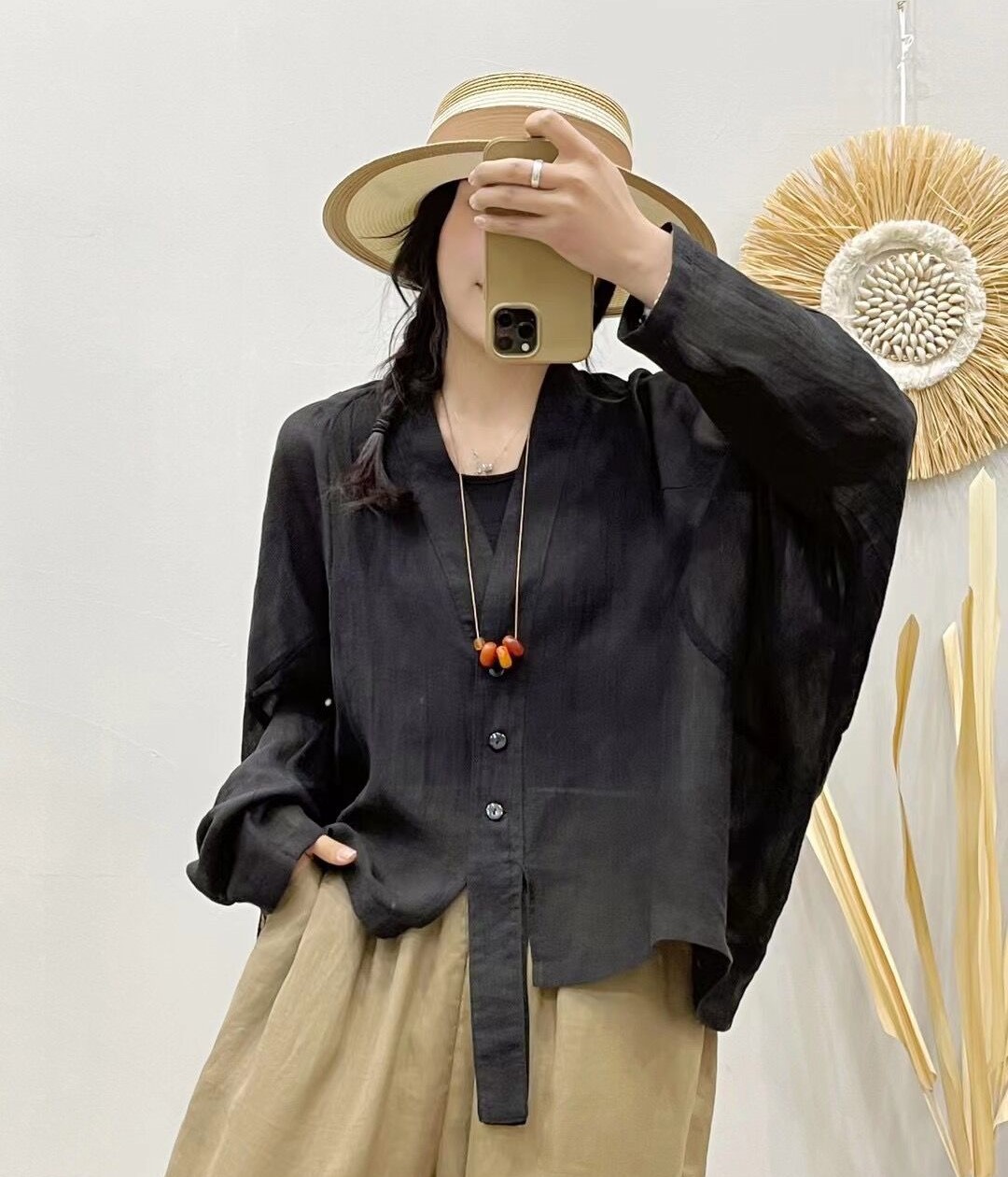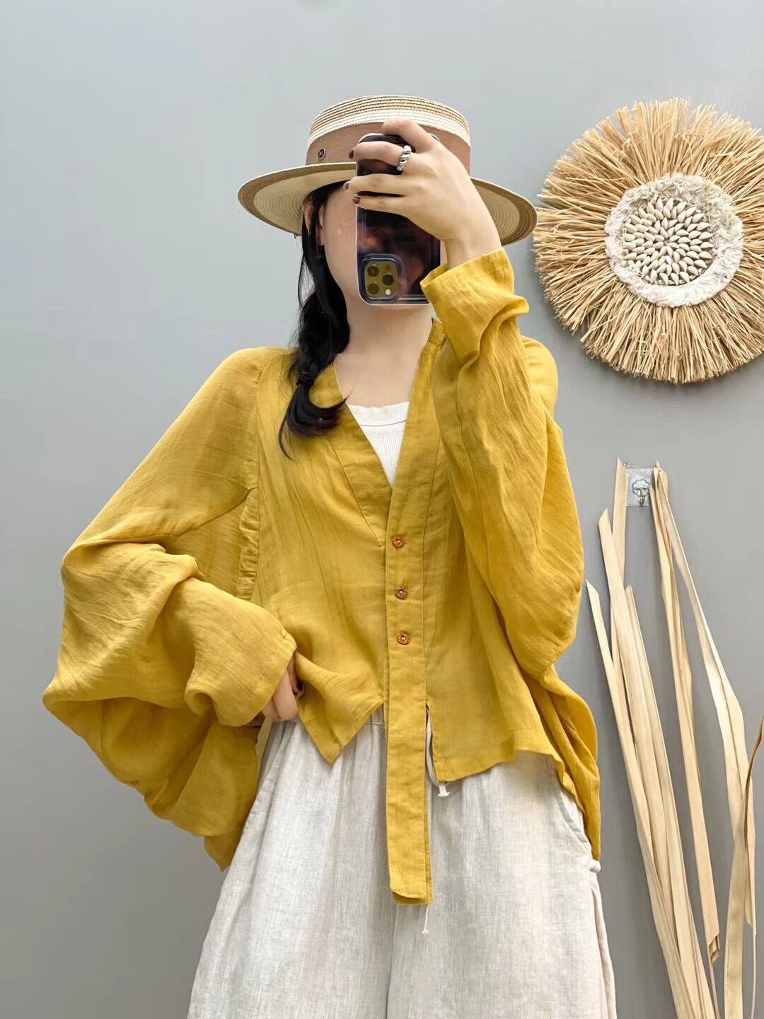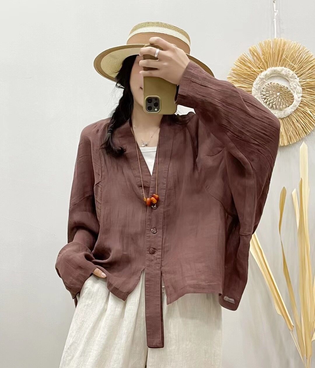 순수 라미 주름 셔츠 20234 봄 새로운 디자인 카디건 탑 여성용 V 넥 긴팔 셔츠 9530스토어 가기