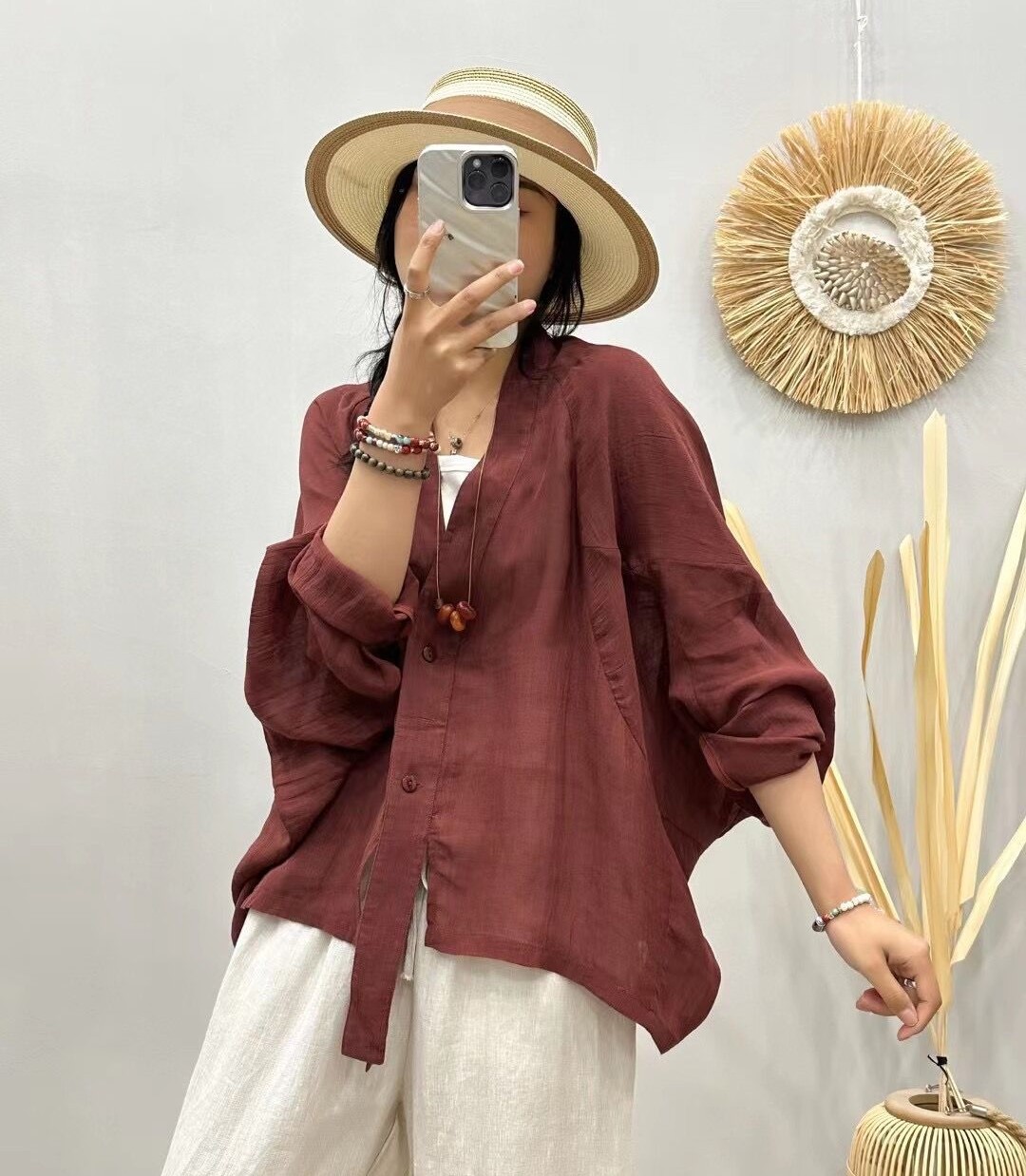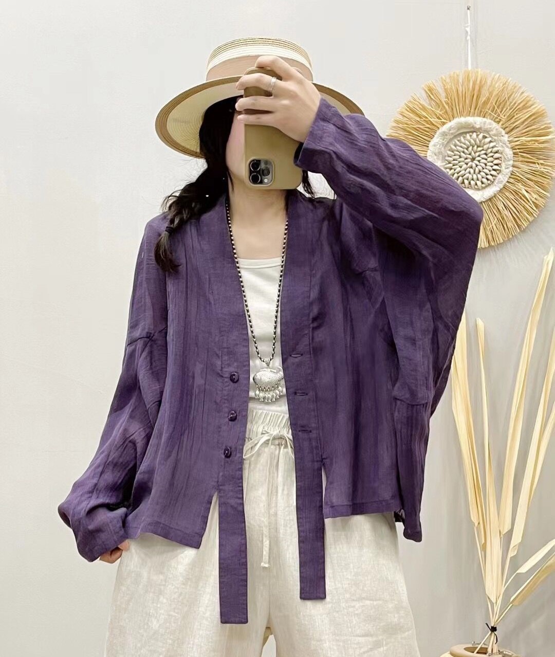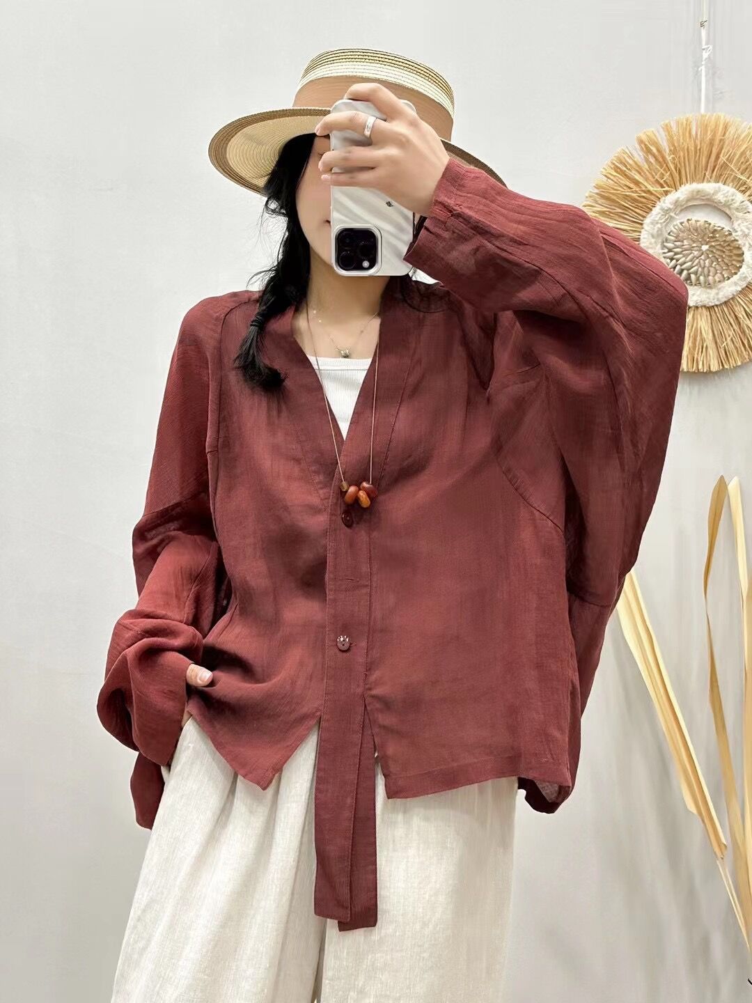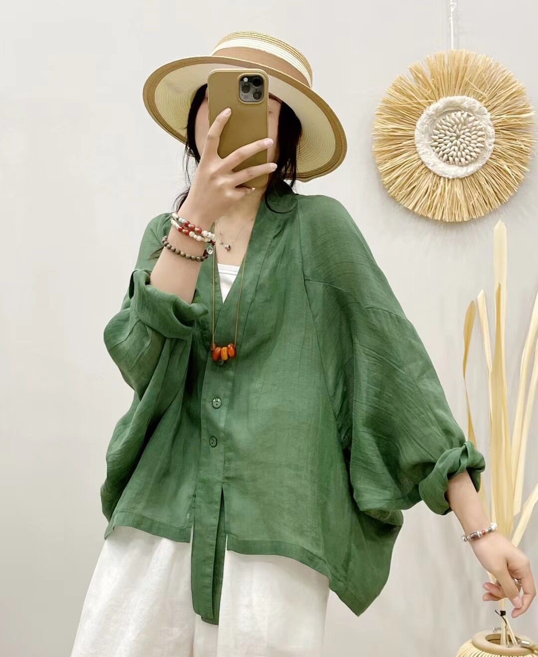 순수 라미 주름 셔츠 20234 봄 새로운 디자인 카디건 탑 여성용 V 넥 긴팔 셔츠 9530스토어 가기