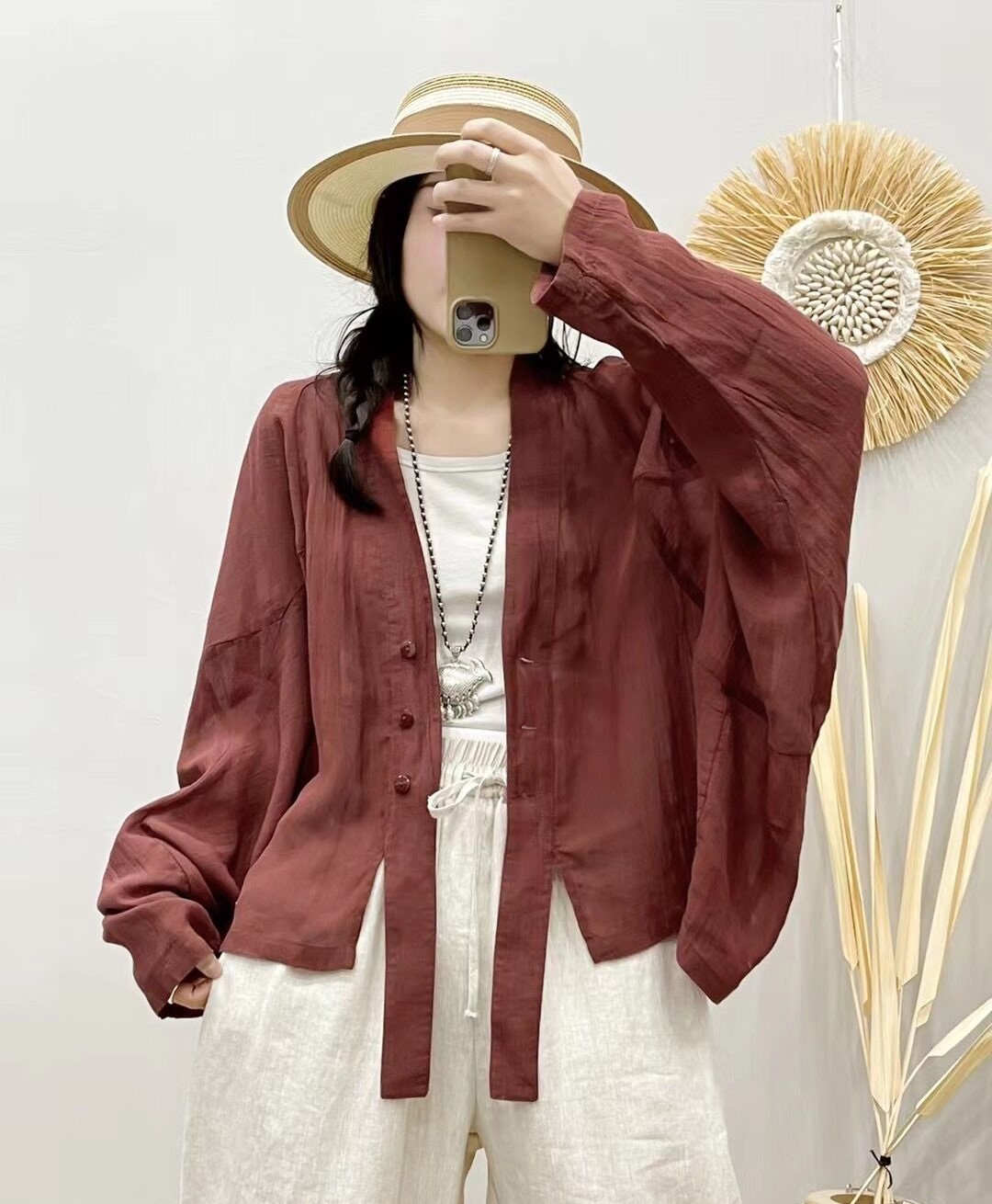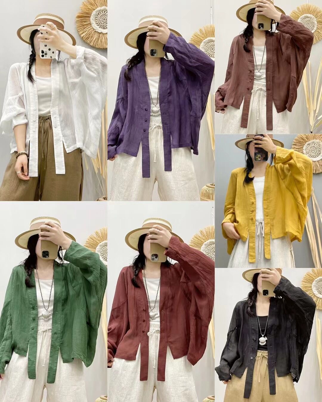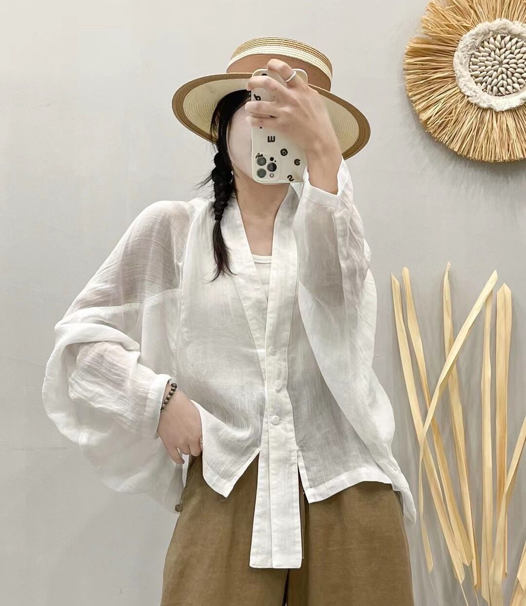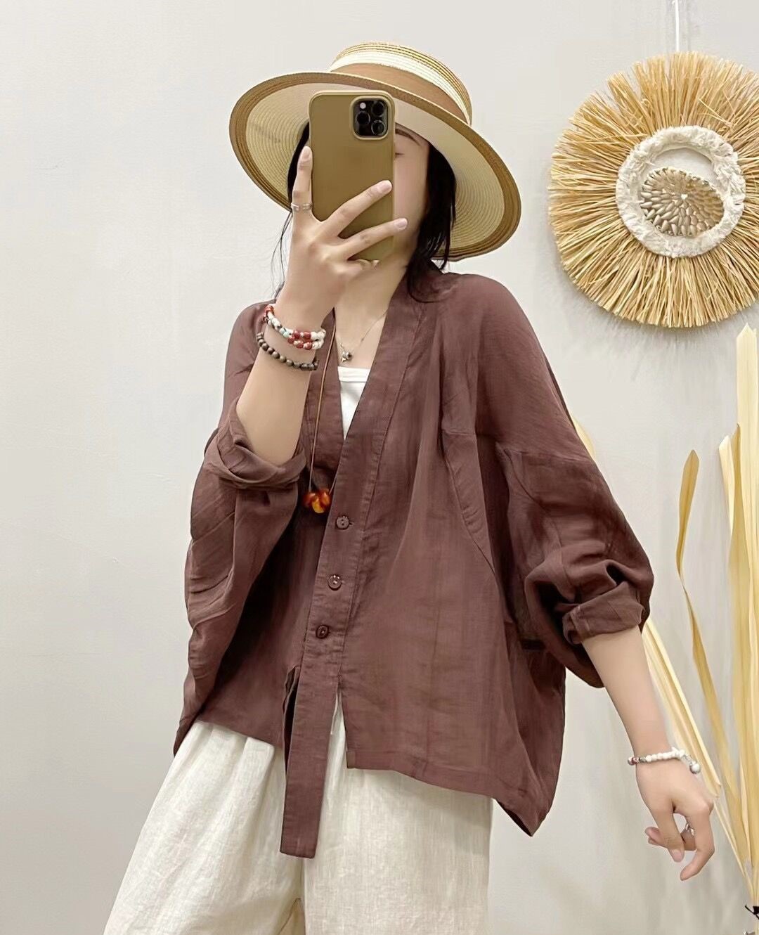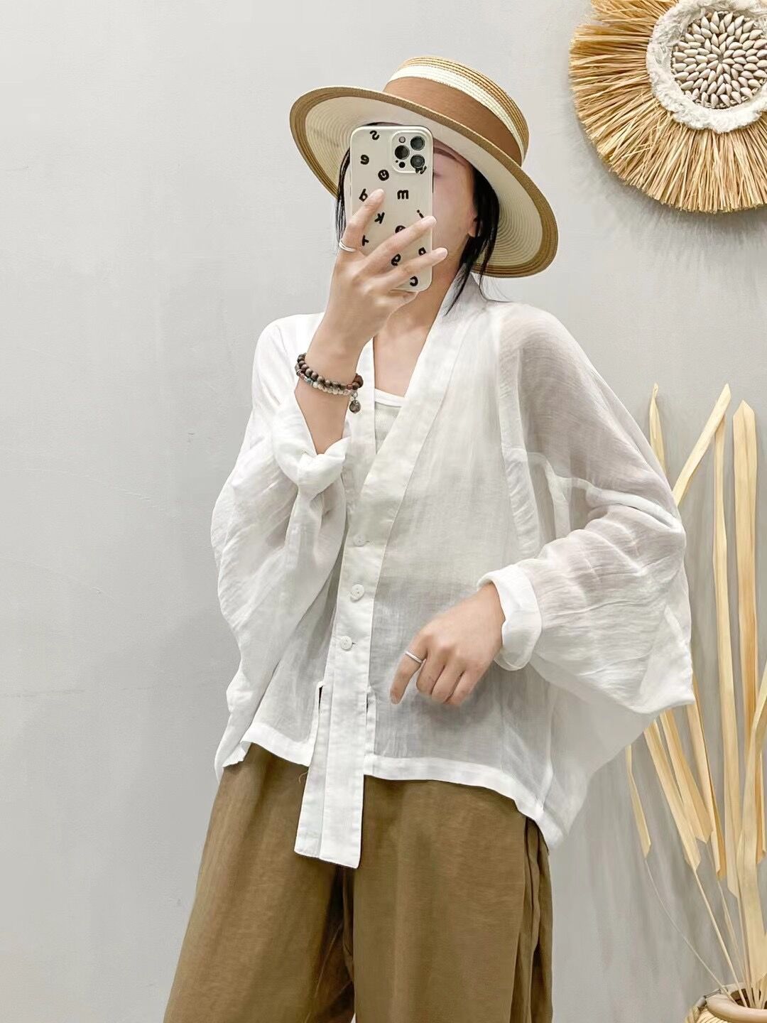순수 라미 주름 셔츠 20234 봄 새로운 디자인 카디건 탑 여성용 V 넥 긴팔 셔츠 9530스토어 가기