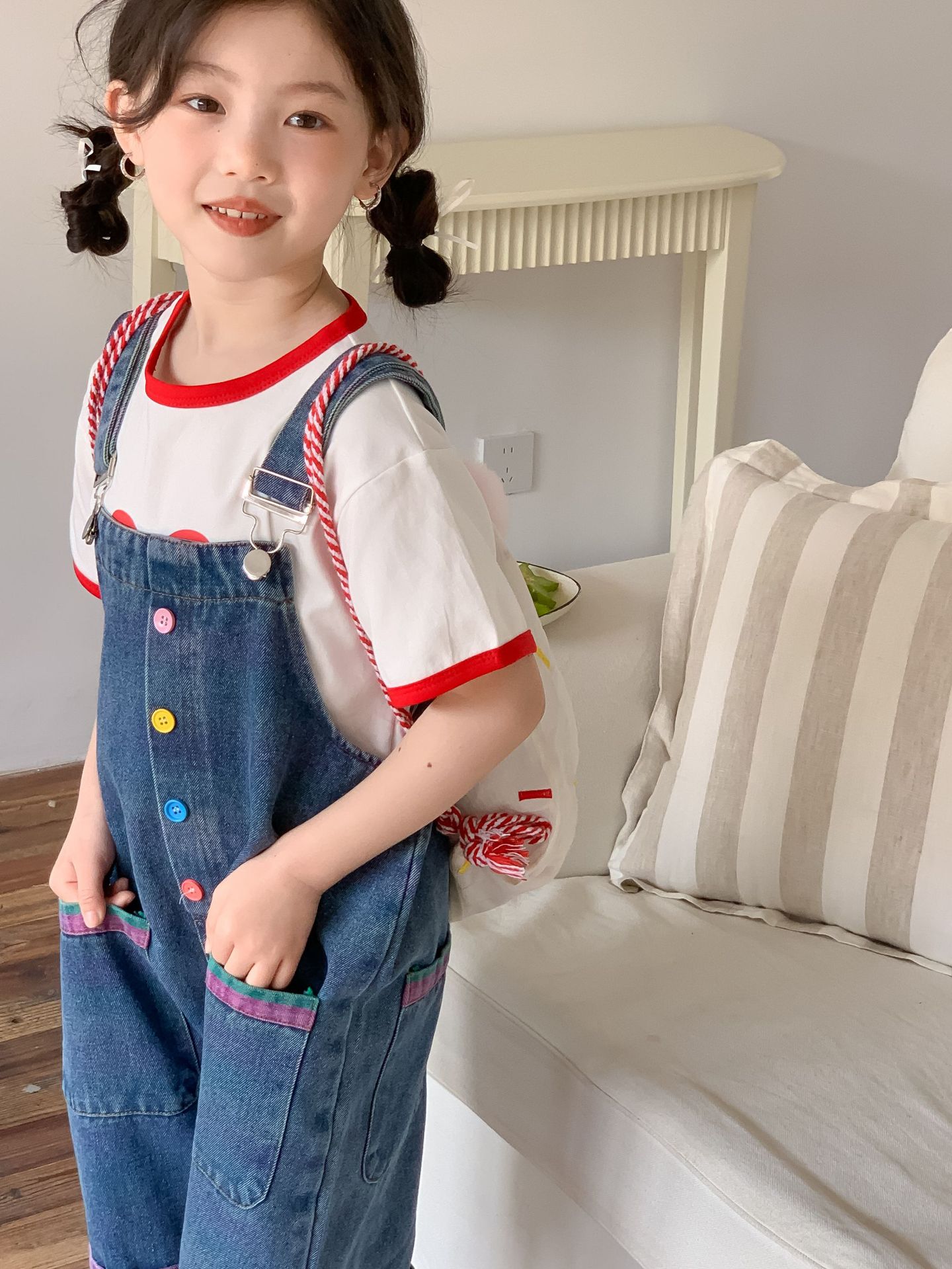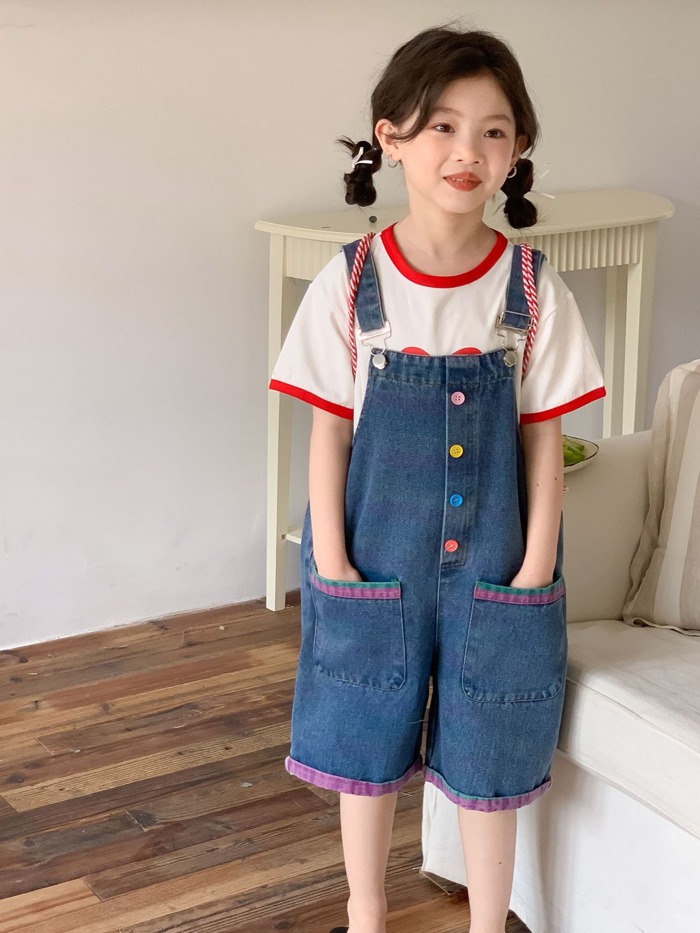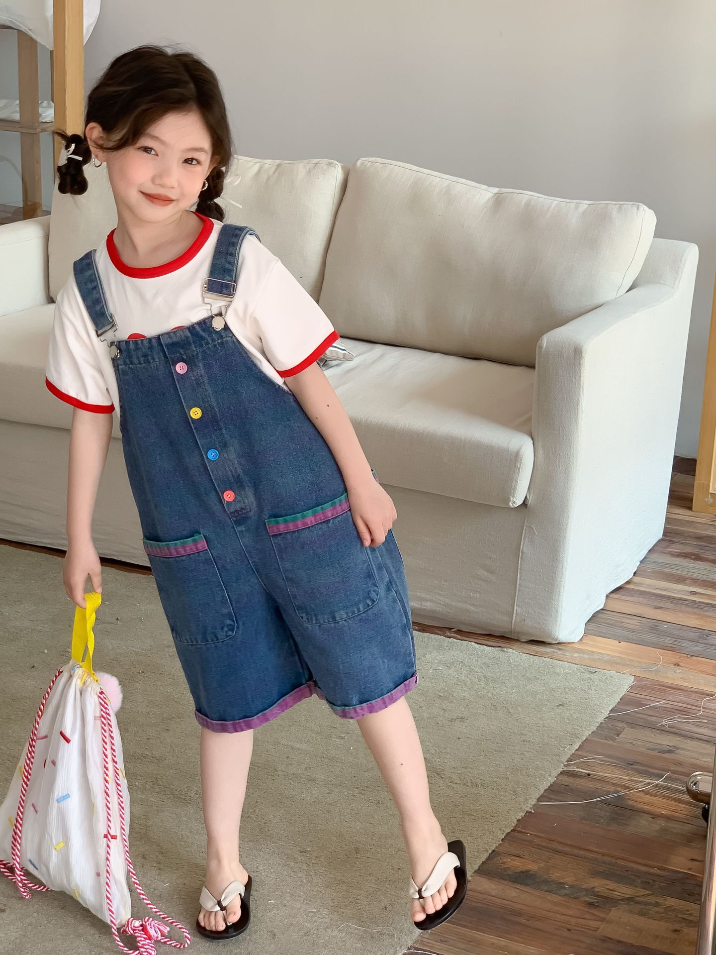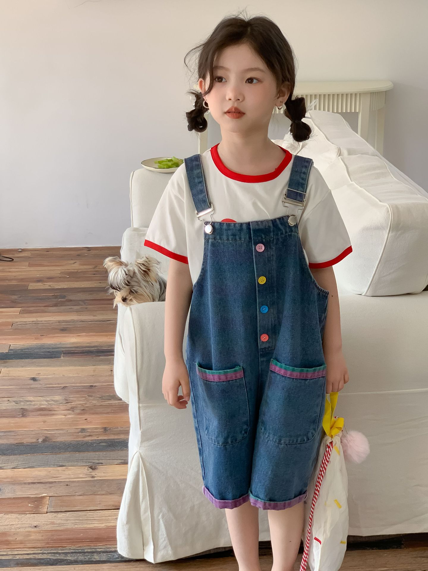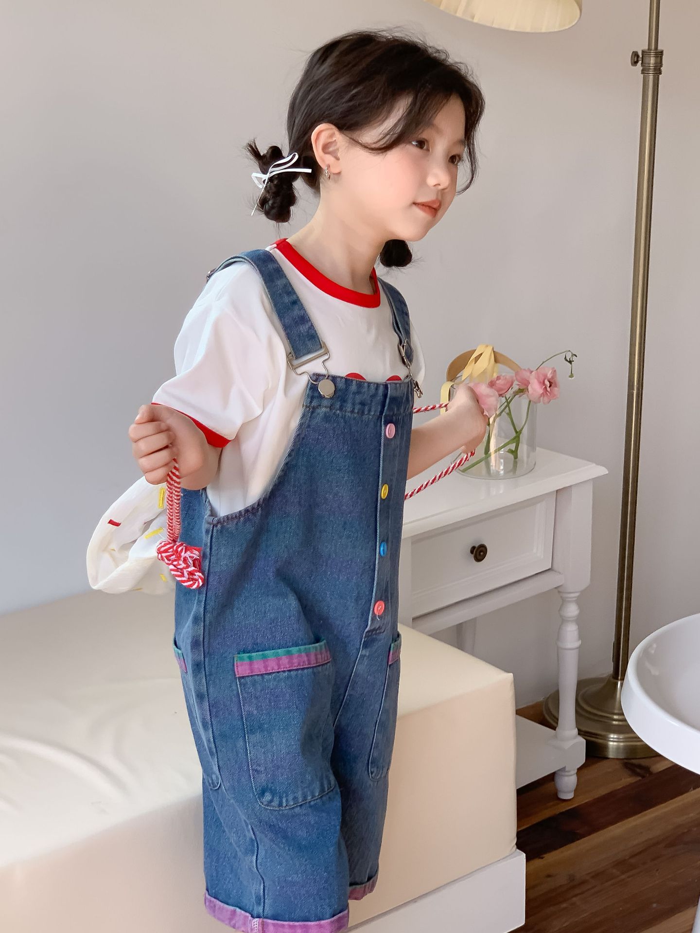 한국 아동복 2024 여름 소녀의 화려한 버튼 컬러 원사 데님 서스펜더 바지 미디어와 큰 어린이 소녀의 트렌디 한 바지스토어 가기