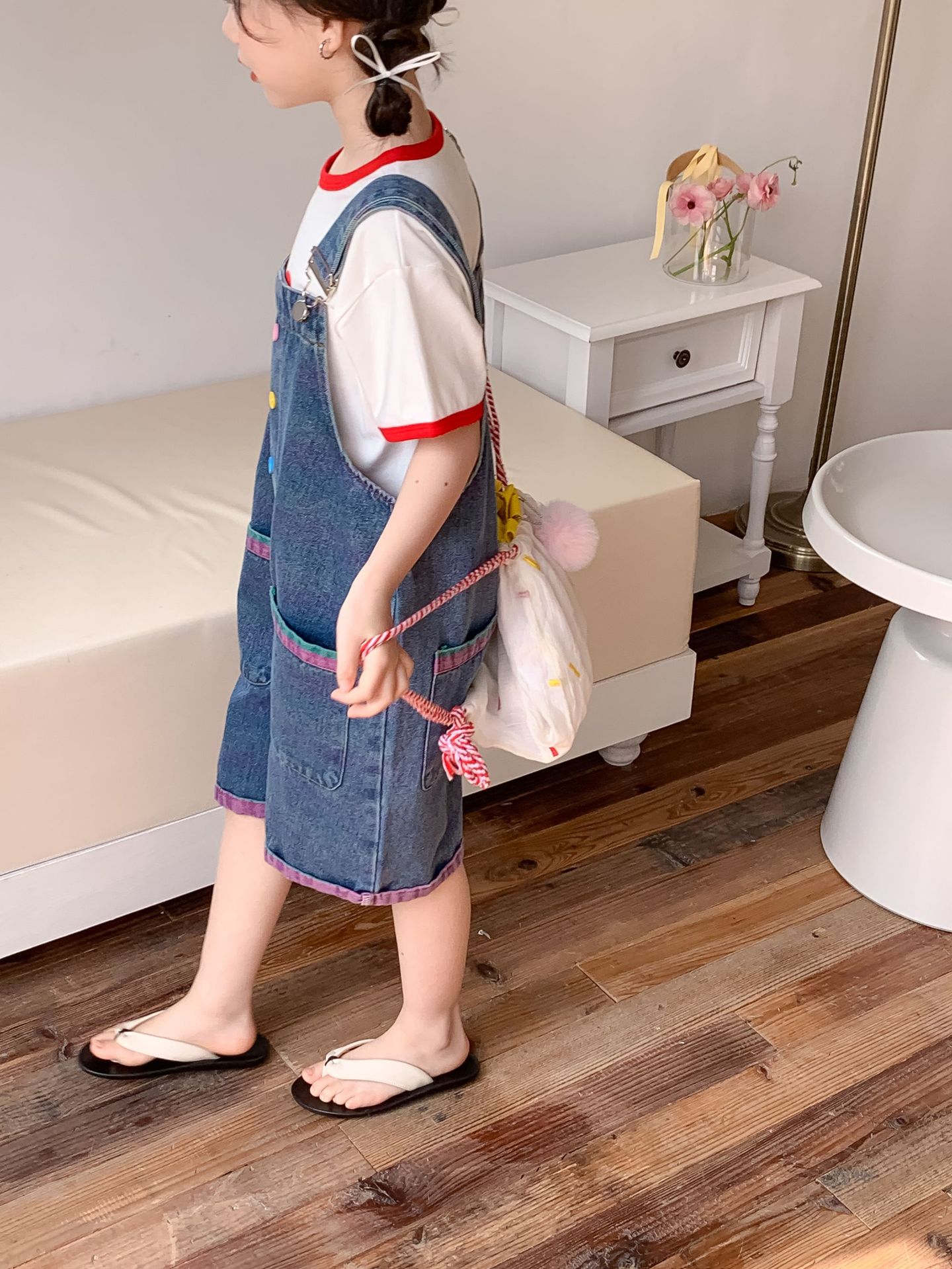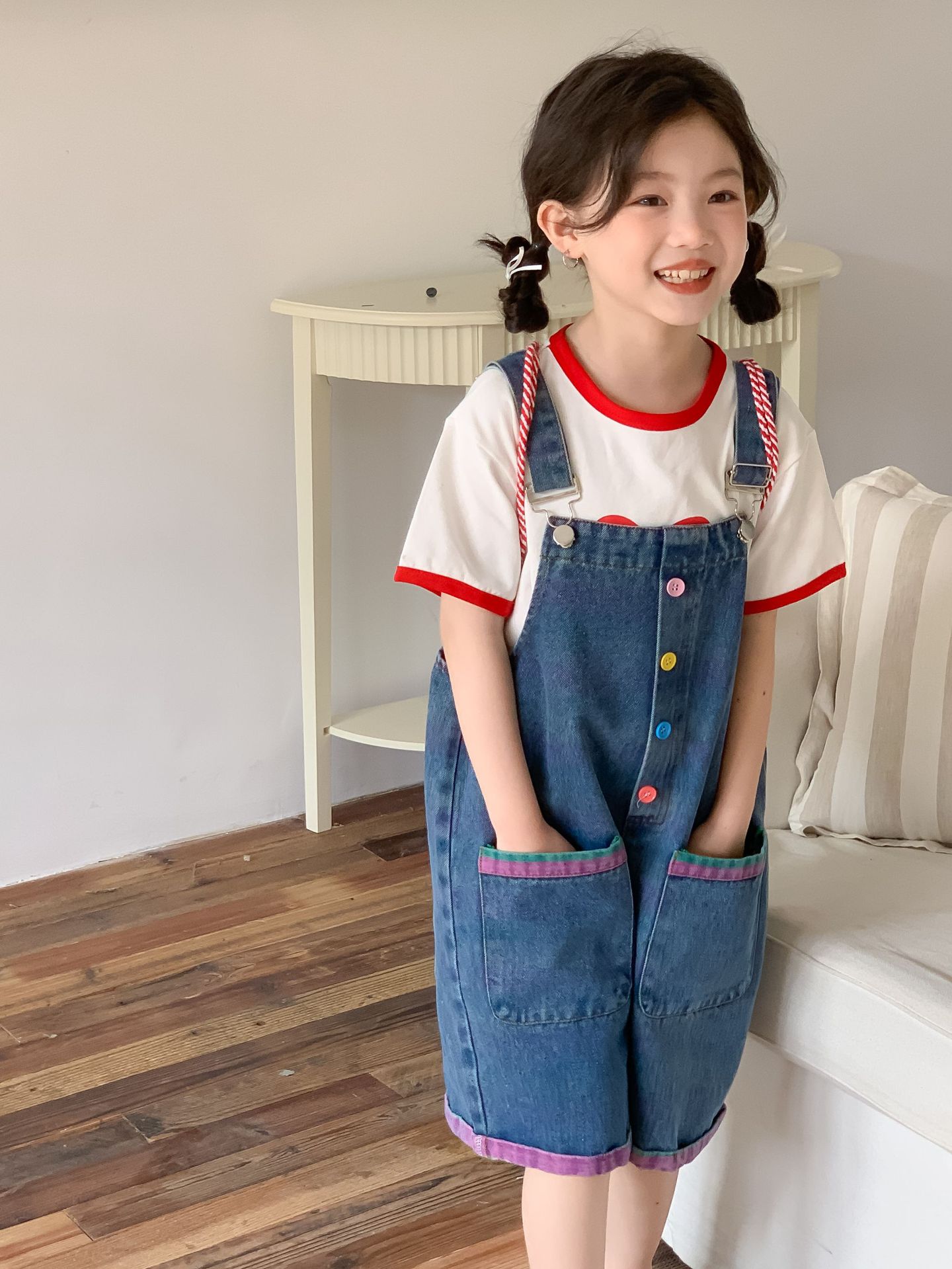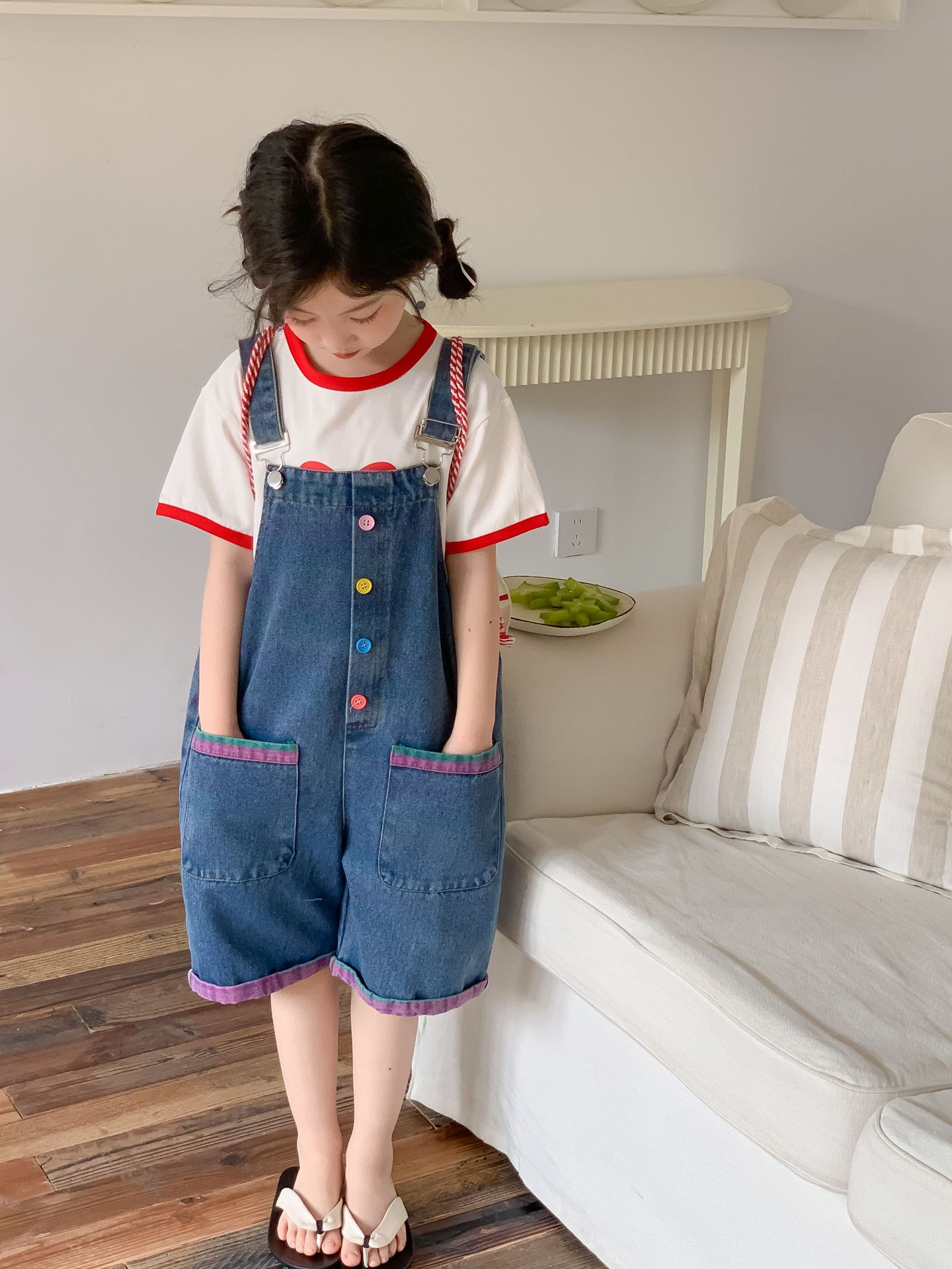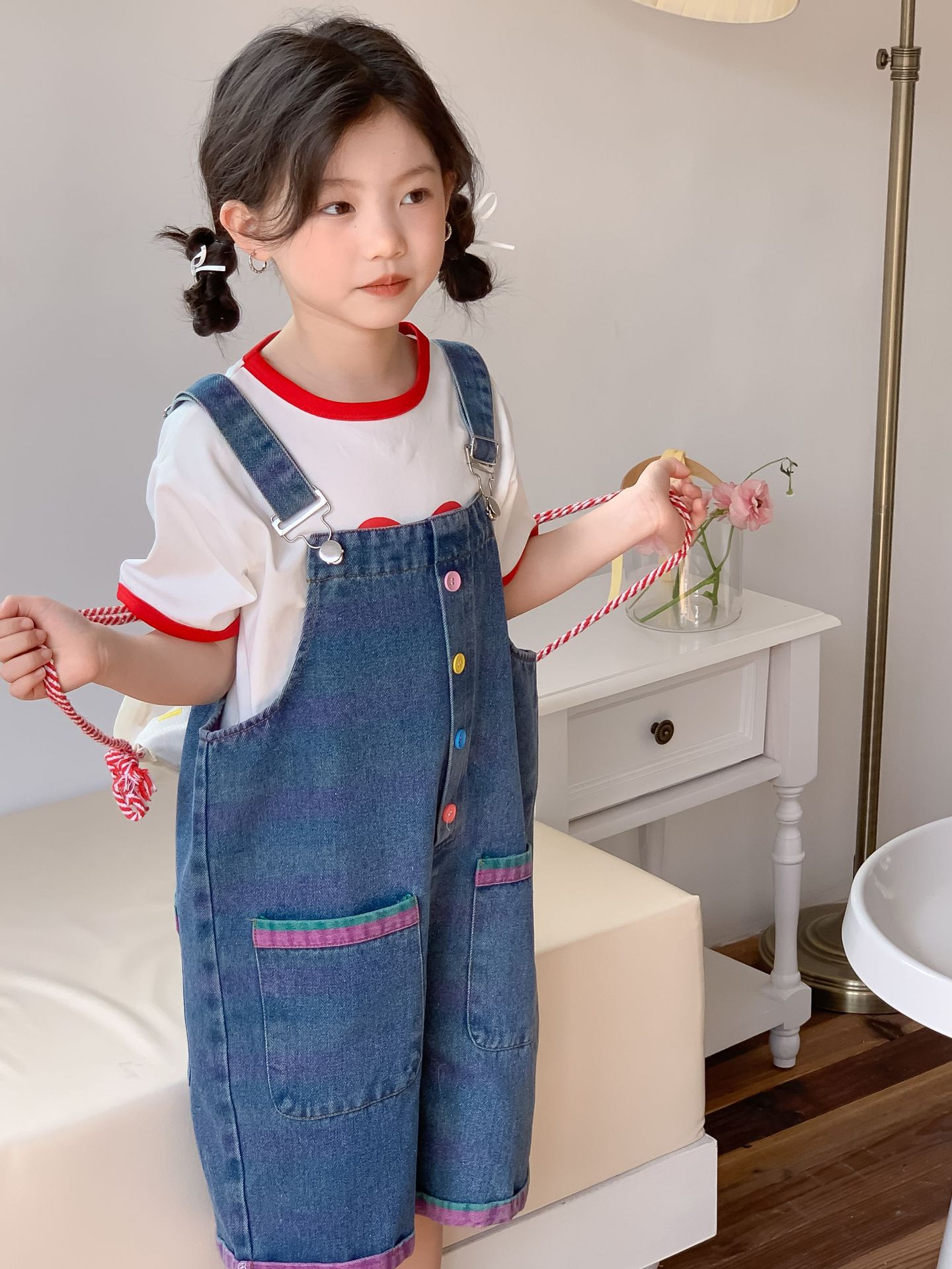 한국 아동복 2024 여름 소녀의 화려한 버튼 컬러 원사 데님 서스펜더 바지 미디어와 큰 어린이 소녀의 트렌디 한 바지스토어 가기