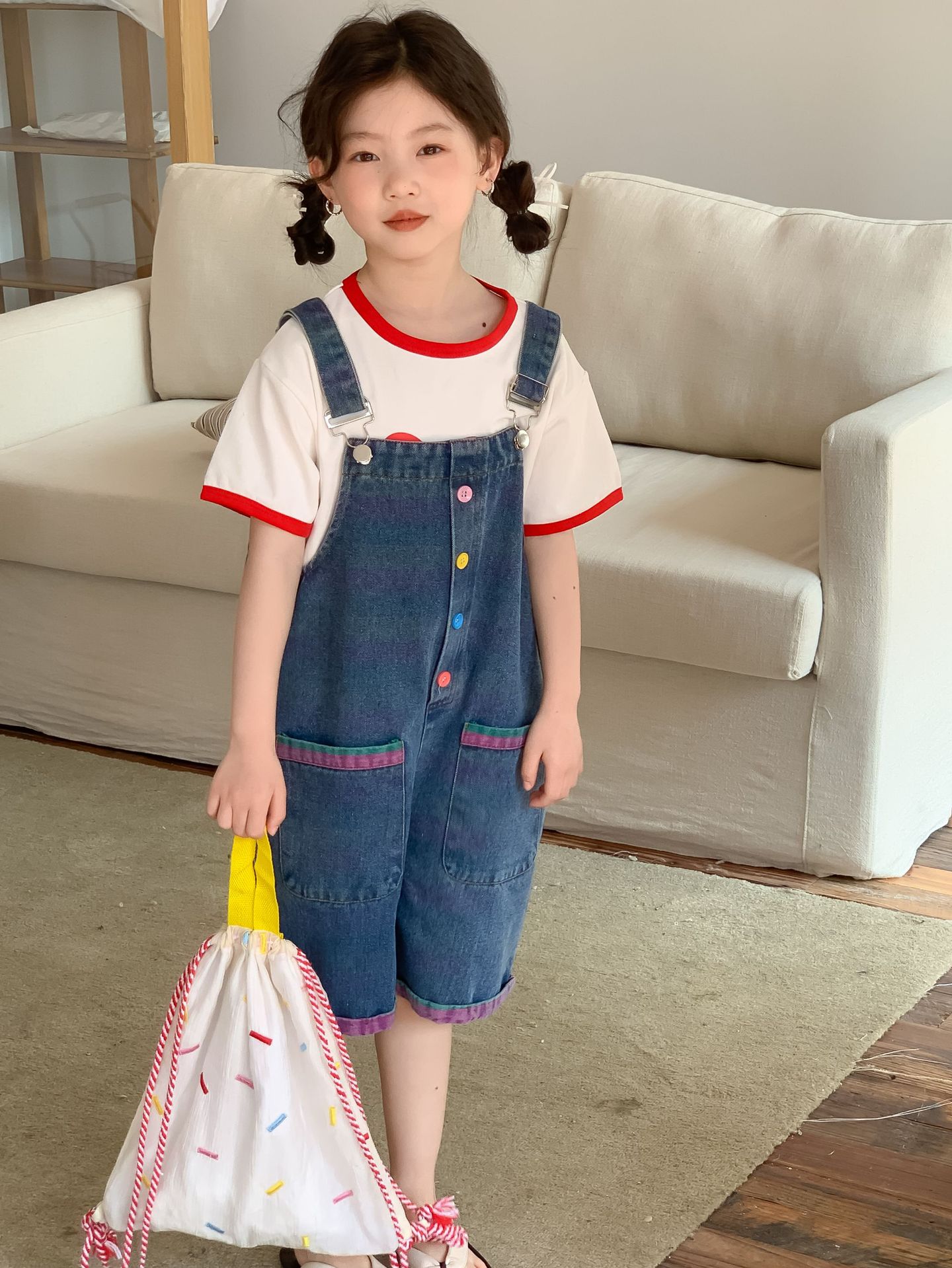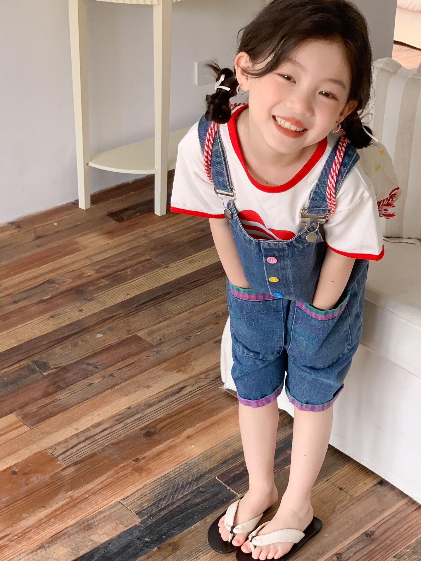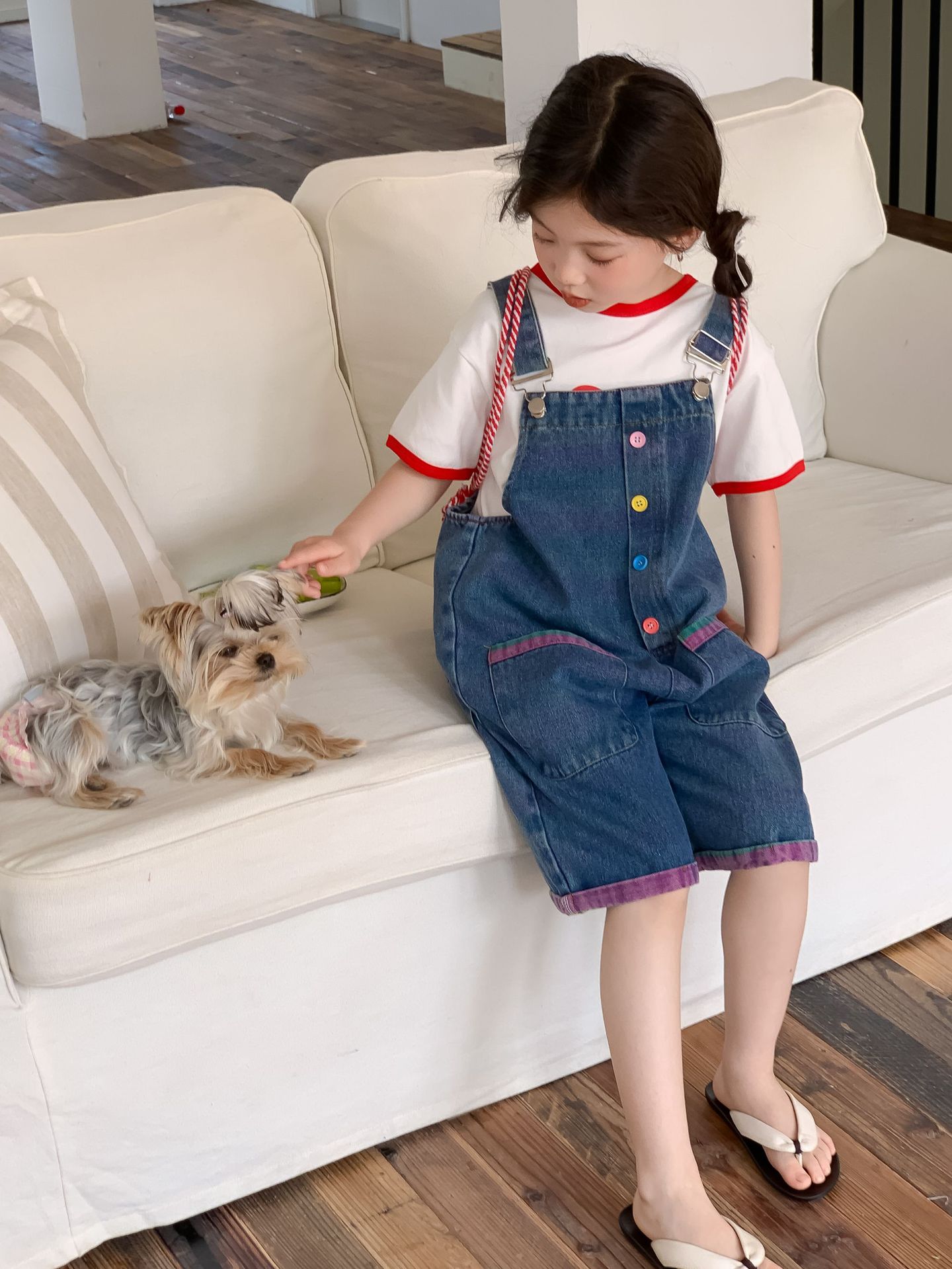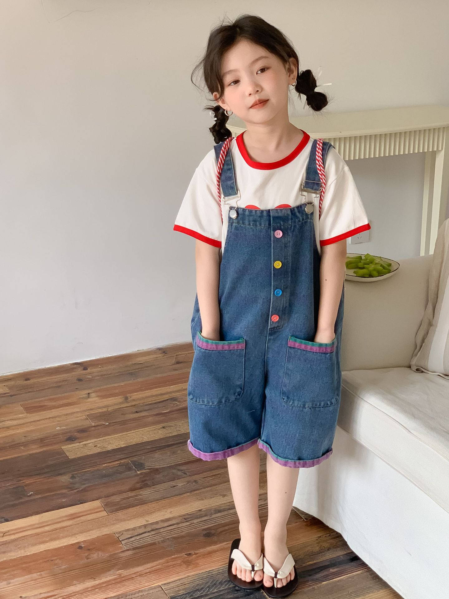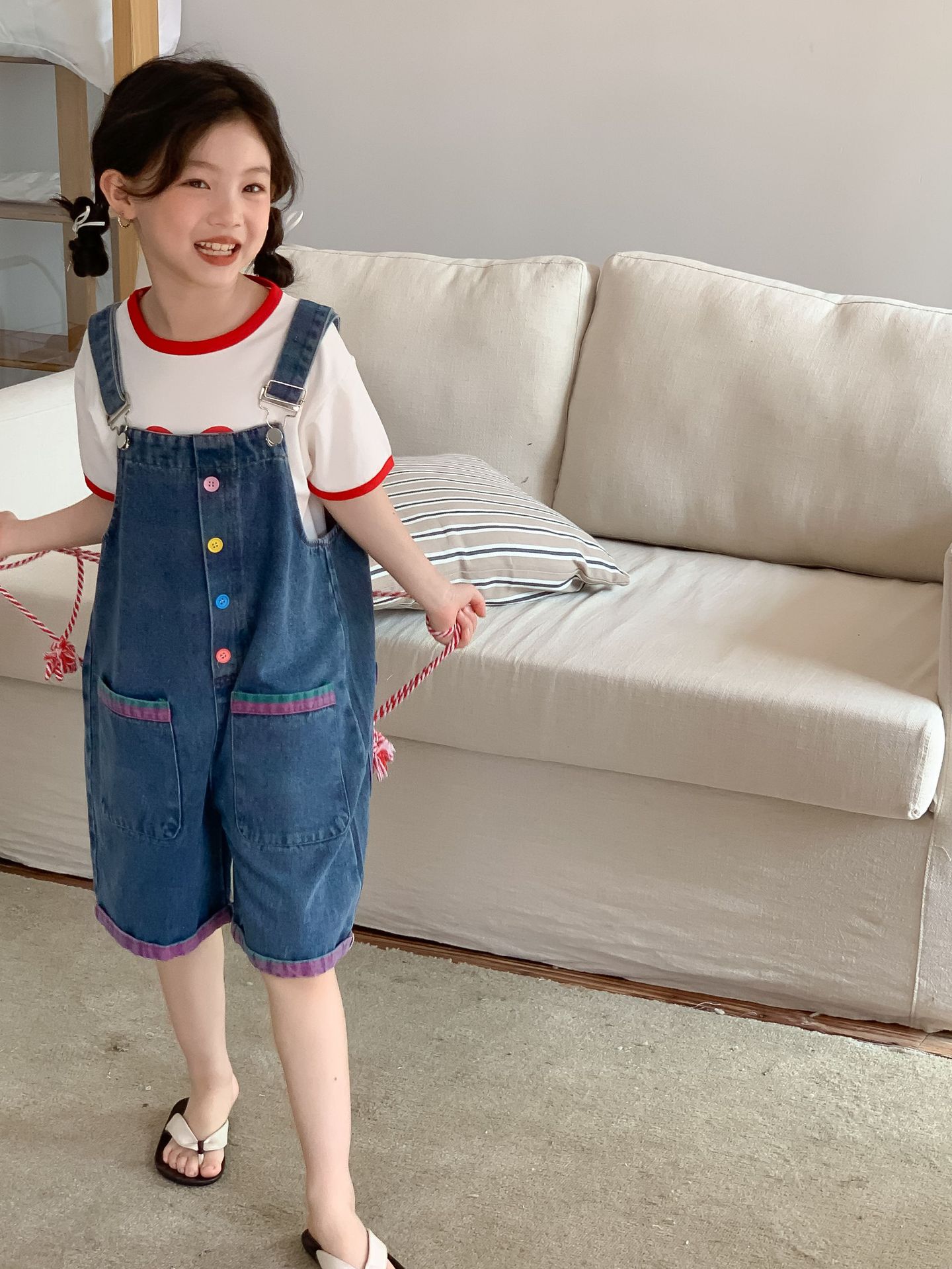 한국 아동복 2024 여름 소녀의 화려한 버튼 컬러 원사 데님 서스펜더 바지 미디어와 큰 어린이 소녀의 트렌디 한 바지스토어 가기