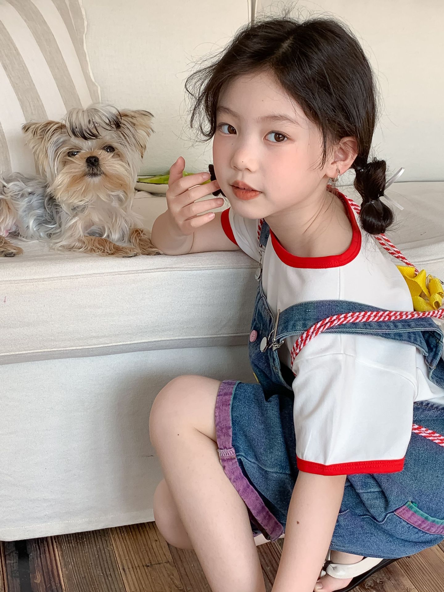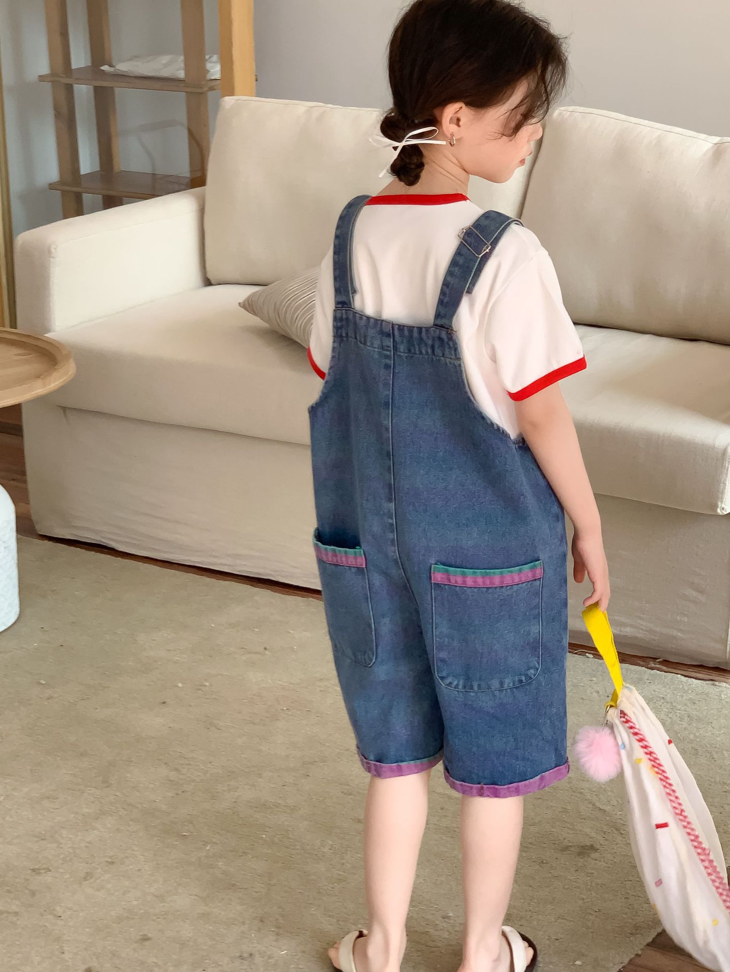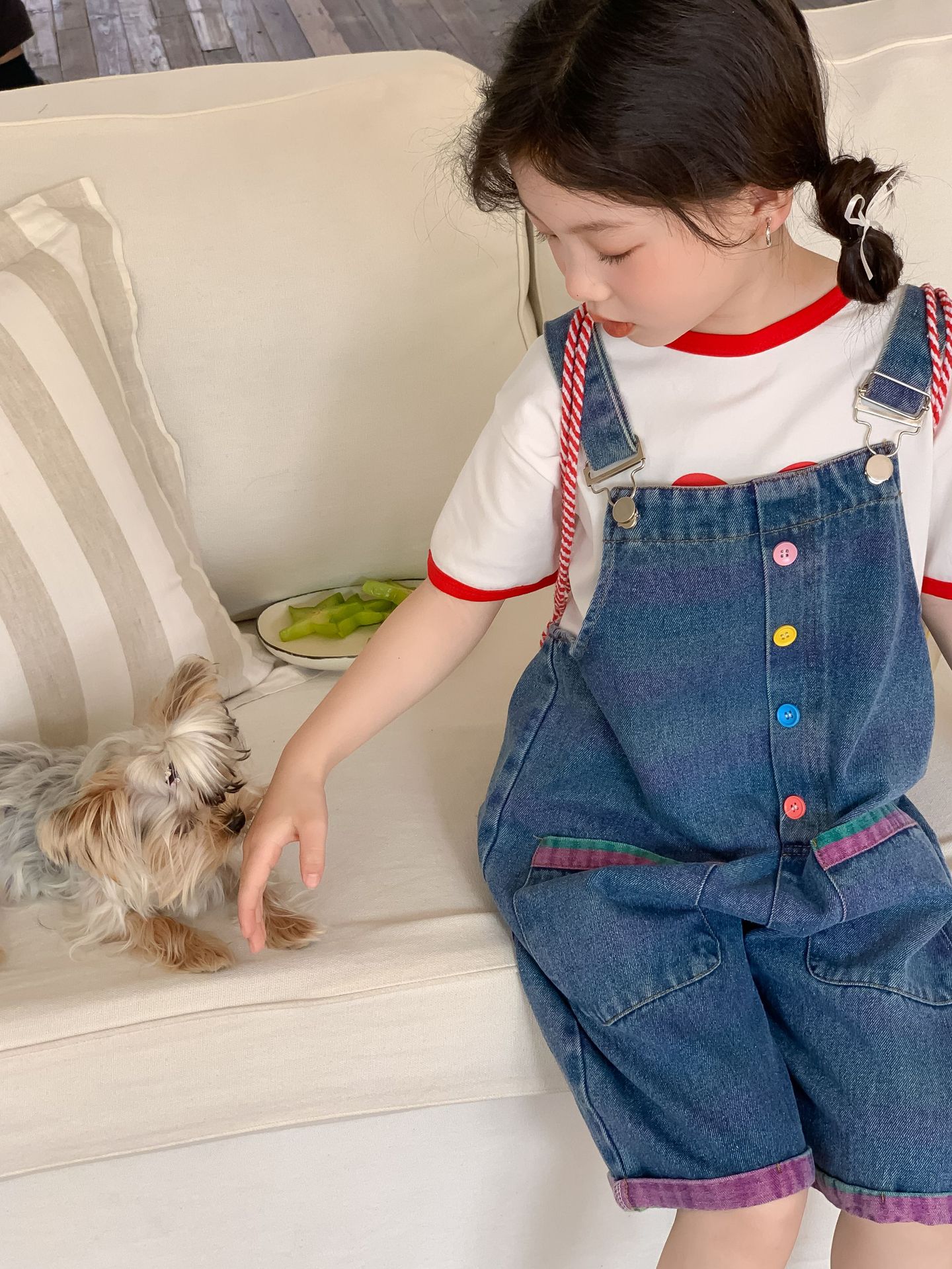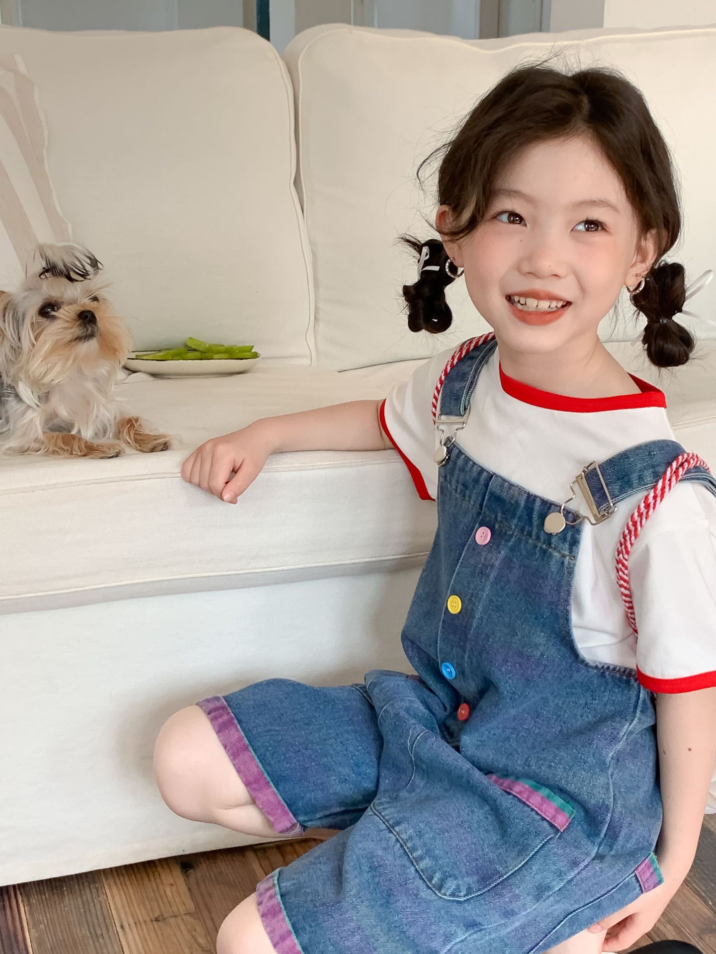 한국 아동복 2024 여름 소녀의 화려한 버튼 컬러 원사 데님 서스펜더 바지 미디어와 큰 어린이 소녀의 트렌디 한 바지스토어 가기