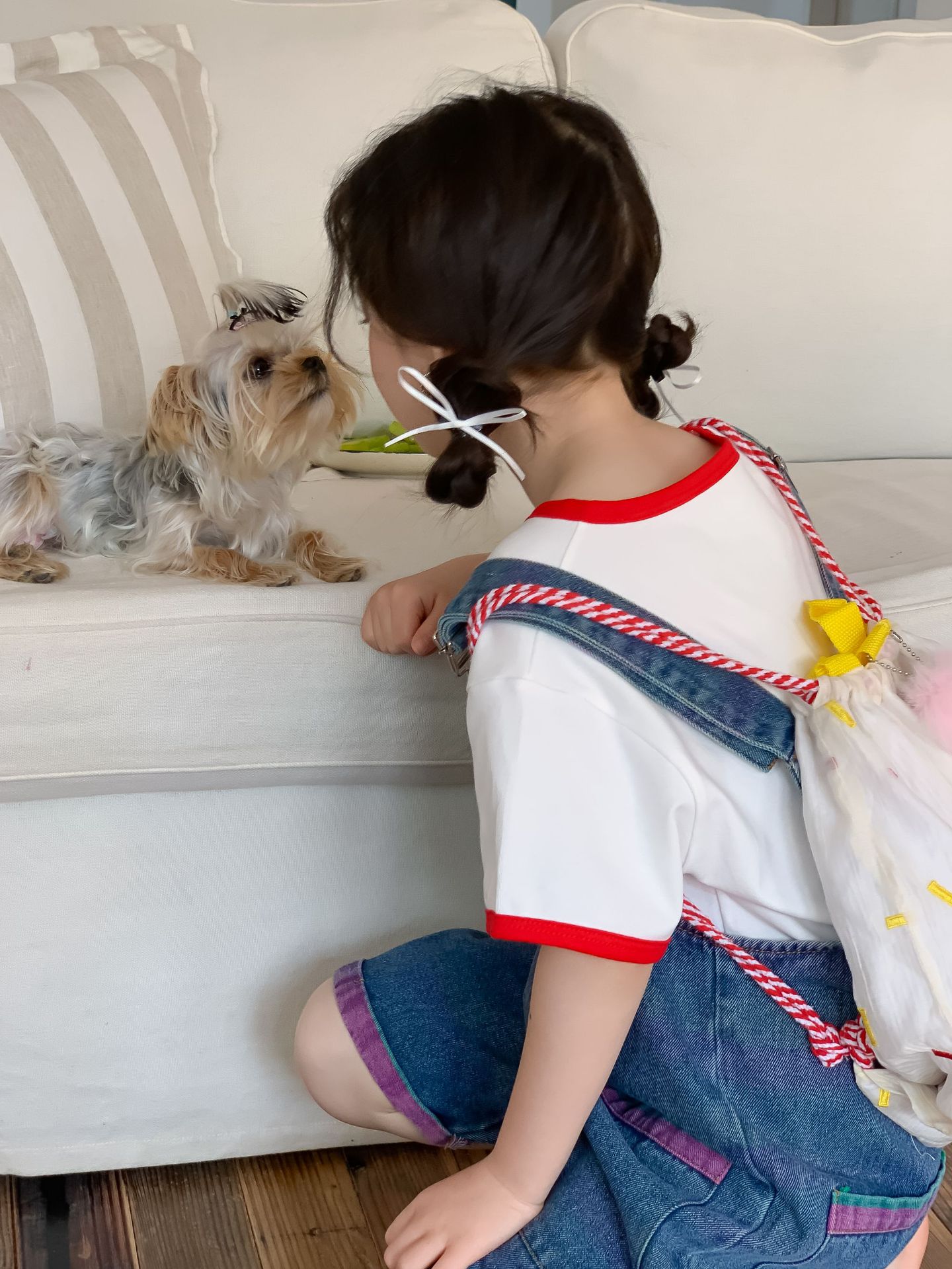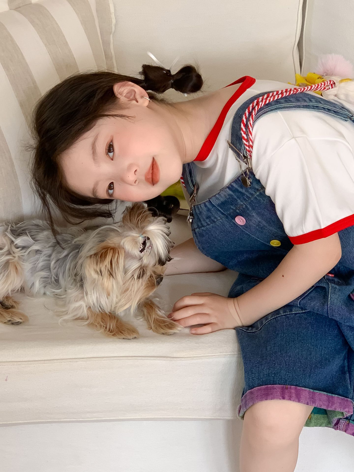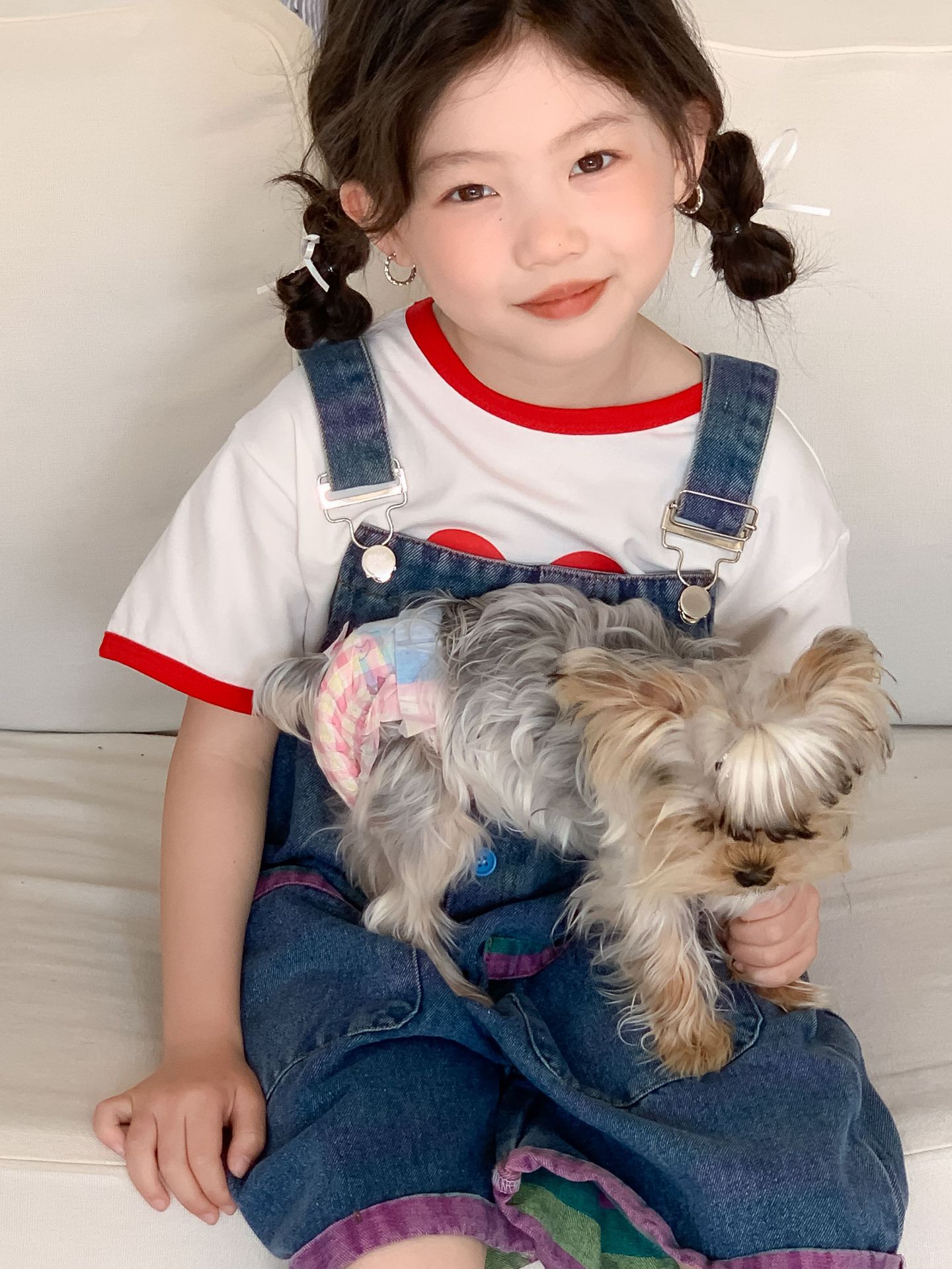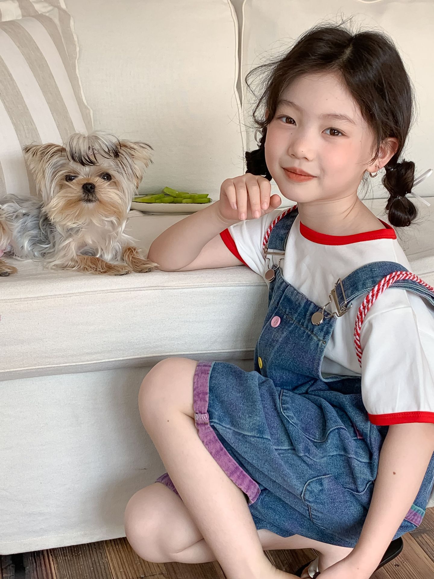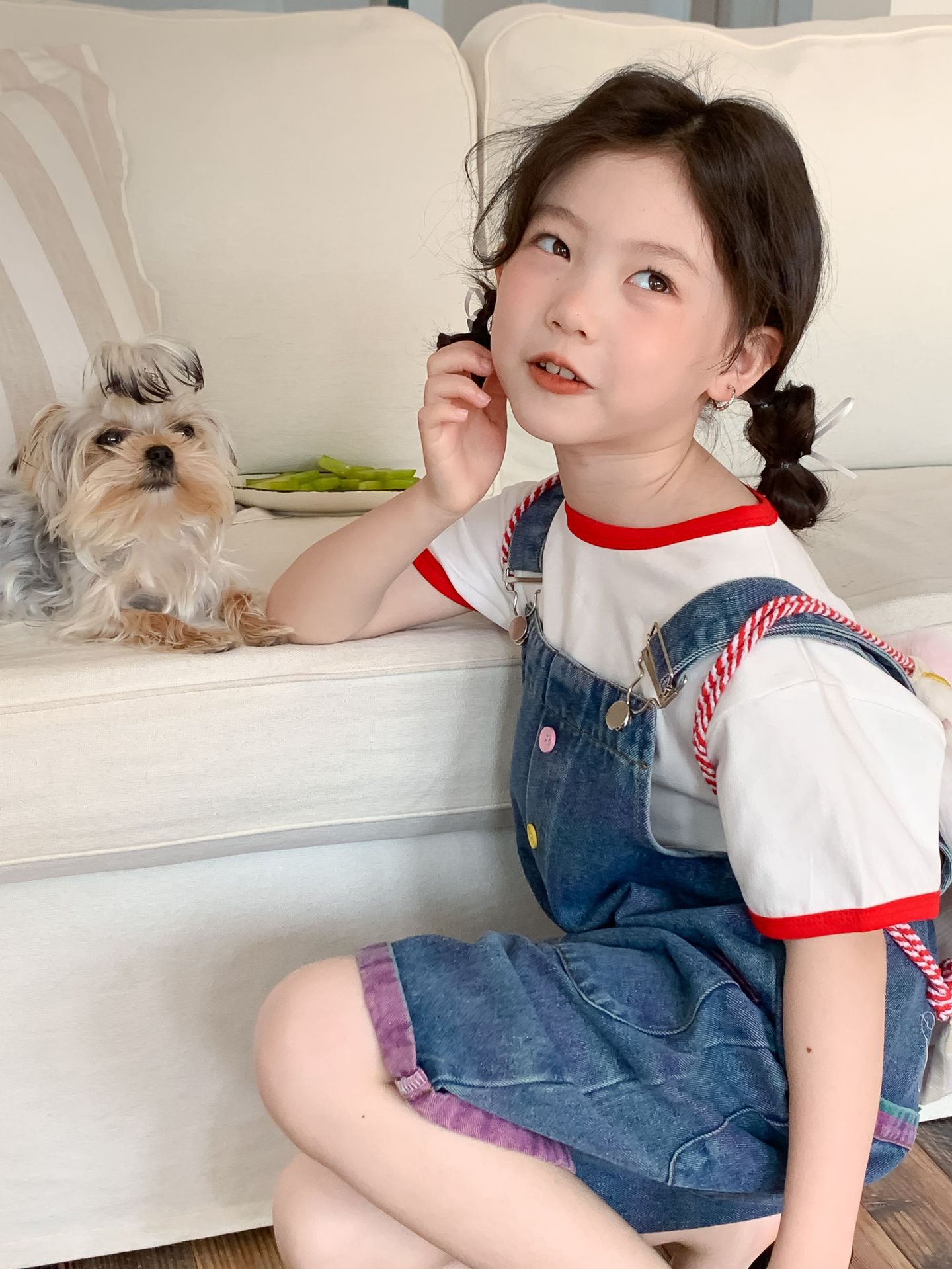 한국 아동복 2024 여름 소녀의 화려한 버튼 컬러 원사 데님 서스펜더 바지 미디어와 큰 어린이 소녀의 트렌디 한 바지스토어 가기