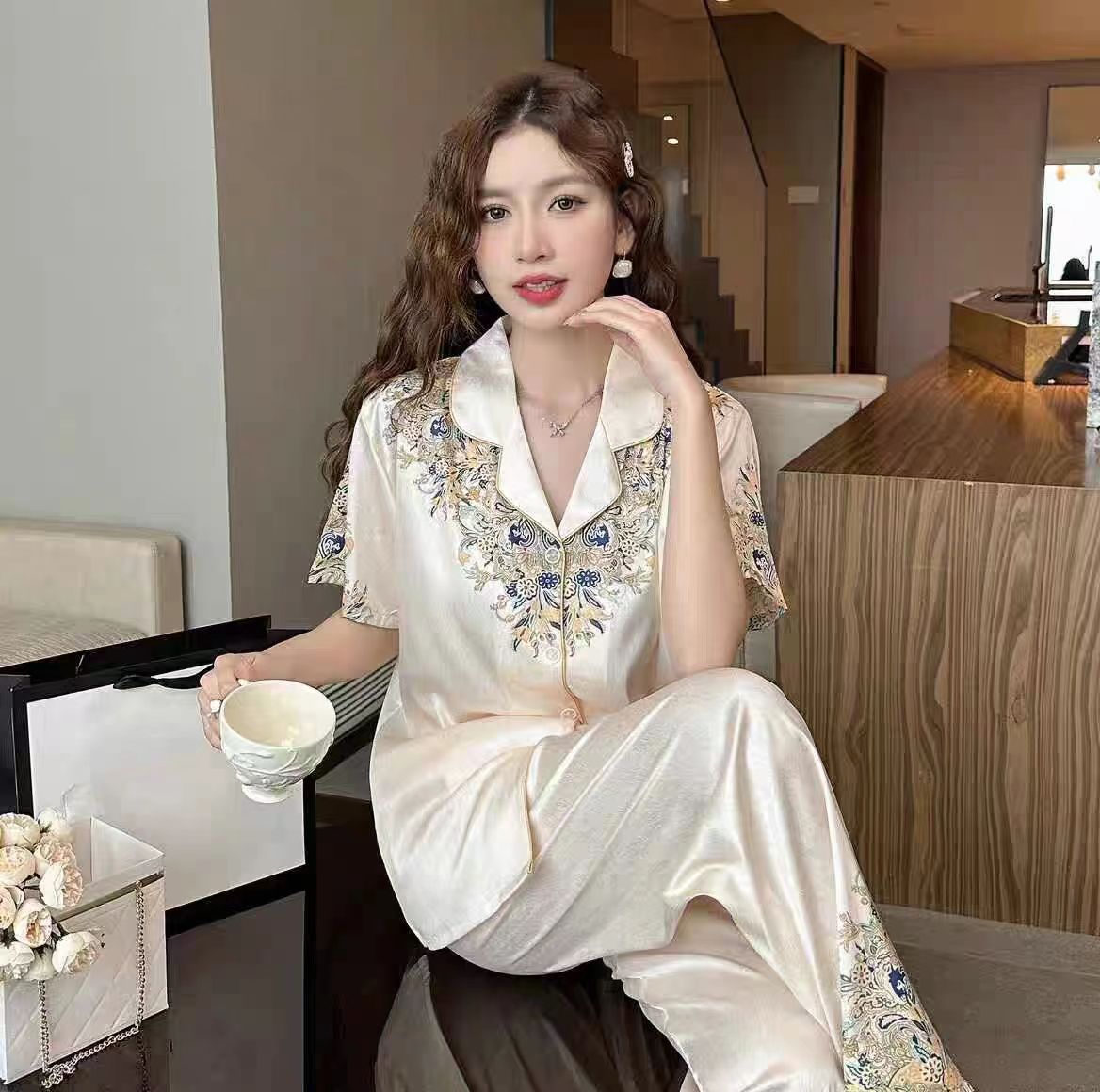 상하이 스토리 라이트 럭셔리 실크 파자마 여성용 긴팔 실크 홈 의류 외부 착용 새틴 중국 스타일 국가 스타일 인터넷 인기 스타일스토어 가기