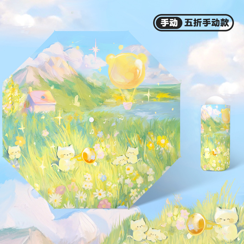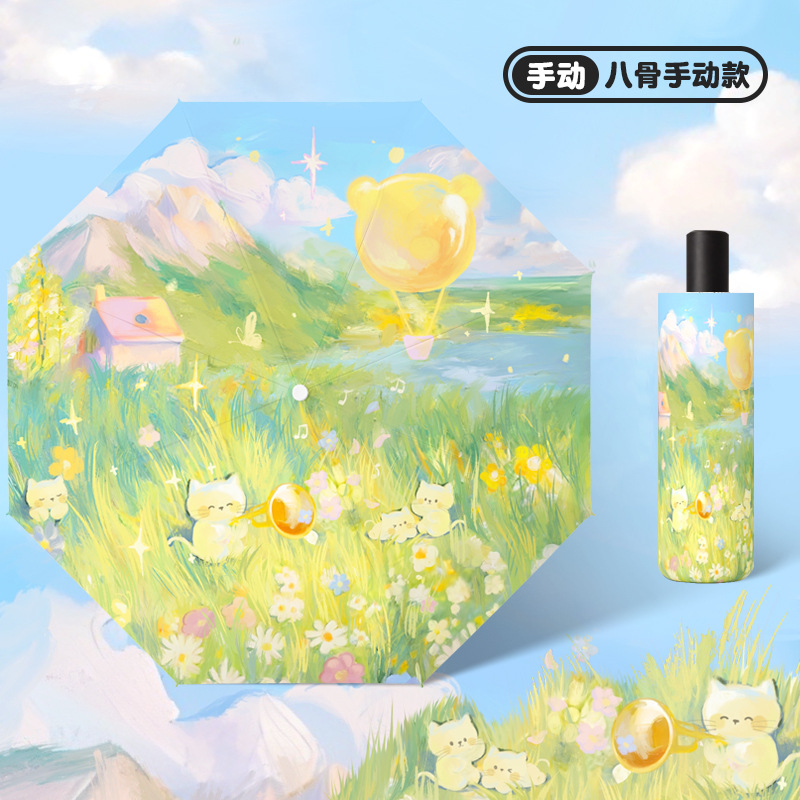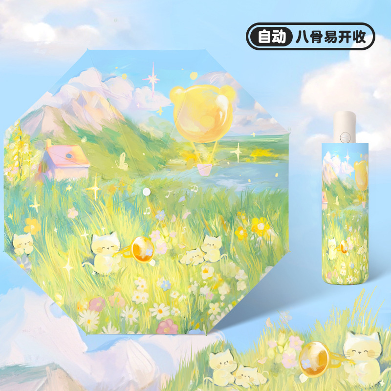낭만적 인 열기구 검은 접착제 태양 보호 우산 만화 자동 어린이 비와 비 반동 방지 3 배 태양 우산 안티 우산