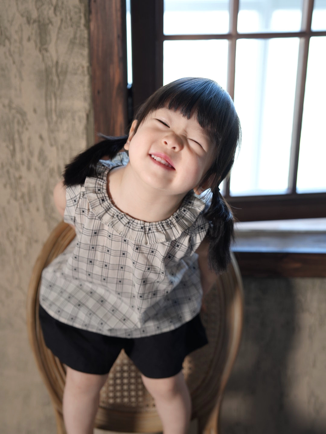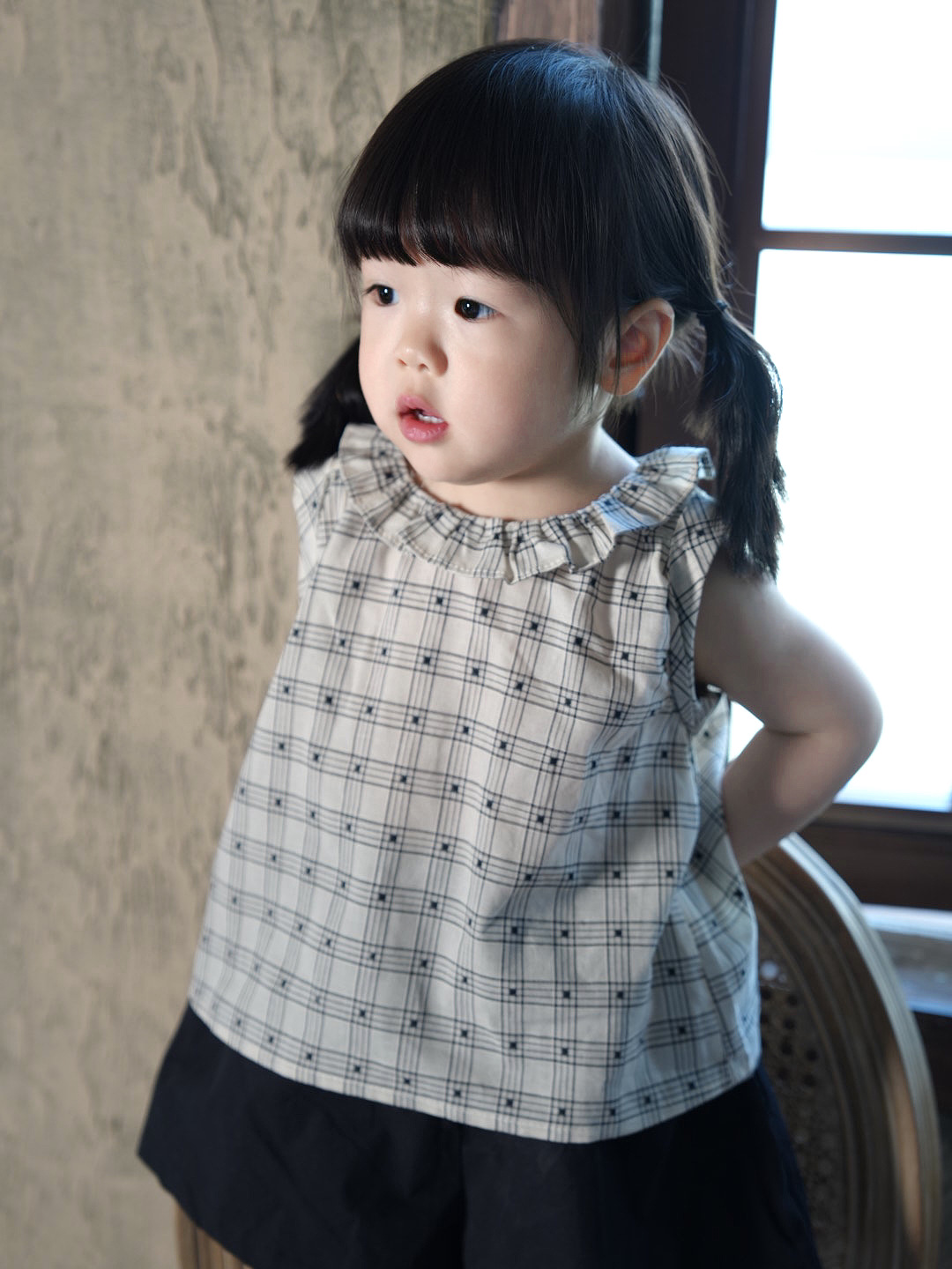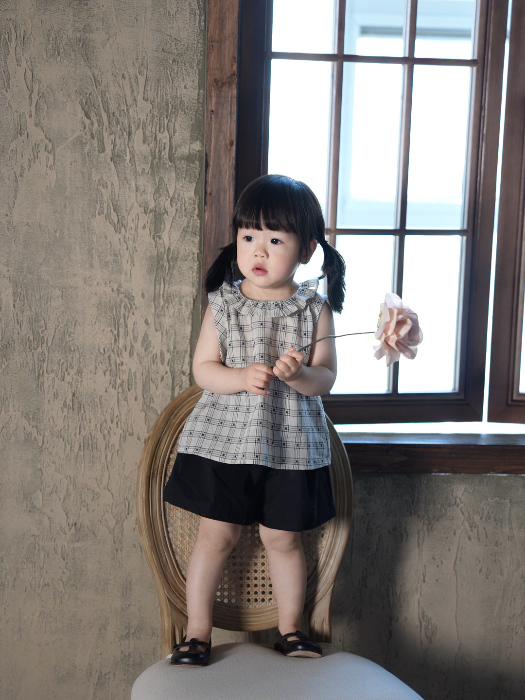 스팟 일본 여아 정장 BENE 같은 스타일의 민소매 컷 패턴 원사 염색 체크 무늬 셔츠 땀을 흡수하는 워싱 코튼 반바지