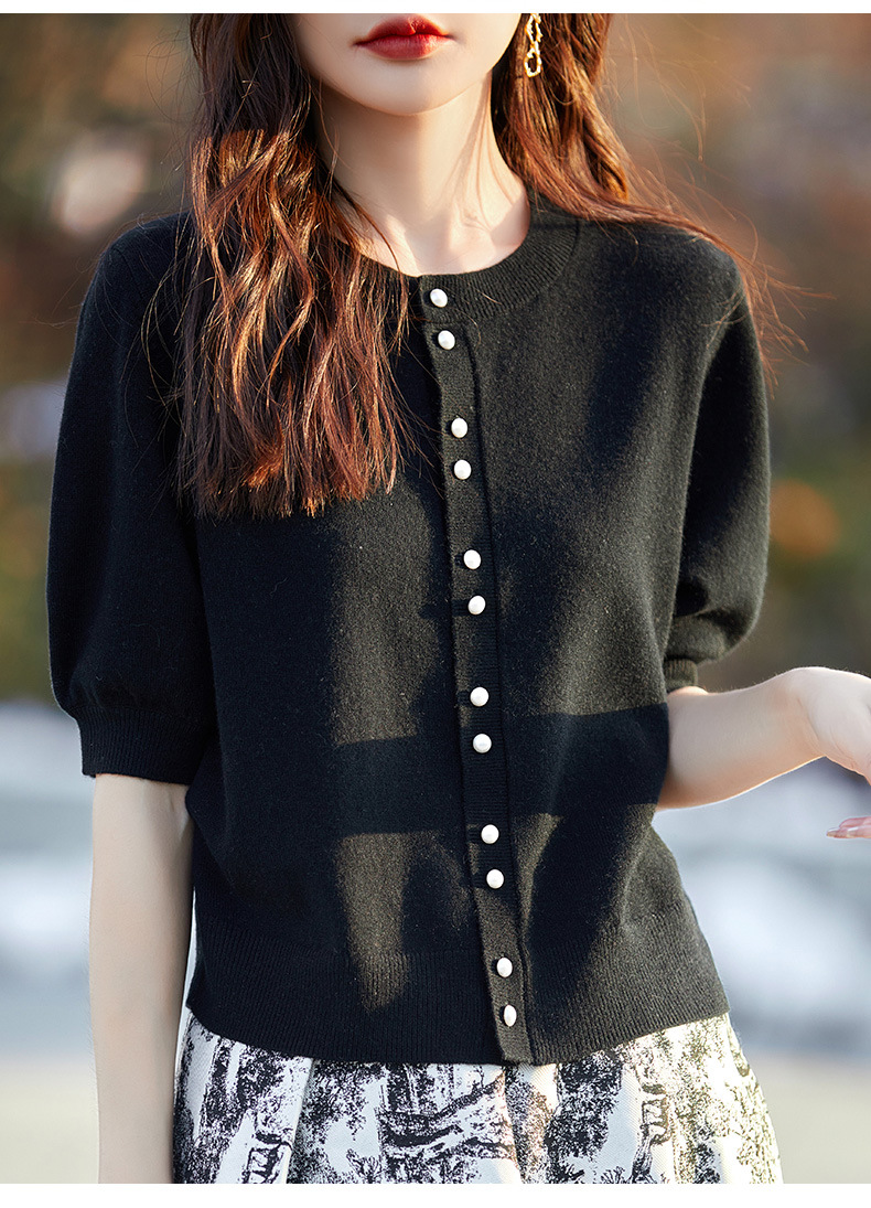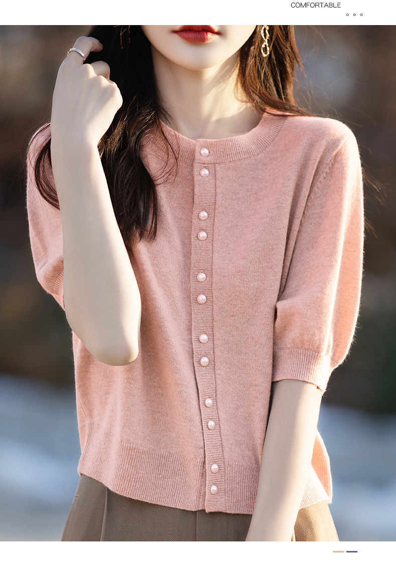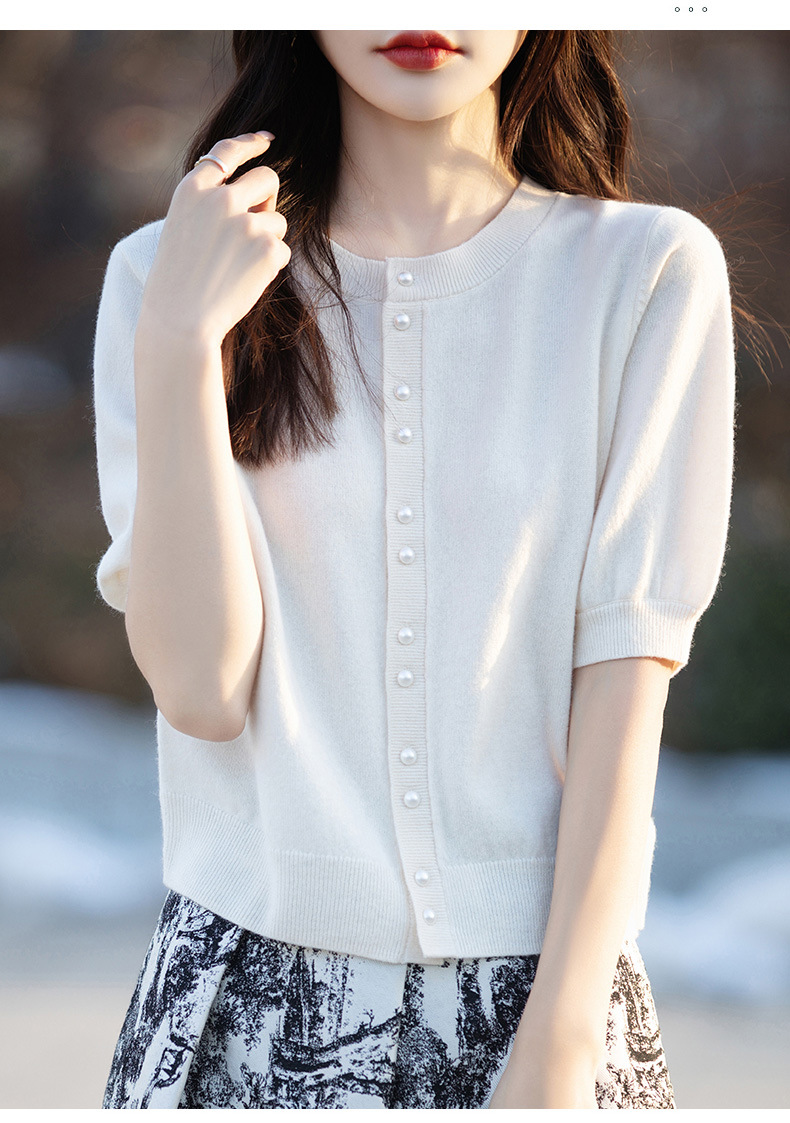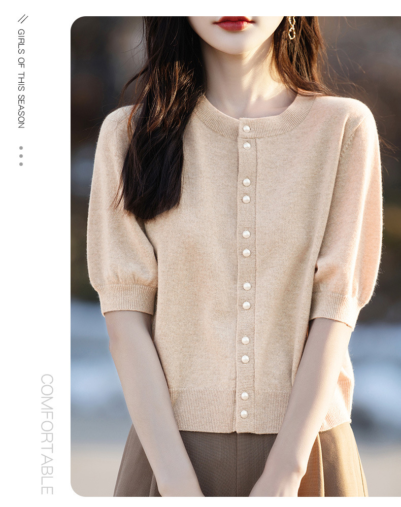 레트로 라운드 넥 펄 버클 반팔 스웨터 여성의 여름 얇은 디자인 슬림 핏 짧은 슬리밍 카디건 탑스토어 가기