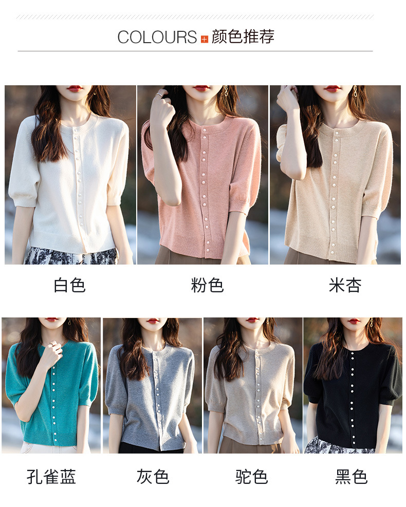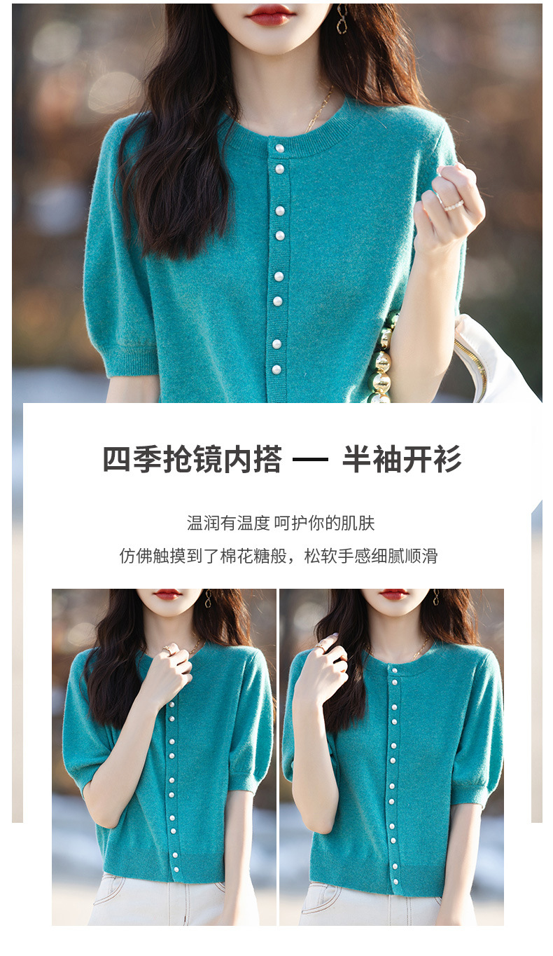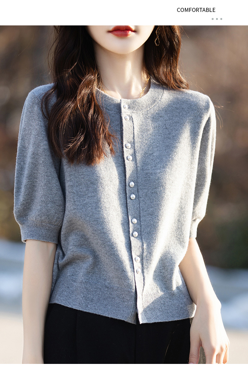 레트로 라운드 넥 펄 버클 반팔 스웨터 여성의 여름 얇은 디자인 슬림 핏 짧은 슬리밍 카디건 탑스토어 가기