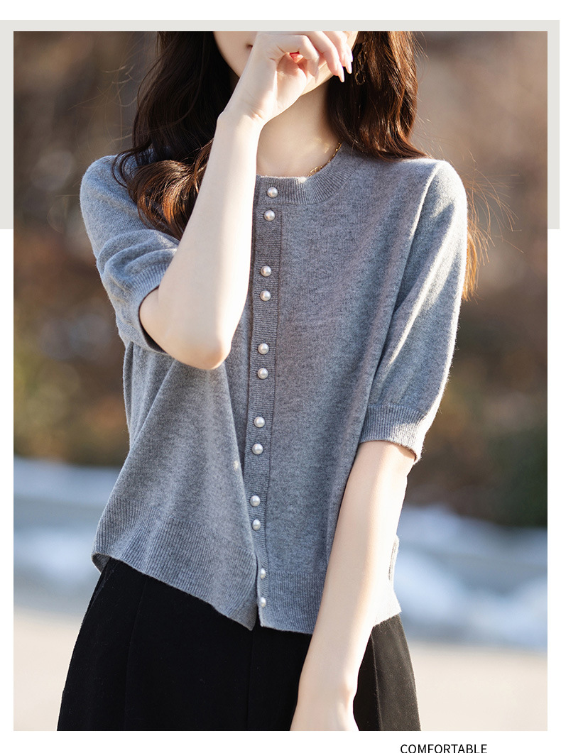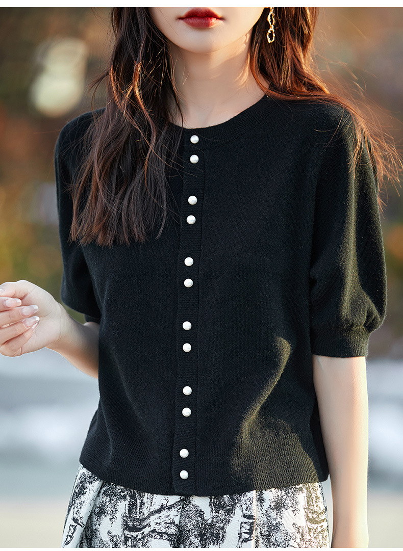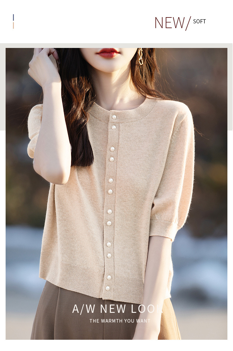 레트로 라운드 넥 펄 버클 반팔 스웨터 여성의 여름 얇은 디자인 슬림 핏 짧은 슬리밍 카디건 탑