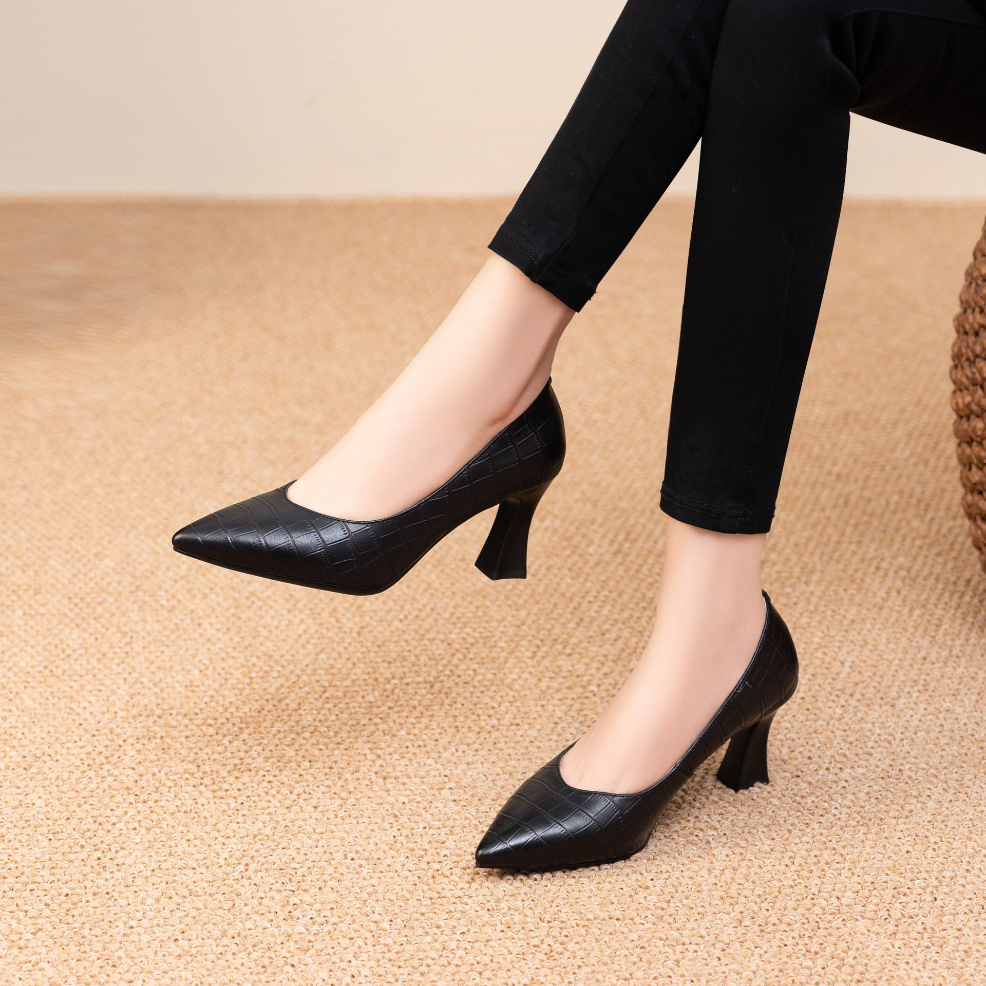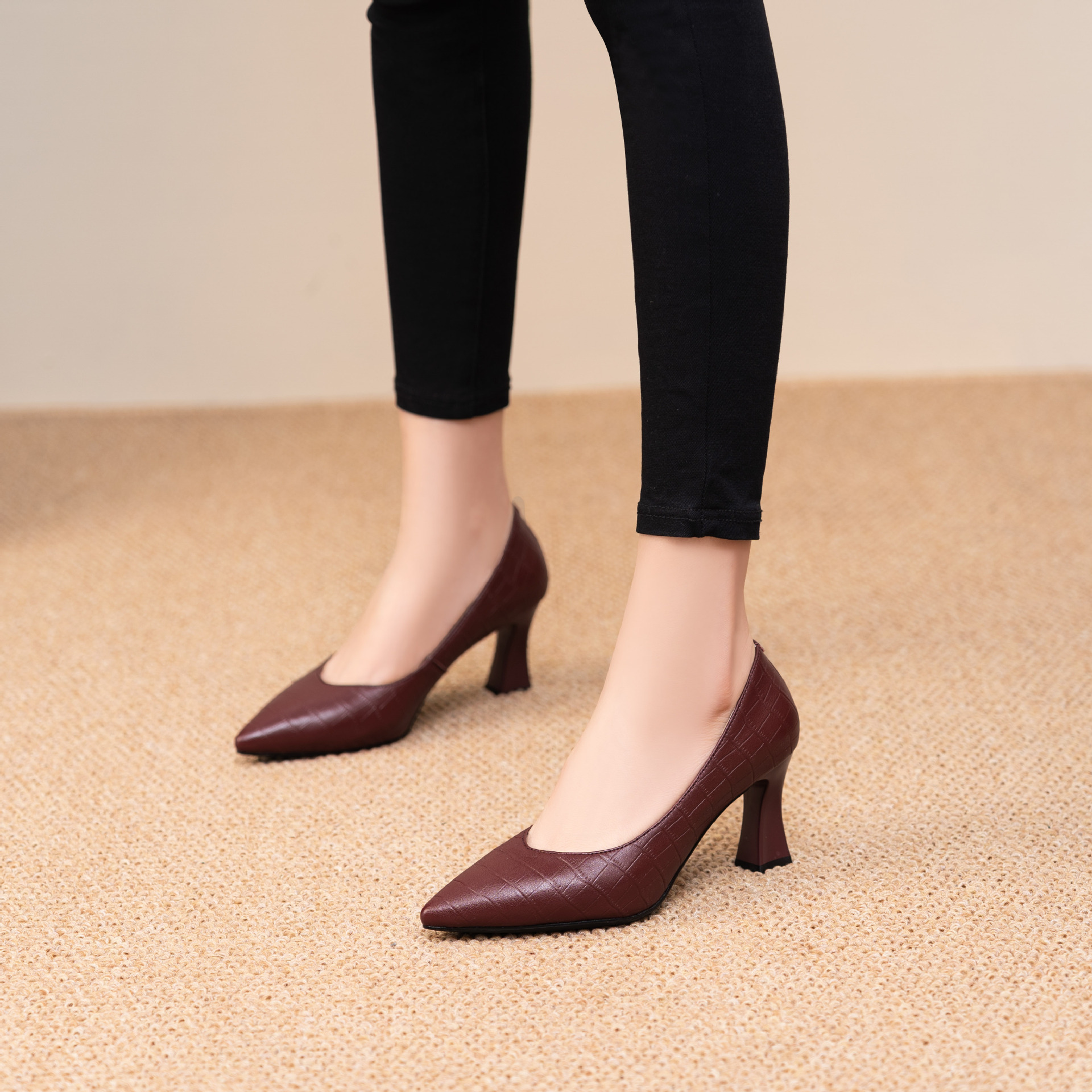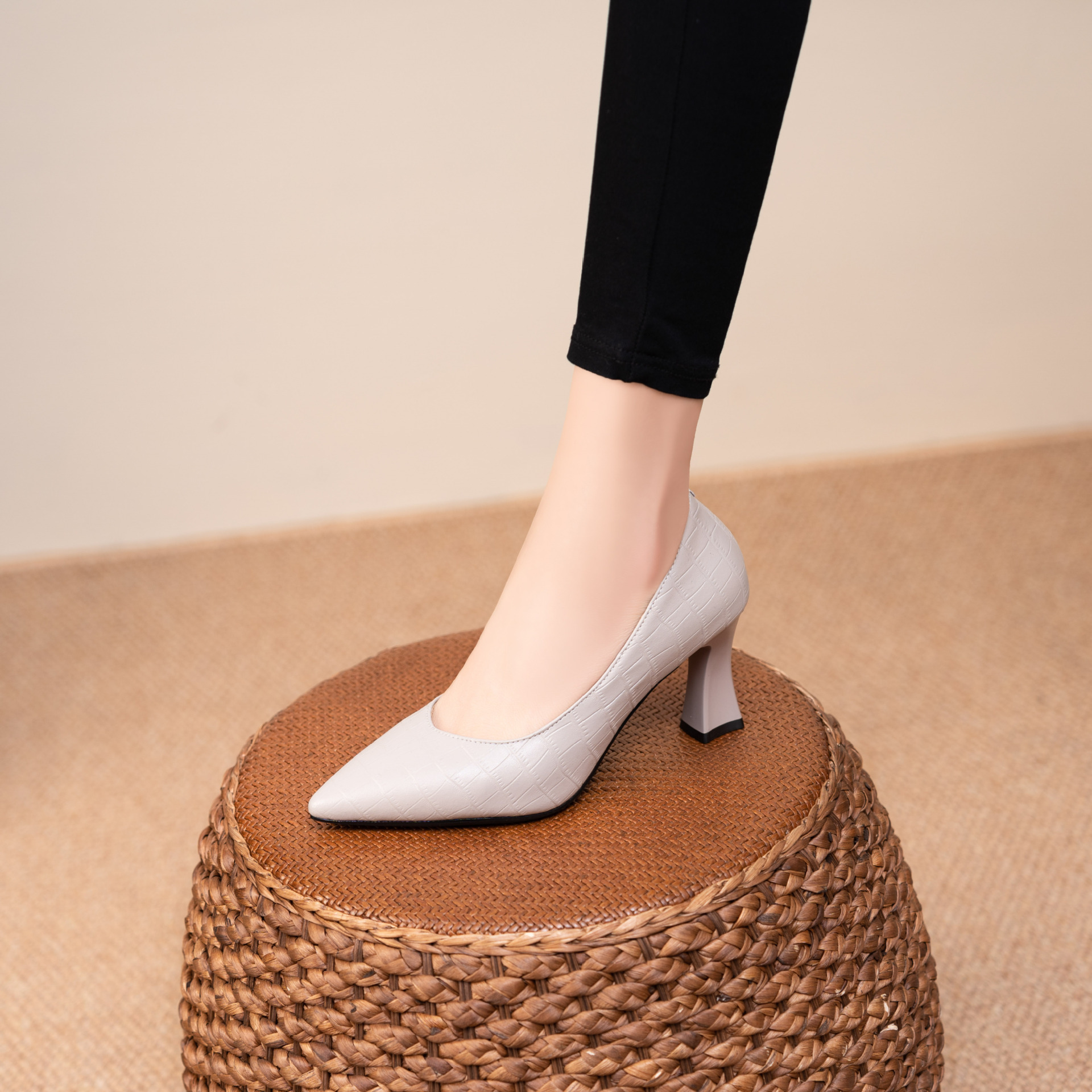 봄과 가을 2025 이른 봄 얕은 입 우아한 뾰족한 하이힐 여성용 가죽 신발 유행 올매치 소프트 가죽 얇은 발 뒤꿈치 싱글 레이어 신발스토어 가기