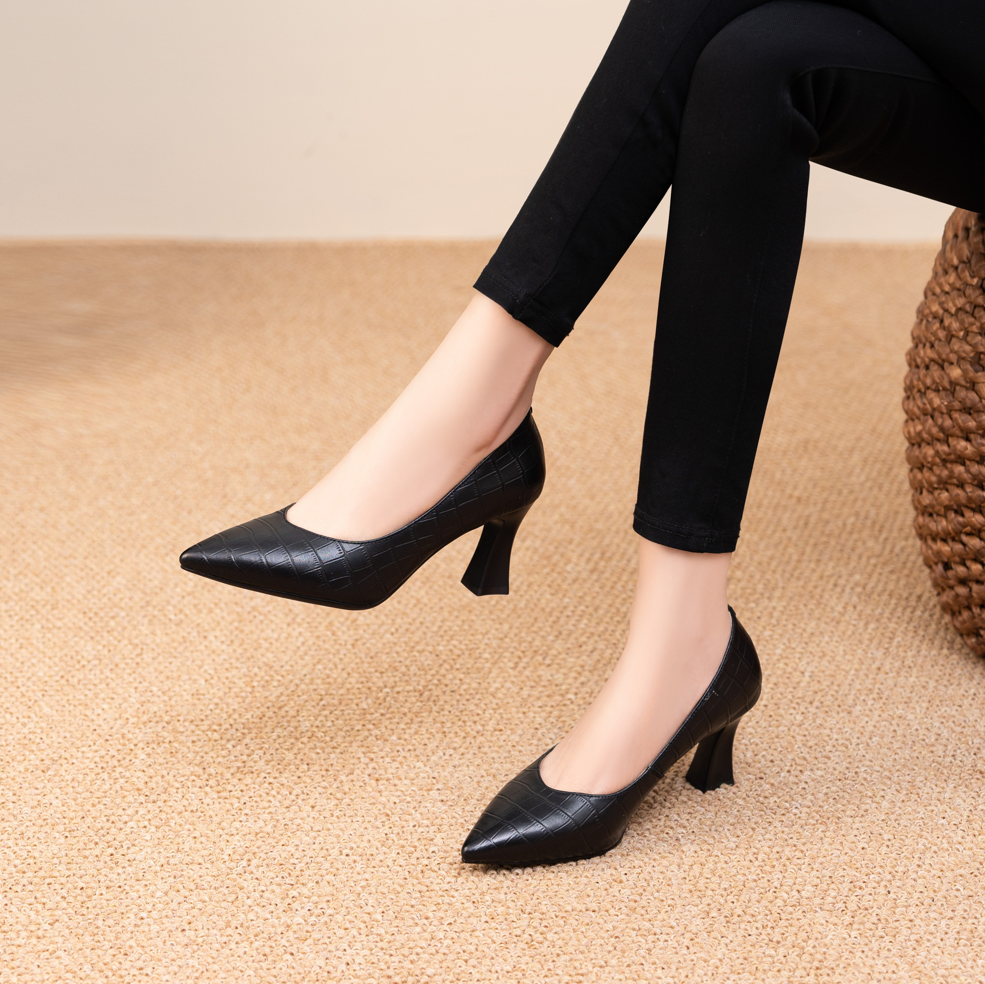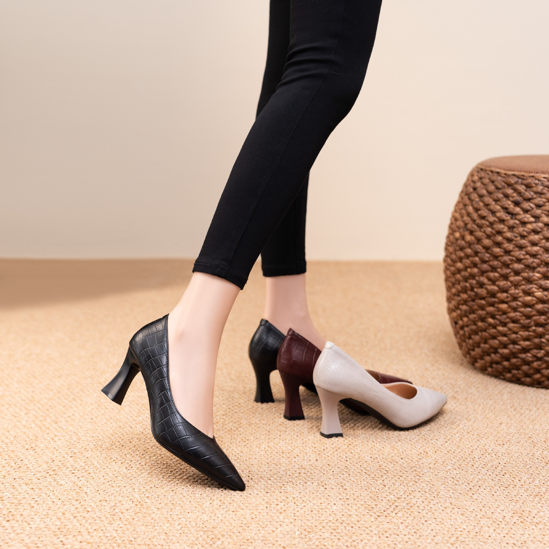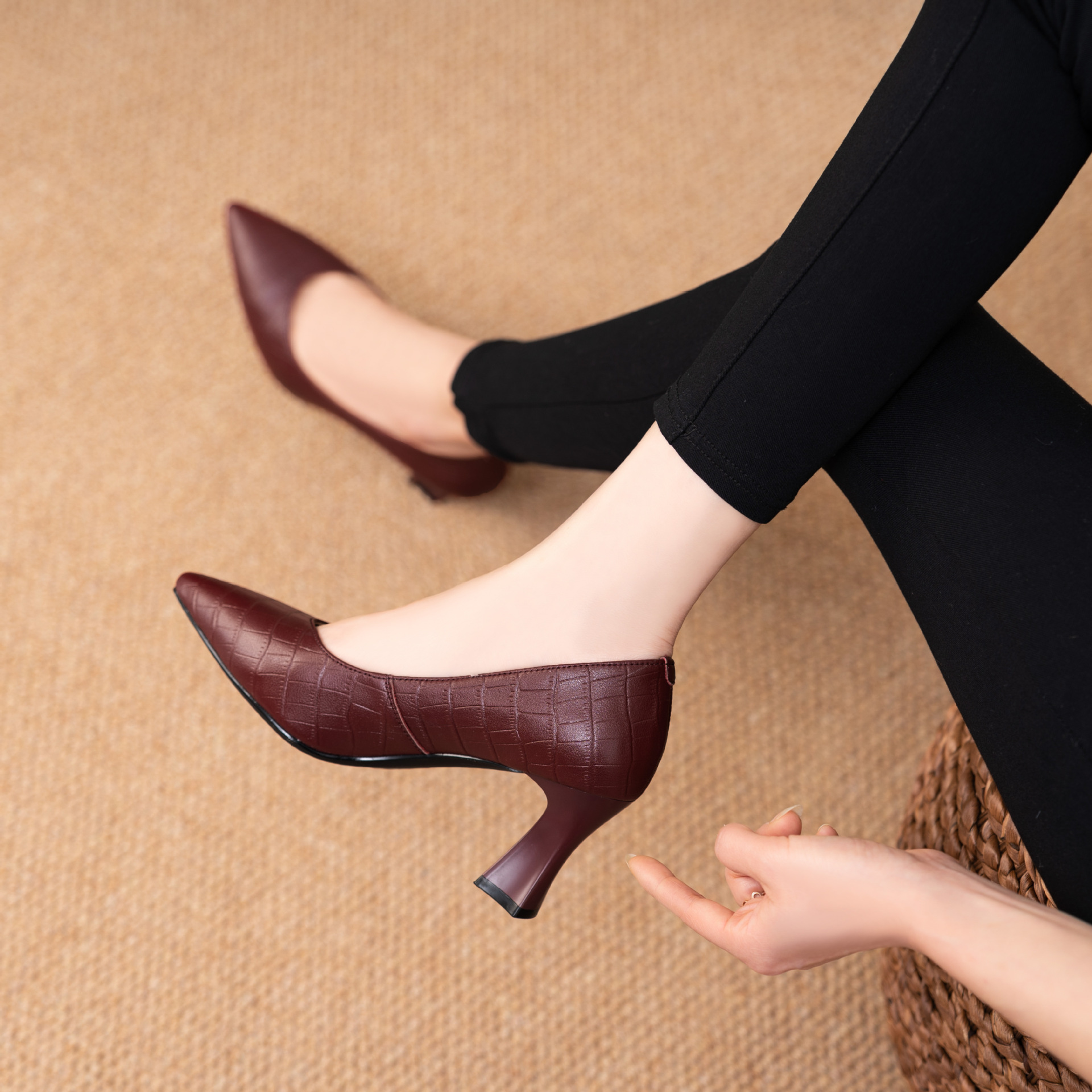 봄과 가을 2025 이른 봄 얕은 입 우아한 뾰족한 하이힐 여성용 가죽 신발 유행 올매치 소프트 가죽 얇은 발 뒤꿈치 싱글 레이어 신발스토어 가기