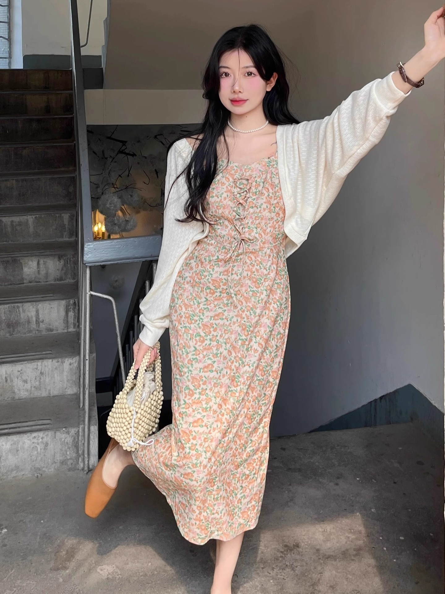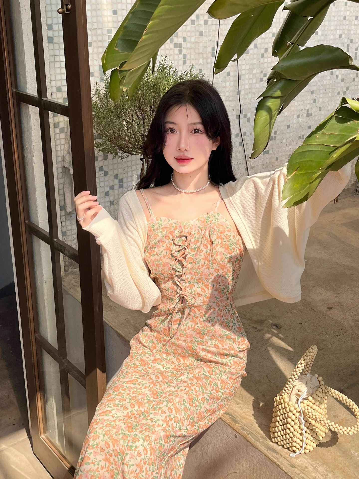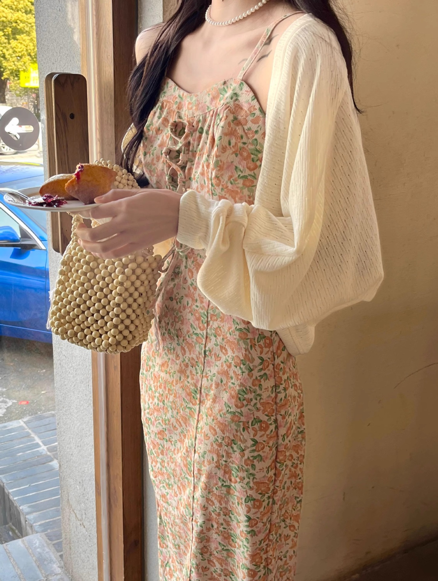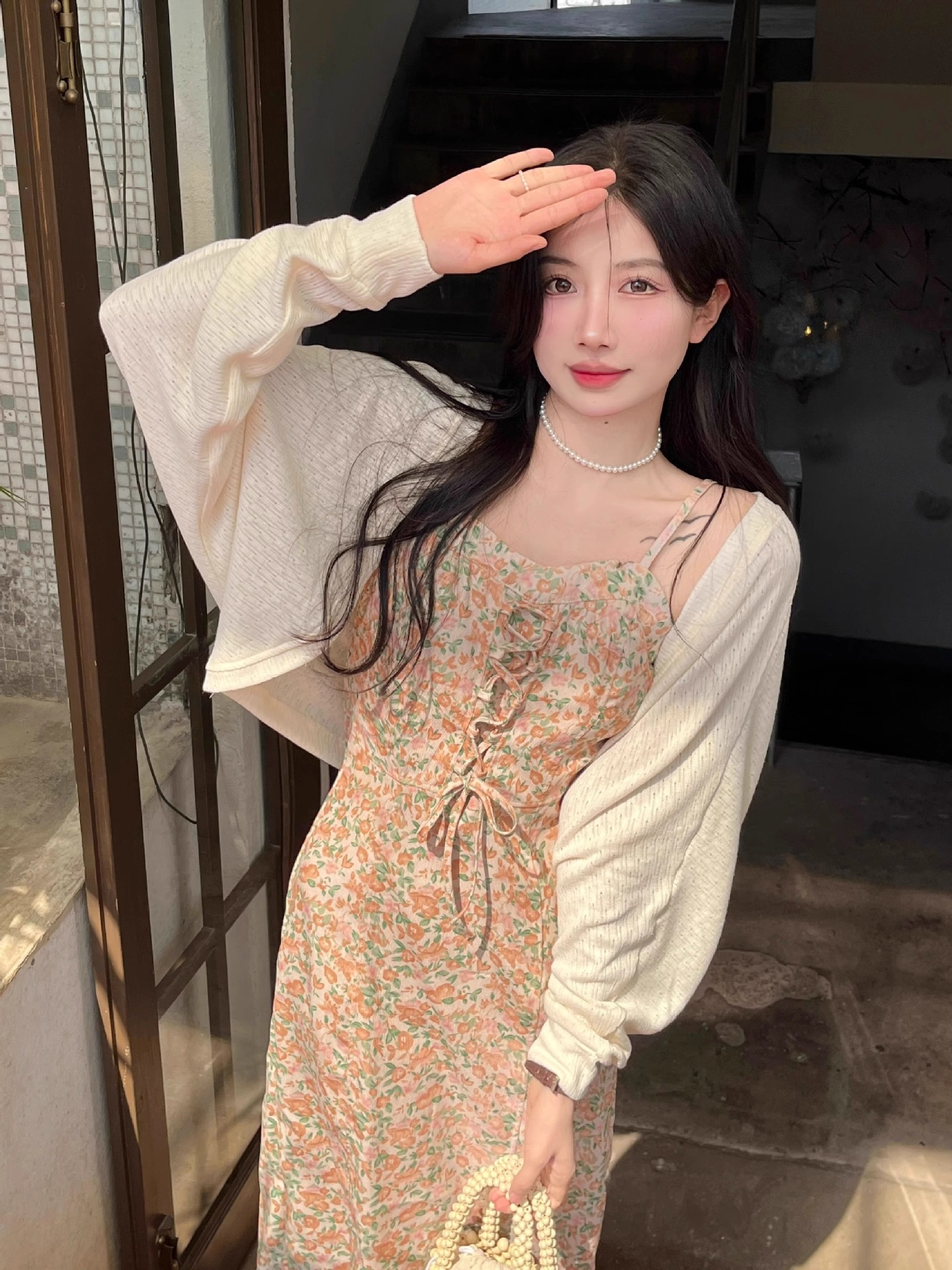 프랑스 우유 살구색 니트 카디건 코트 여성의 봄과 가을 서스펜더 스커트 외부 목도리 배트 윙 슬리브 아이스 실크 태양 보호 셔츠 여름스토어 가기