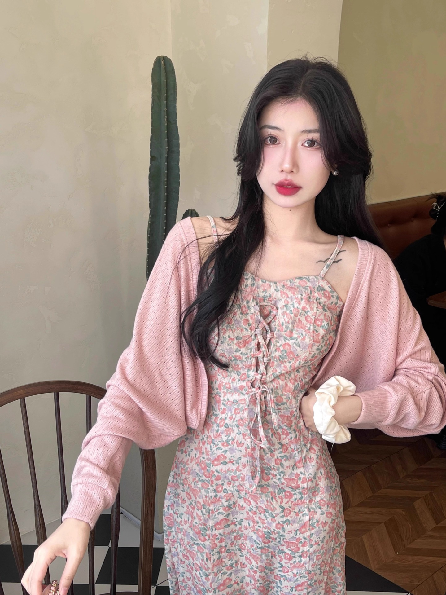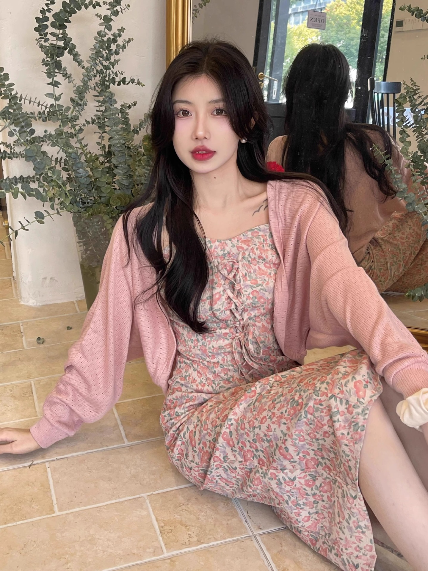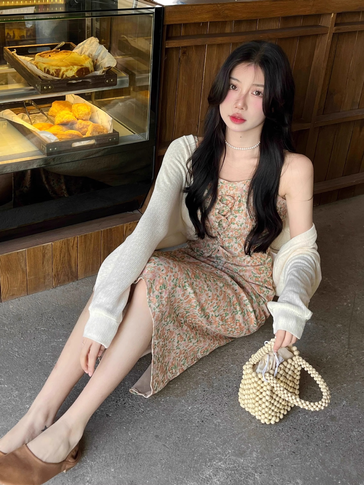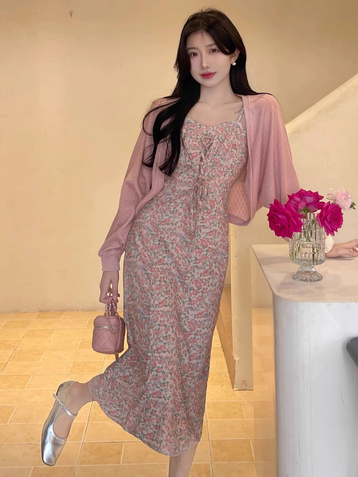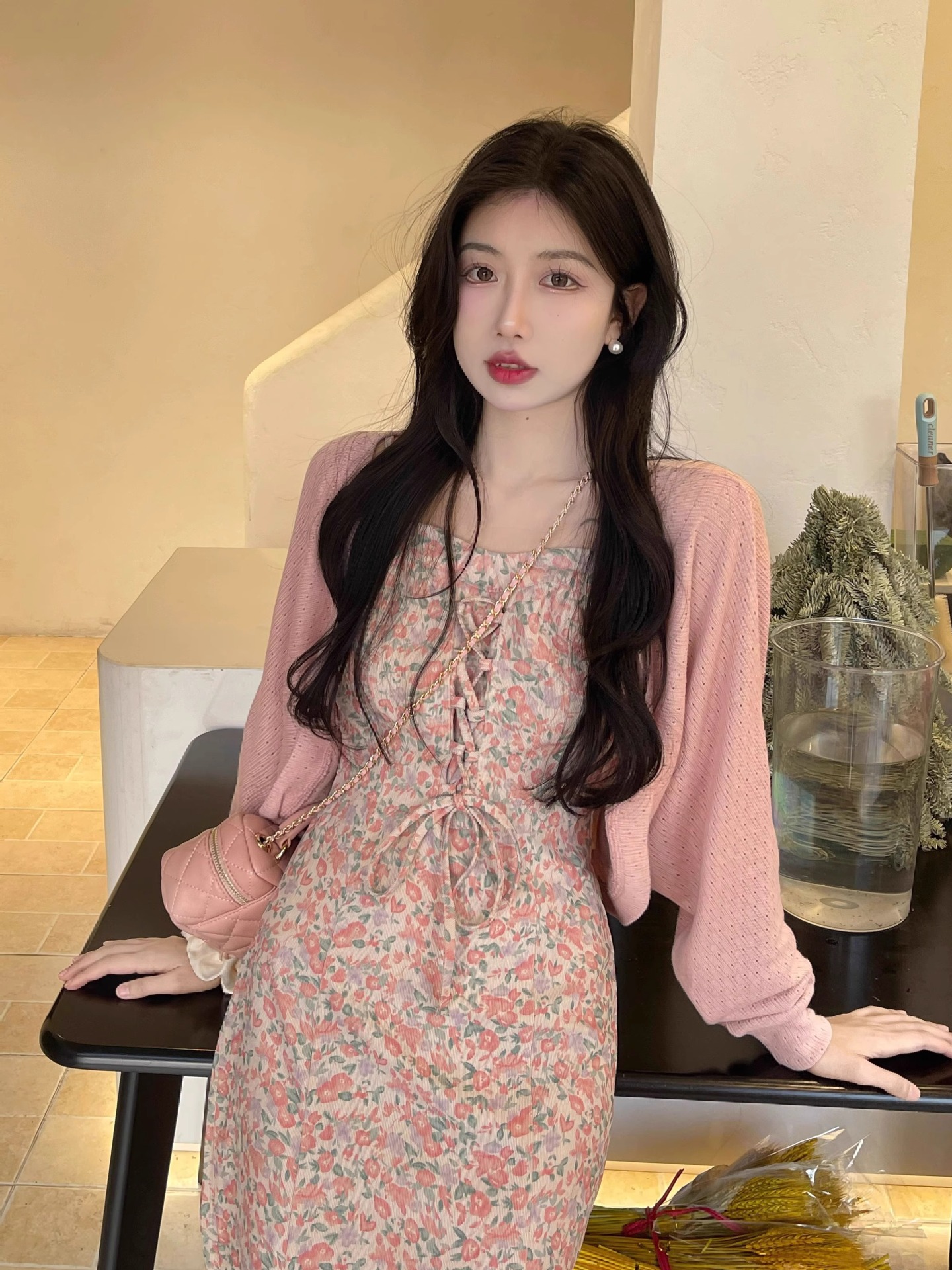 프랑스 우유 살구색 니트 카디건 코트 여성의 봄과 가을 서스펜더 스커트 외부 목도리 배트 윙 슬리브 아이스 실크 태양 보호 셔츠 여름스토어 가기
