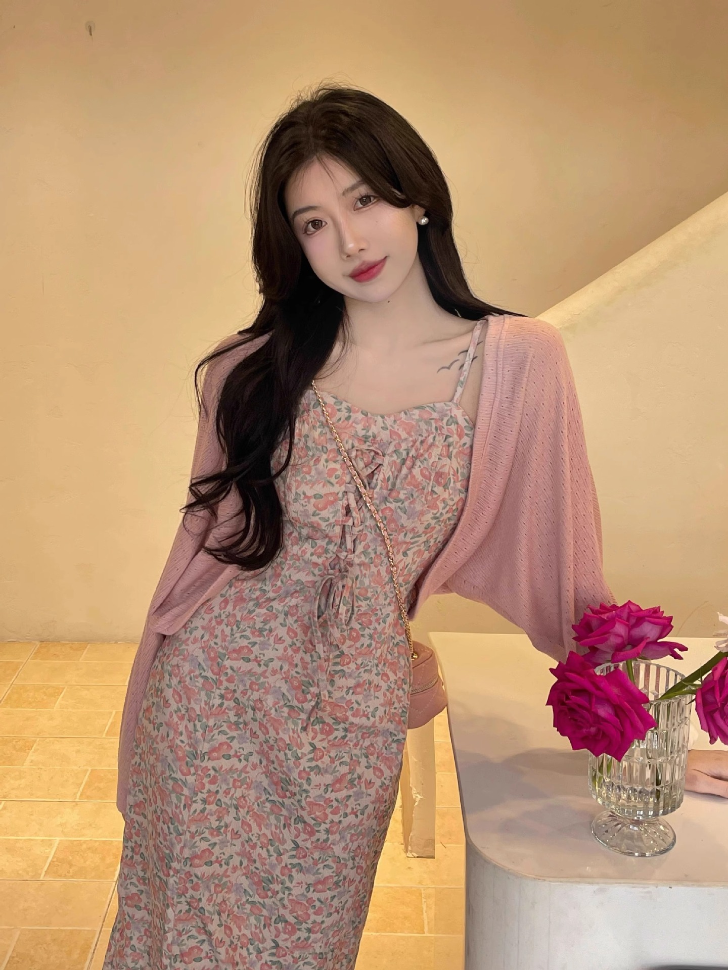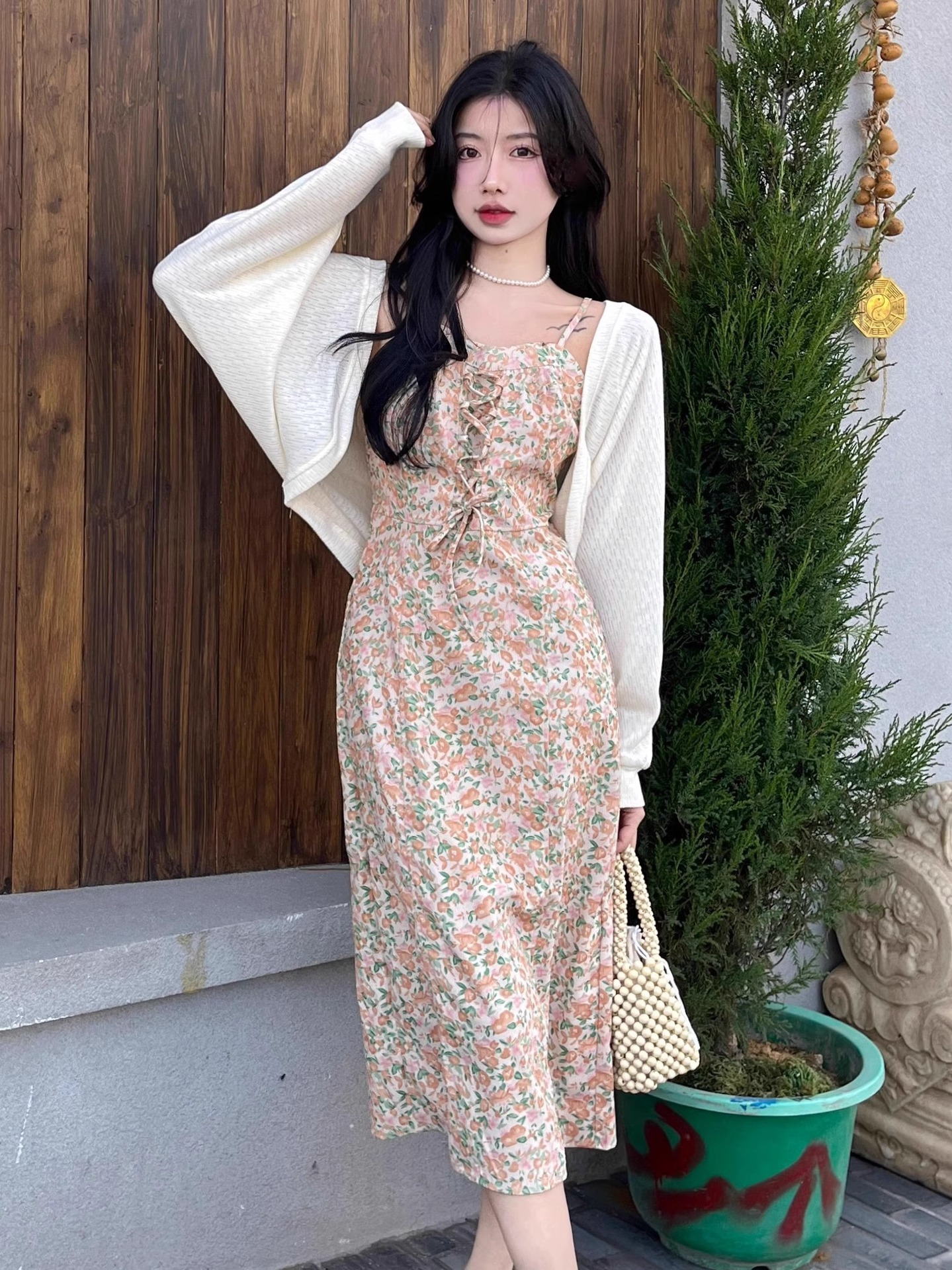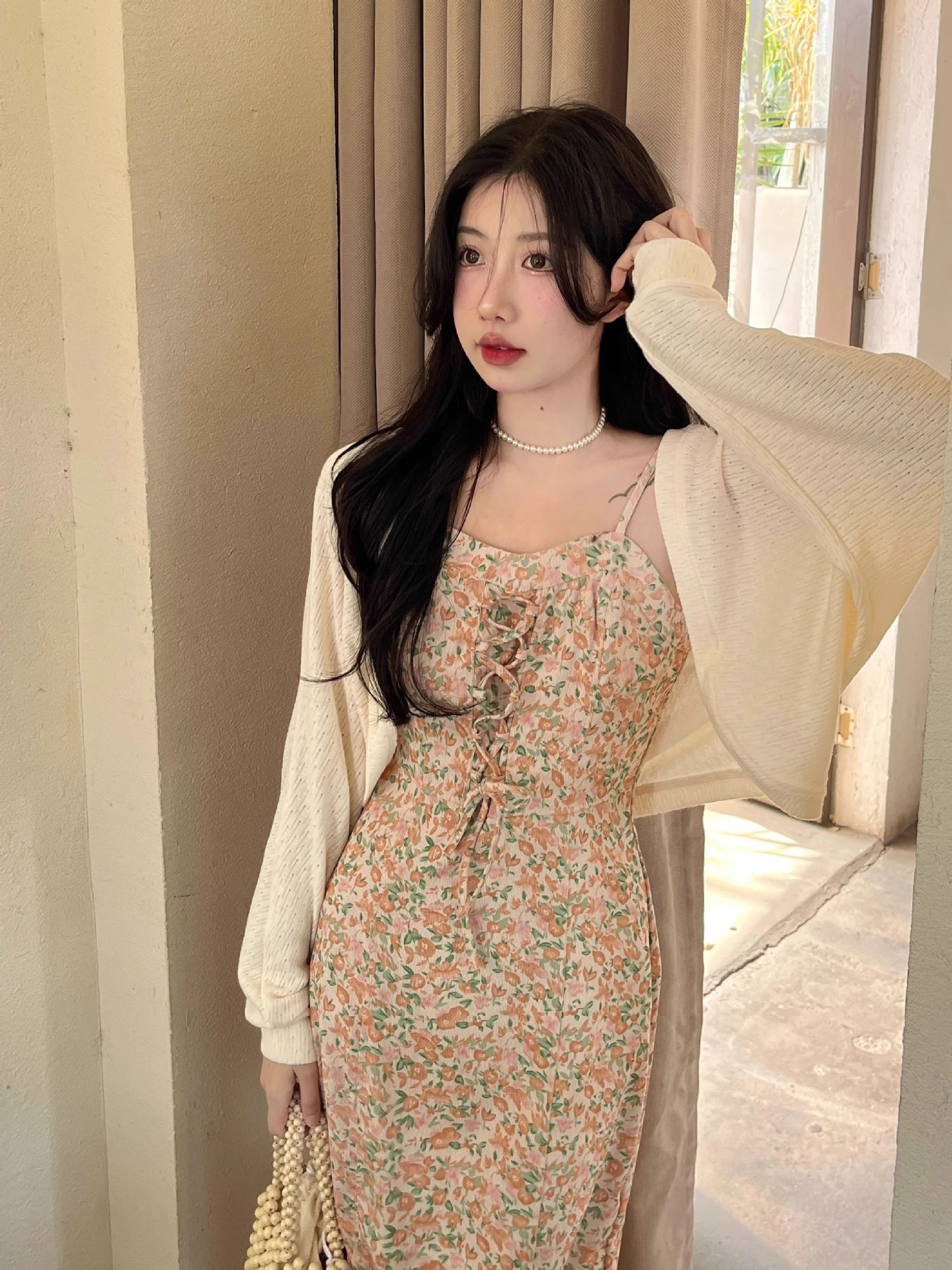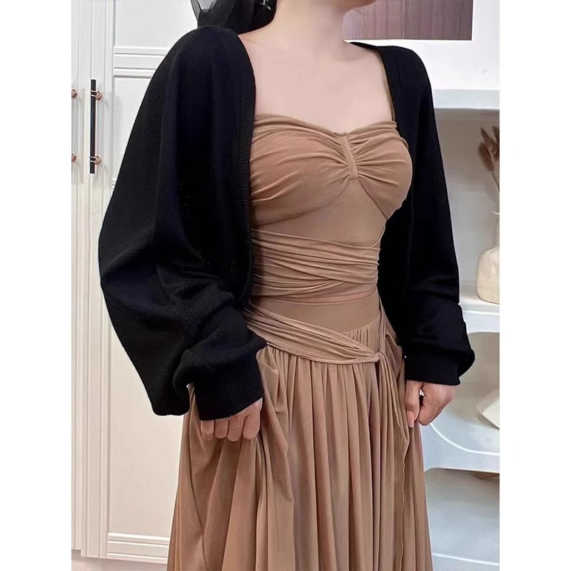 프랑스 우유 살구색 니트 카디건 코트 여성의 봄과 가을 서스펜더 스커트 외부 목도리 배트 윙 슬리브 아이스 실크 태양 보호 셔츠 여름