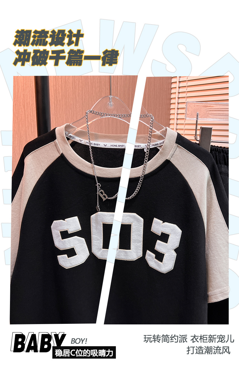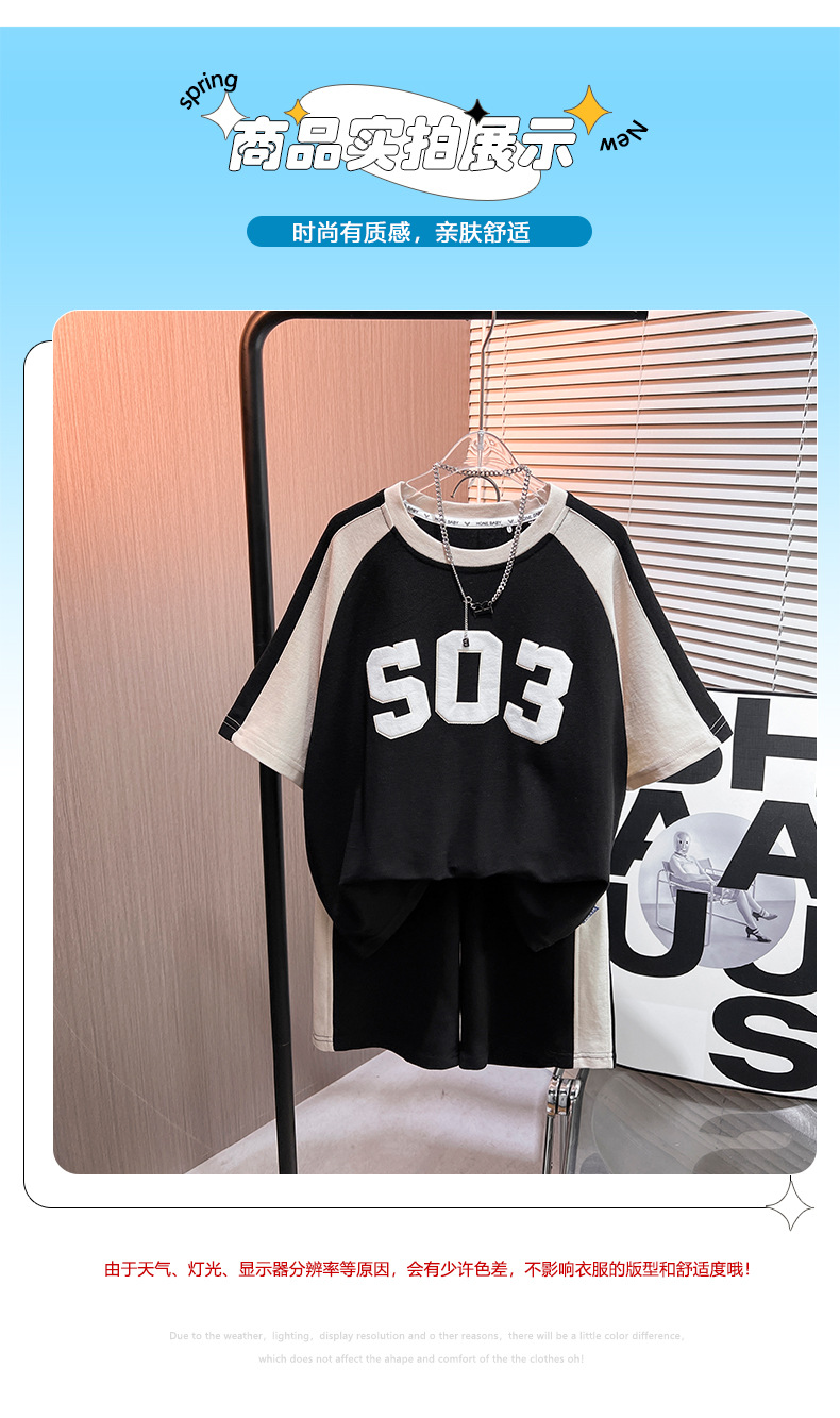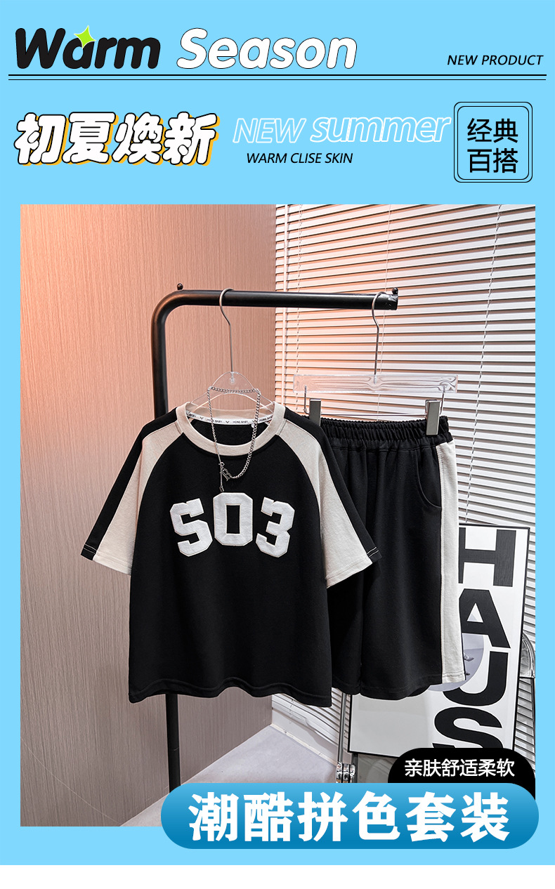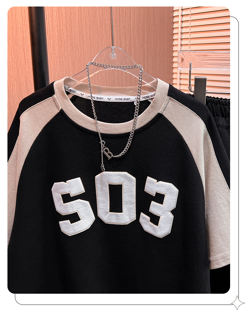 아동복 여름 신상 2026 캐주얼 스포츠 반팔 세트, 중대형 아동용 트렌디한 컬러 블록 라운드넥 티셔츠 투피스 세트스토어 가기