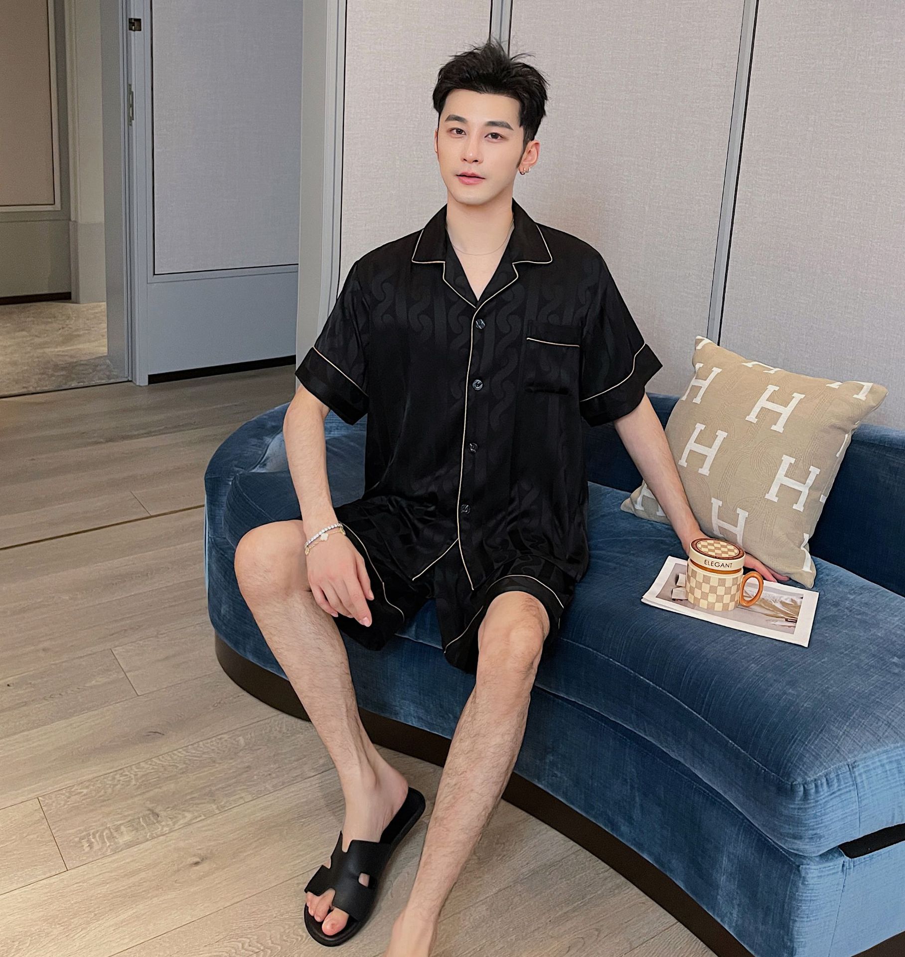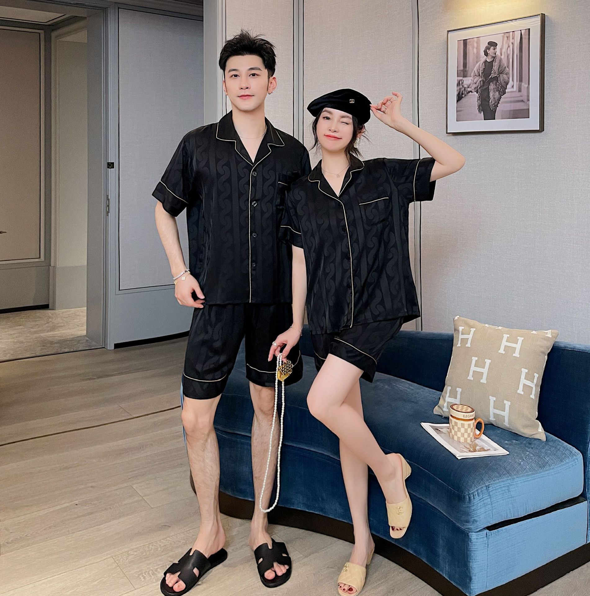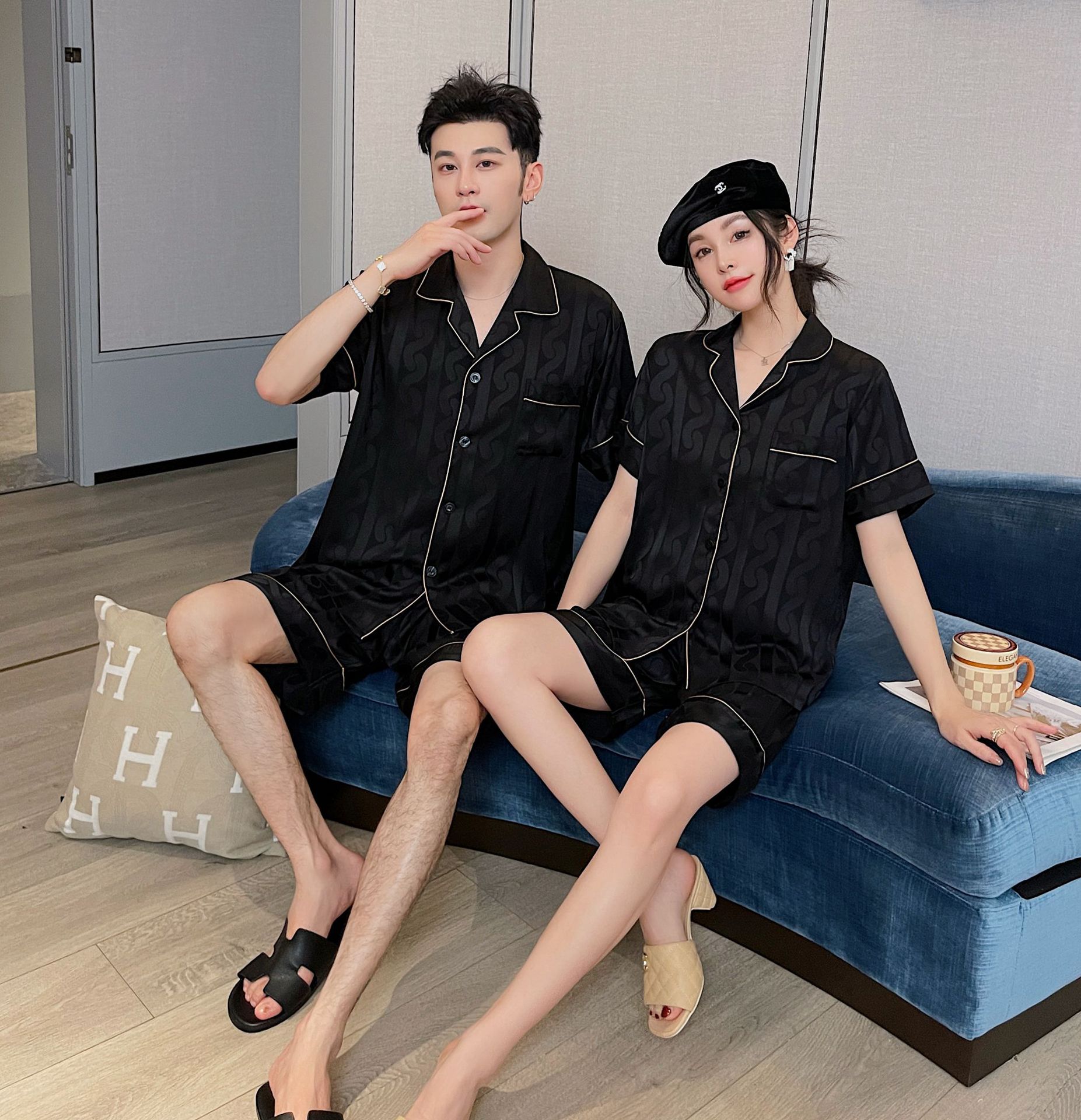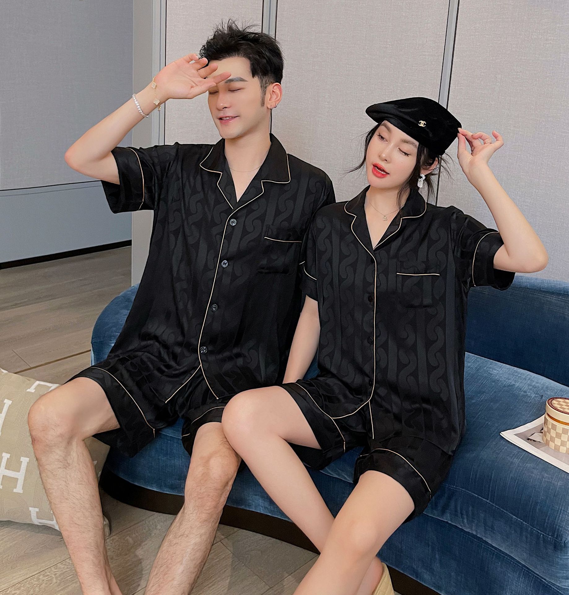 남자 잠옷 아이스 실크 2024 새 홈 착용 고급 인공 실크 여름 얇은 짧은 소매 커플 세트스토어 가기