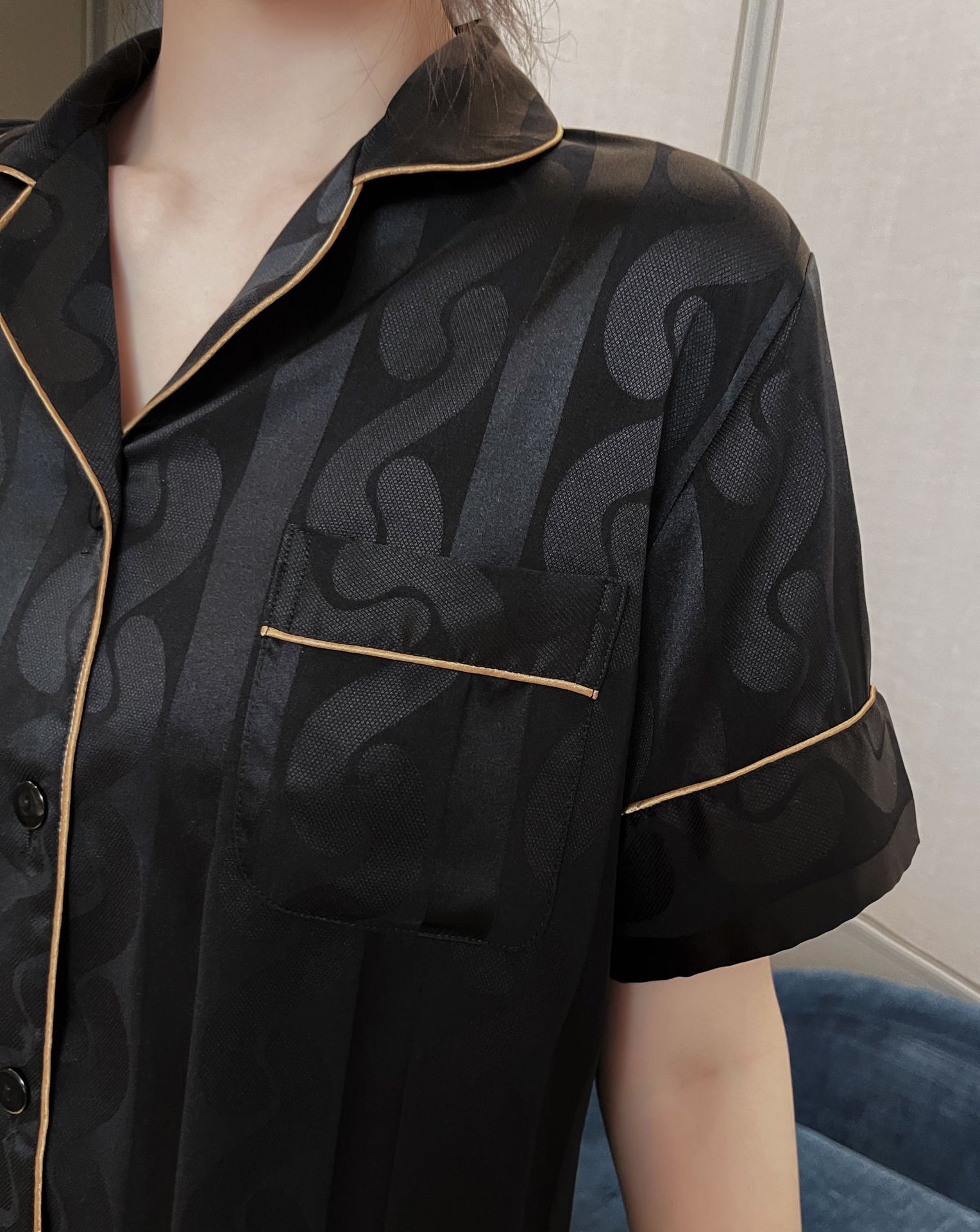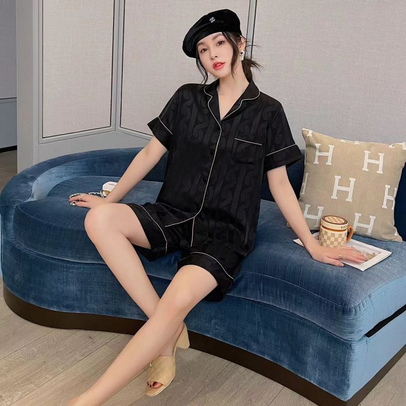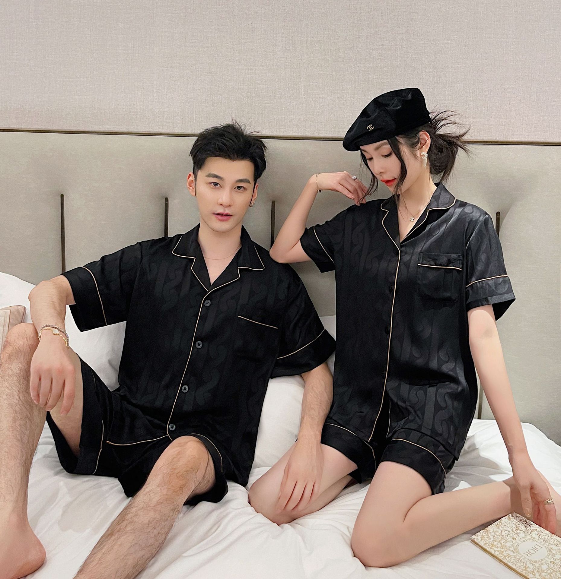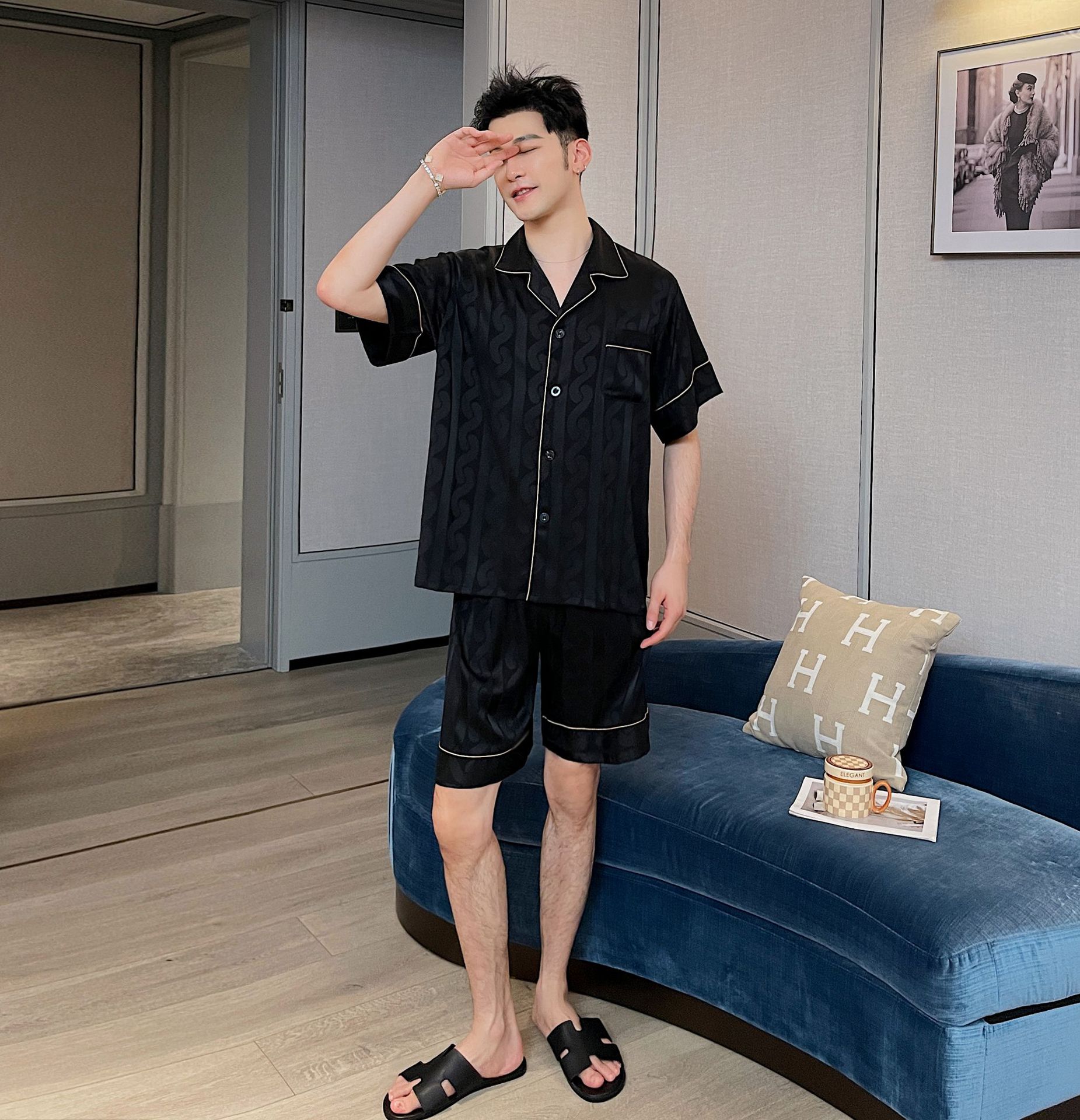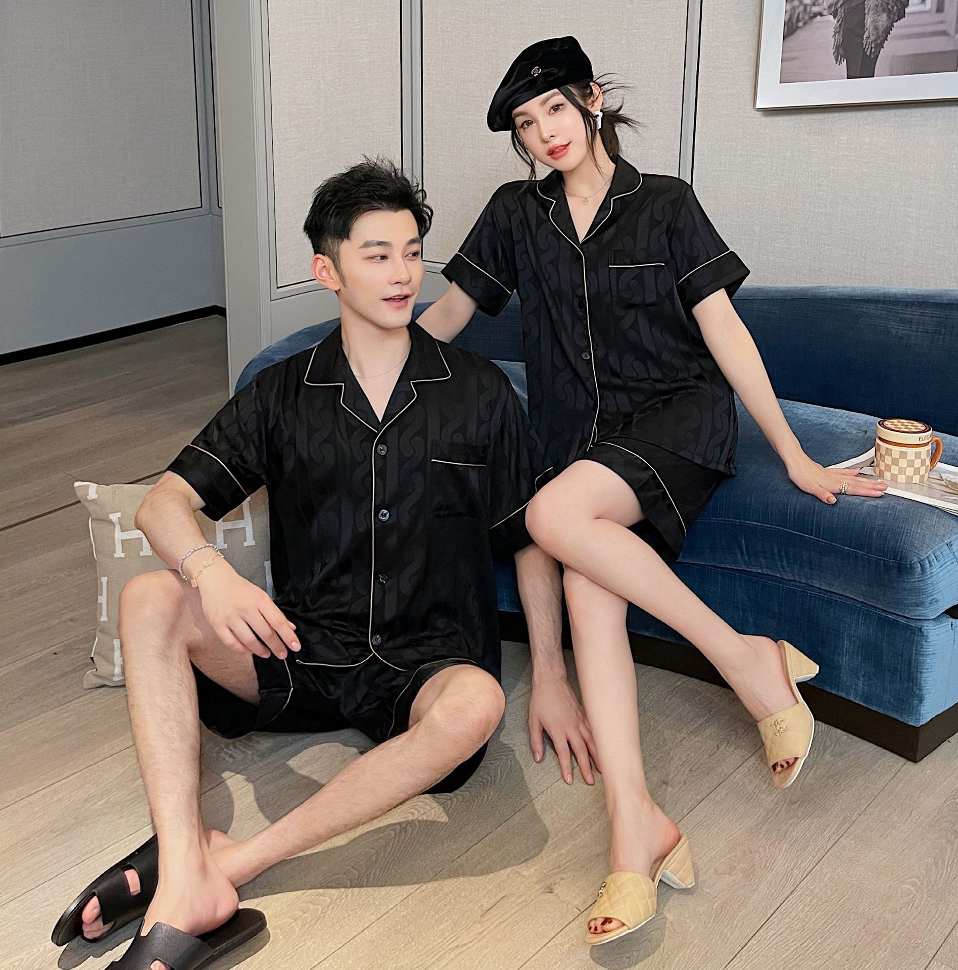 남자 잠옷 아이스 실크 2024 새 홈 착용 고급 인공 실크 여름 얇은 짧은 소매 커플 세트스토어 가기
