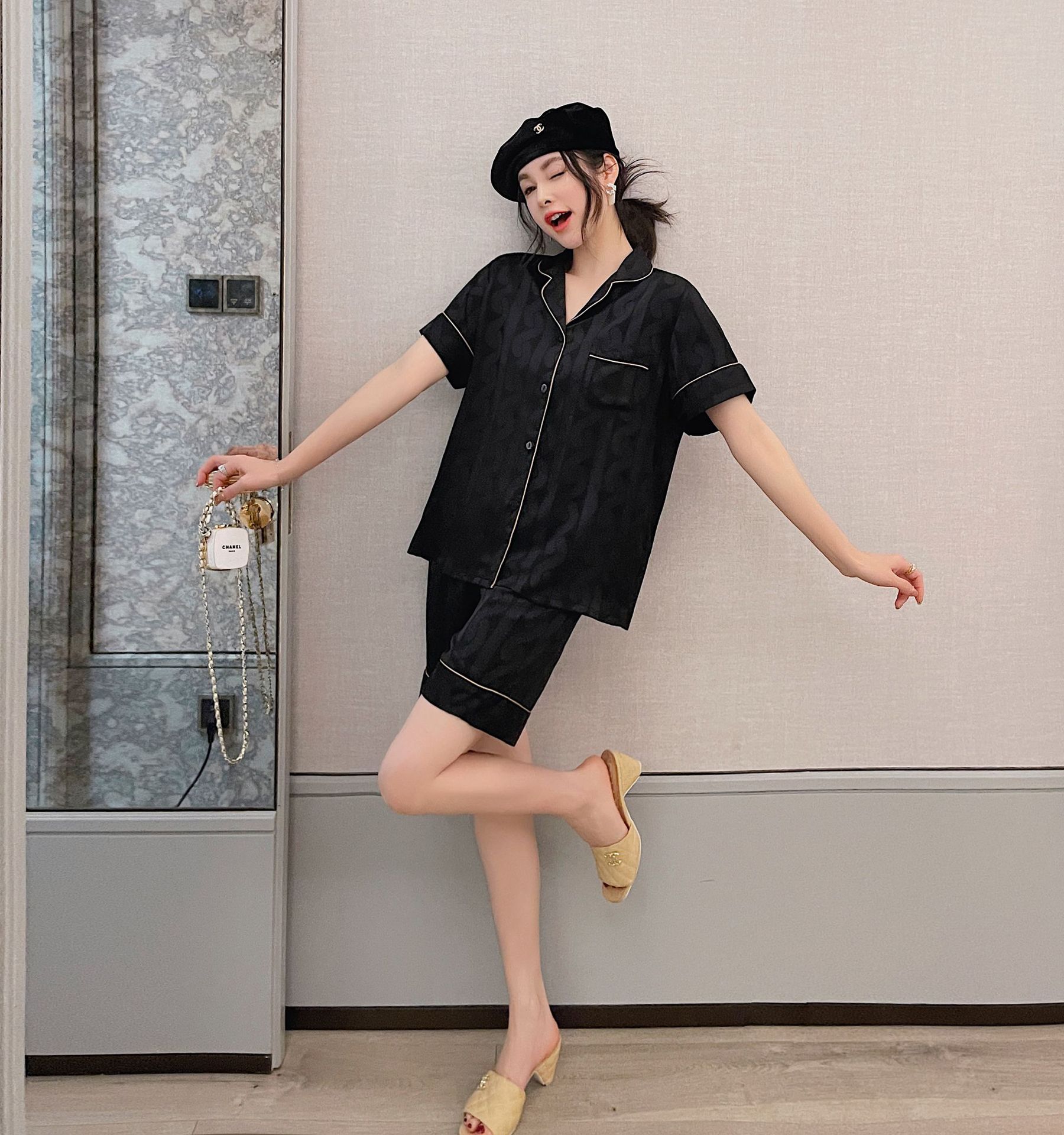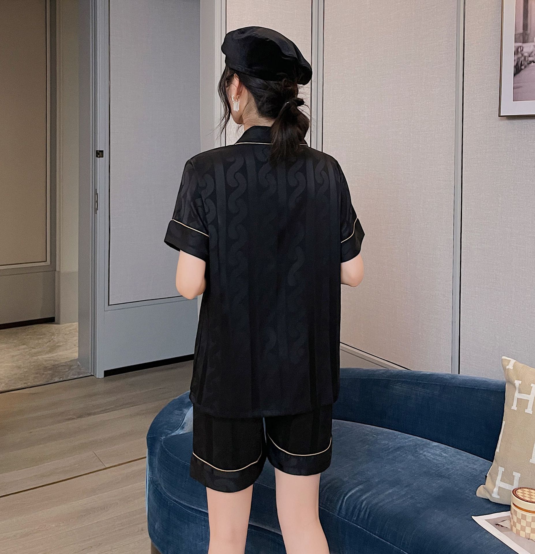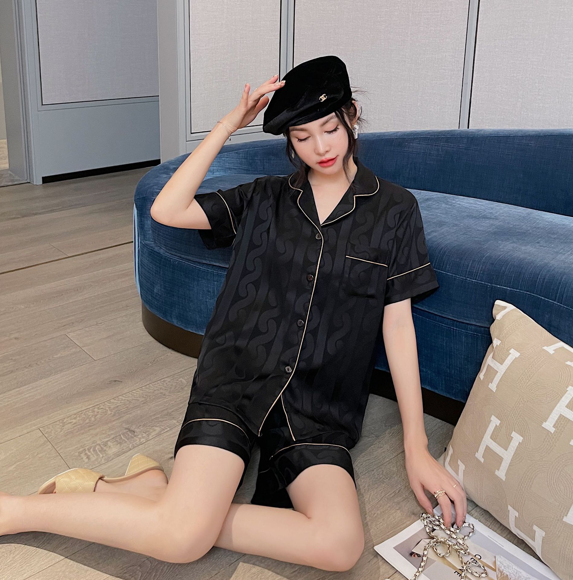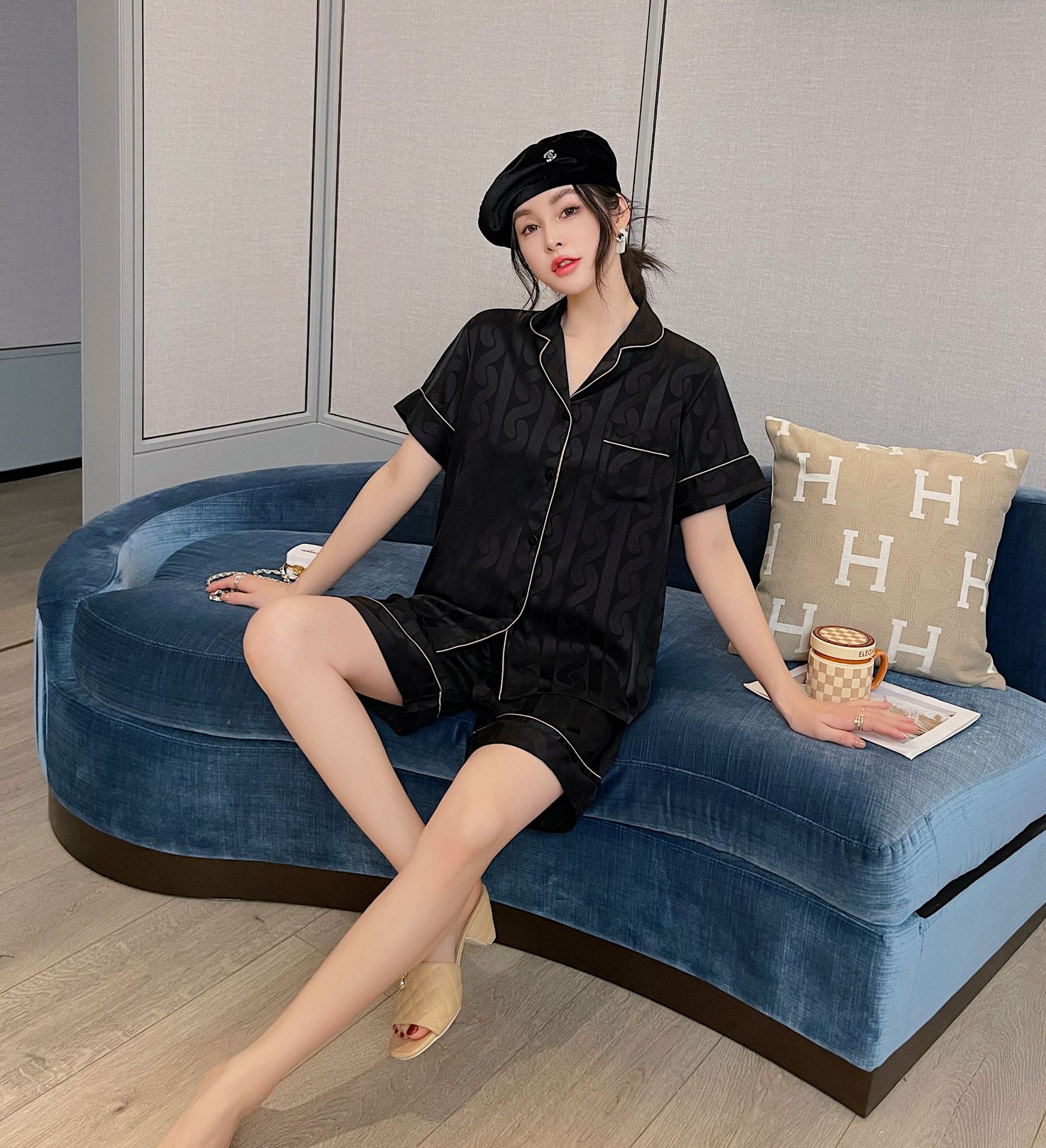 남자 잠옷 아이스 실크 2024 새 홈 착용 고급 인공 실크 여름 얇은 짧은 소매 커플 세트스토어 가기